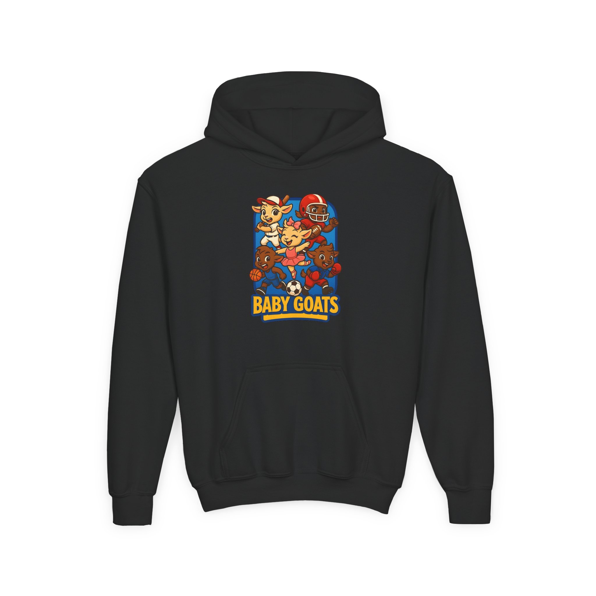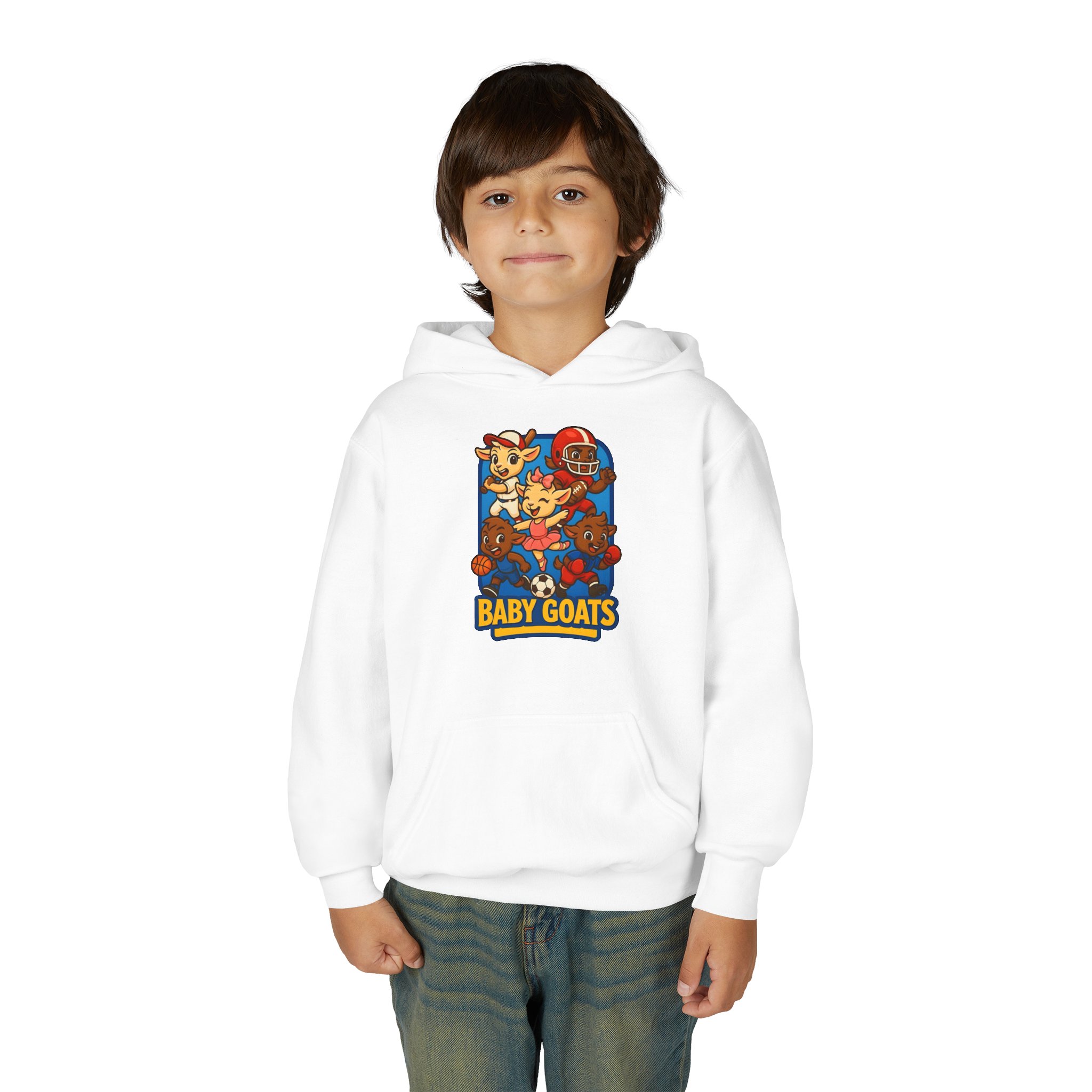 This cozy youth hoodie brings playful energy to chilly days. A midweight blend keeps kids warm without weighing them down, while a soft, twill-lined neck and roomy kangaroo pocket make it comfortable for everyday wear. The front sports a colorful, whimsical “Baby Goats” illustration—cartoon goats in vibrant, retro-inspired colors—that pops against the clean white fabric. Durable DTF wrist prints and optional chest embroidery add lasting detail through washes. Designed to fit true to size, it’s a practical, spirited layer for school, weekend adventures, or relaxed hangouts.