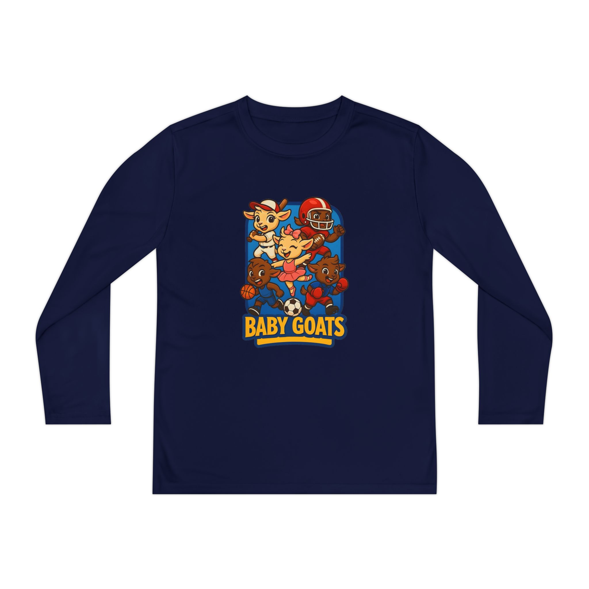 Lightweight and built for movement, this long-sleeve youth shirt brings playful energy to every practice and playground moment. The quick-dry polyester keeps little athletes comfortable when things heat up, while the athletic cut moves with the body so play never feels restricted. A bright, DTF-printed “Baby Goats” graphic adds character—cheerful goats in sporty gear that read as competitive and fun. The extra-light fabric and tear-away label make it easy to layer and comfortable all day, from early drills to after-school hangouts.