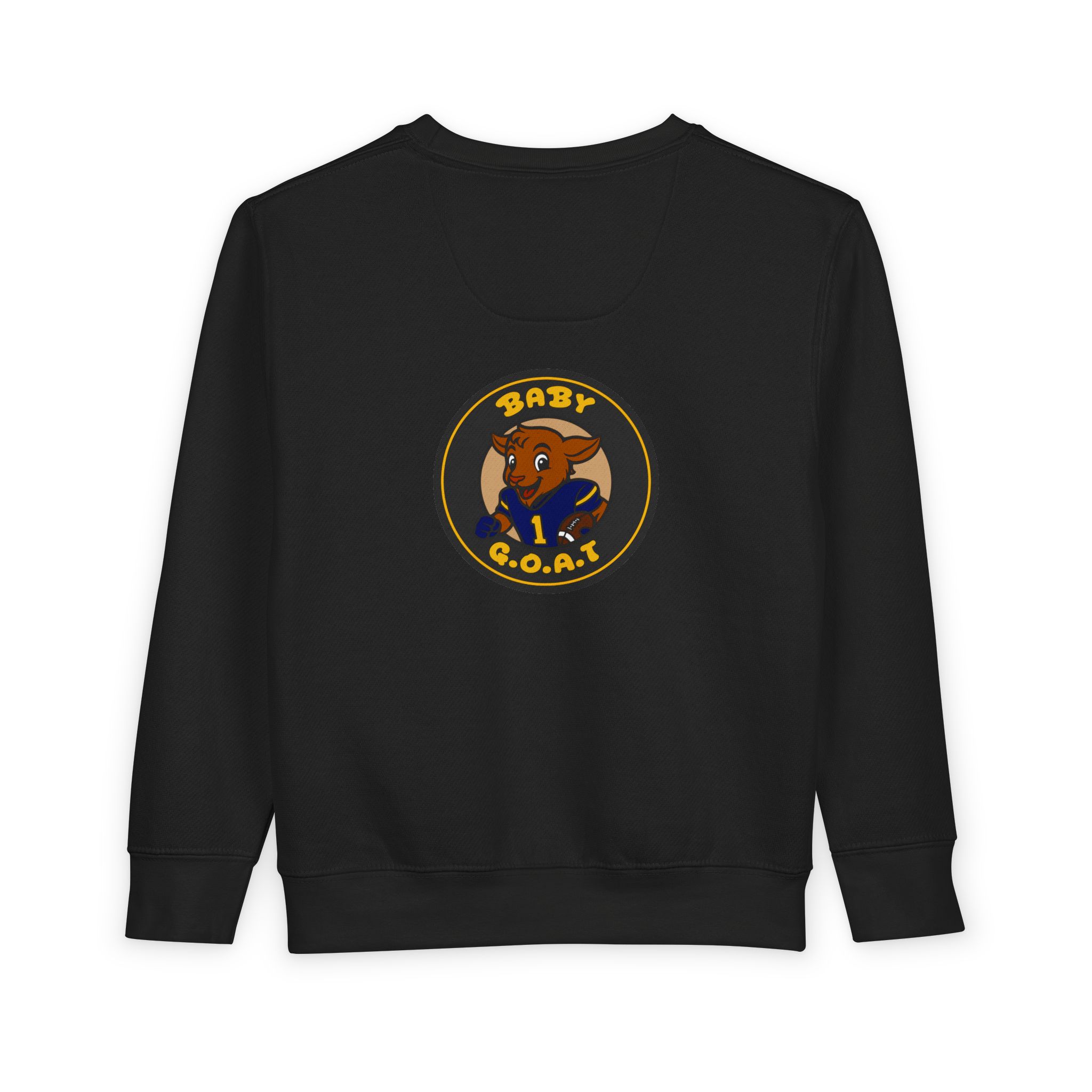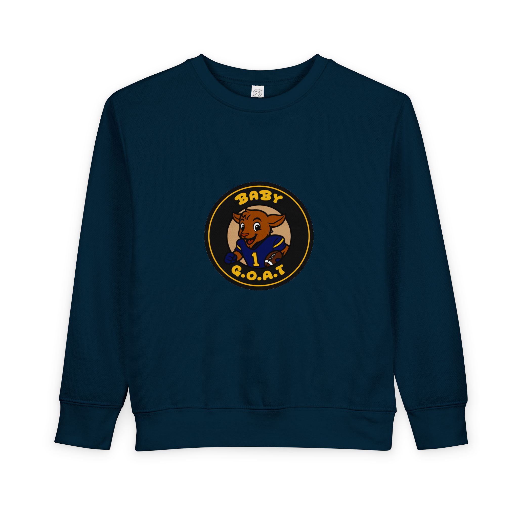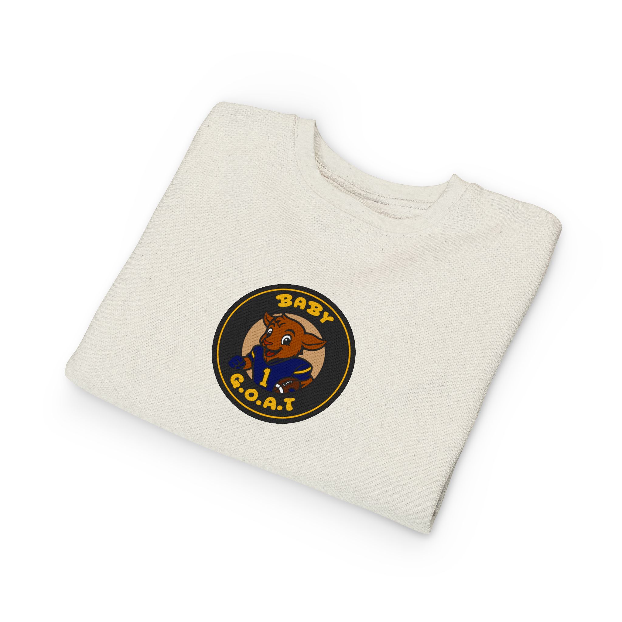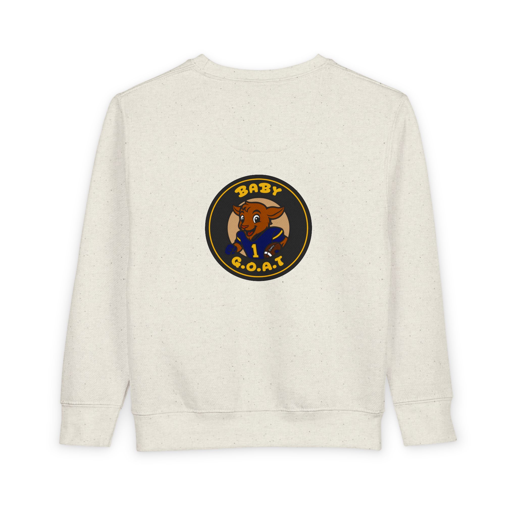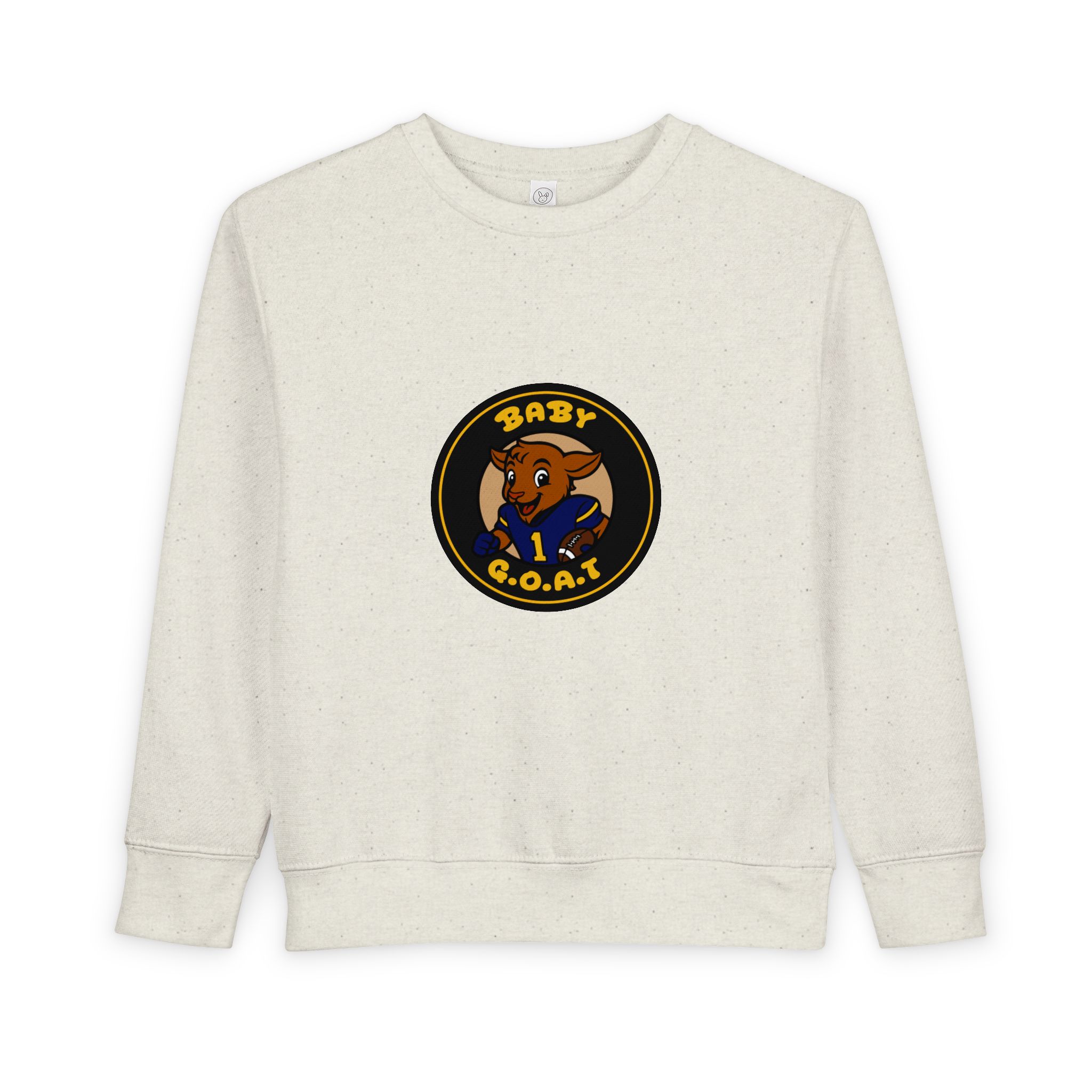 Soft, cozy toddler sweatshirt featuring a playful “Baby G.O.A.T.” badge design. The little goat character brings a touch of cheeky confidence to everyday play—bold colors on a warm, speckled natural heather ground. Lightweight but sturdy, it layers easily over tees or under jackets for playground days, family outings, or casual photos. The tear-away label and gentle ribbed cuffs keep squirmy toddlers comfortable, while durable coverstitching stands up to repeated washes. It reads like a tiny statement piece for spirited kids who love to stand out and make caregivers smile.