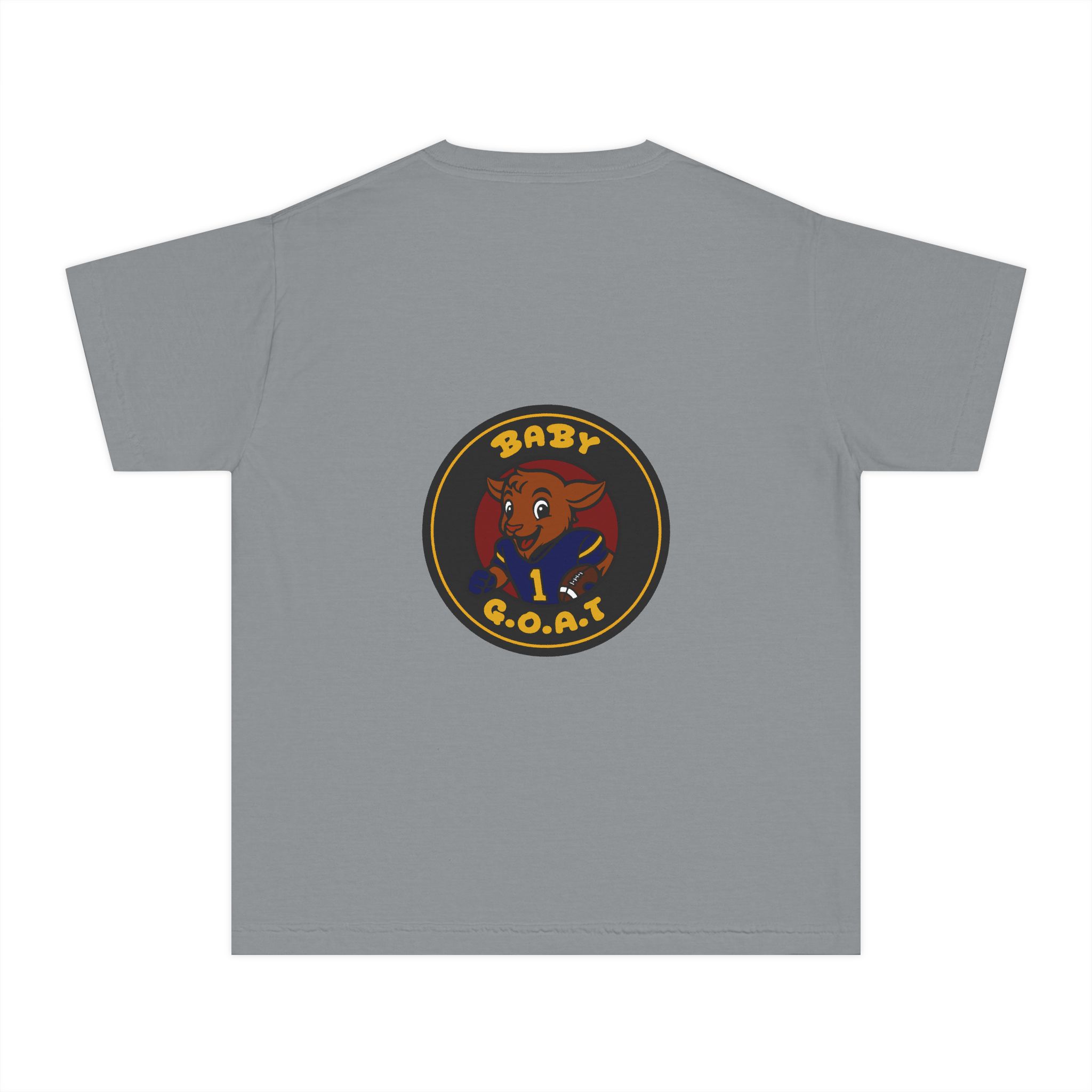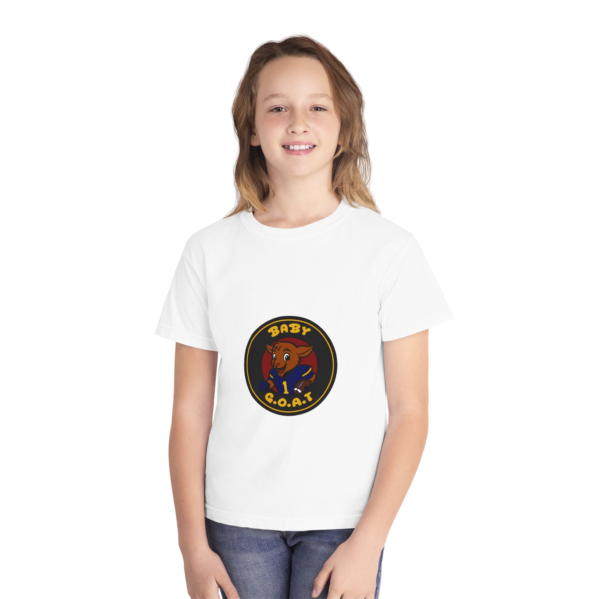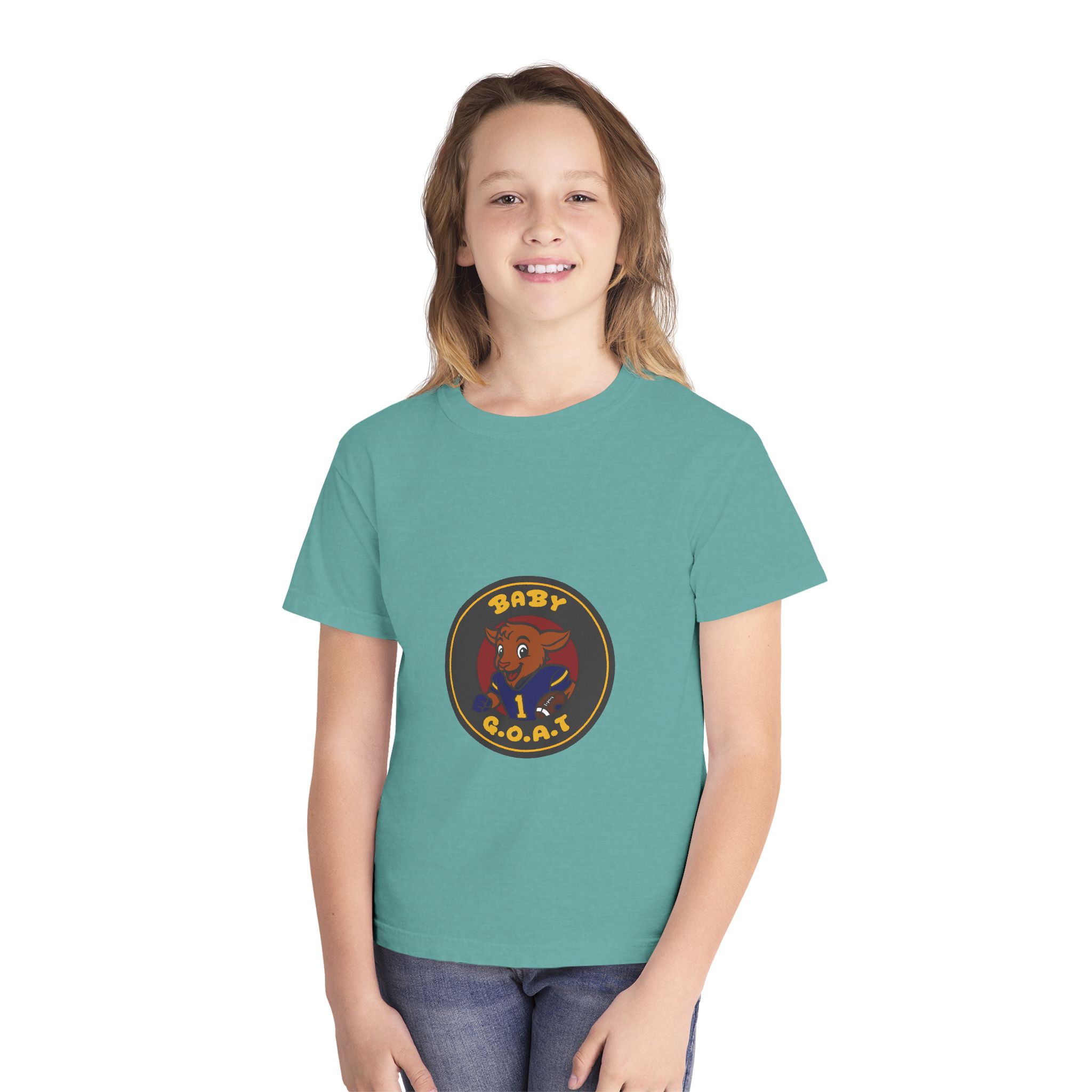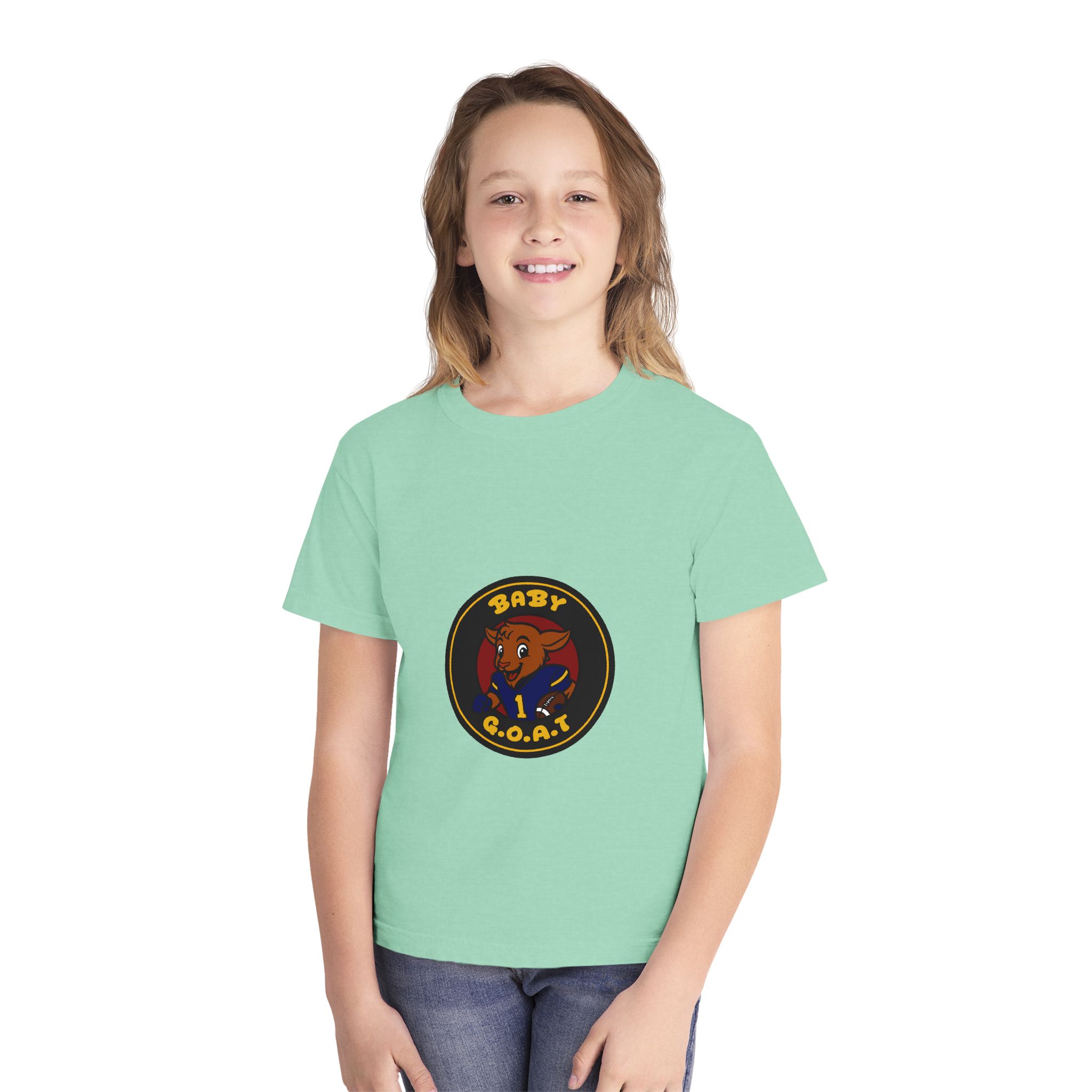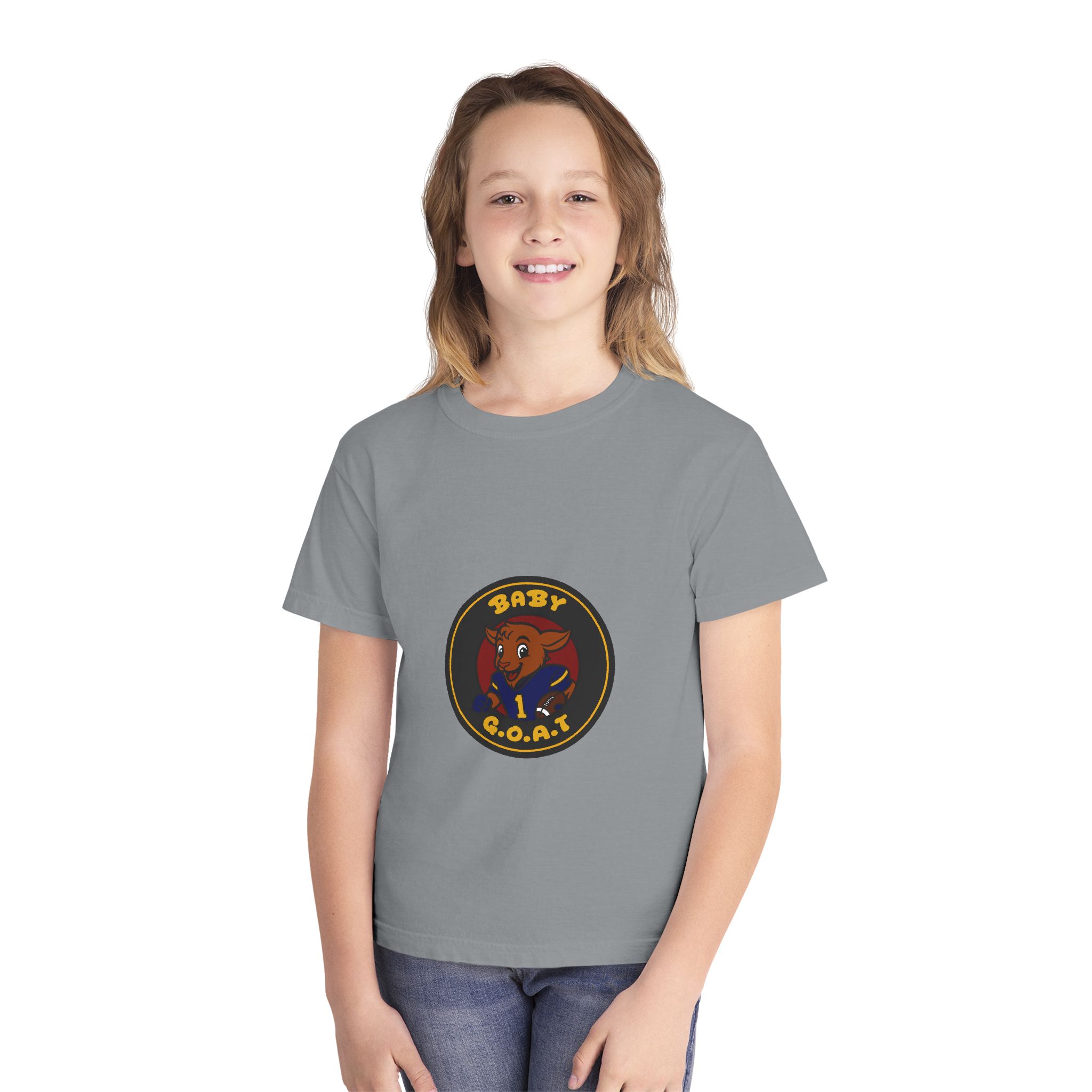 A soft, midweight youth tee that brings playful swagger to everyday wear. The garment-dyed cotton gives the shirt a lived-in texture while the bold, circular “Baby G.O.A.T.” badge — featuring a confident baby goat in a jersey — sits centered on front and back for a cheeky, athletic vibe. Classic fit and reinforced seams keep this tee comfortable and durable for active kids who like to stand out. It layers easily under jackets or wears solo for park days, team warm-ups, or relaxed weekends.