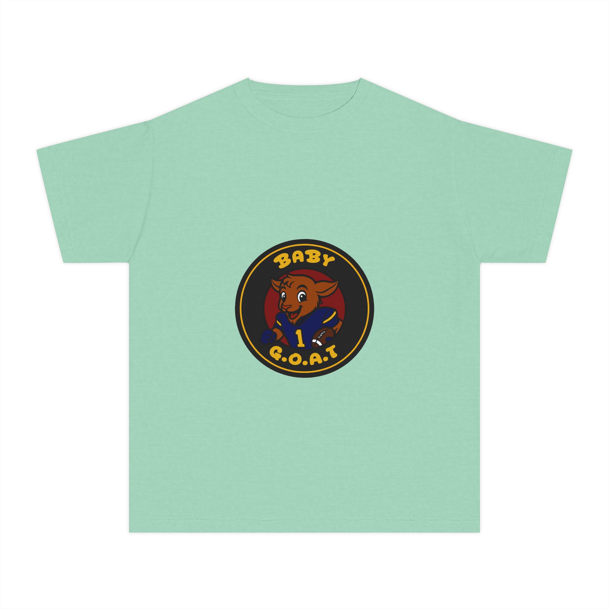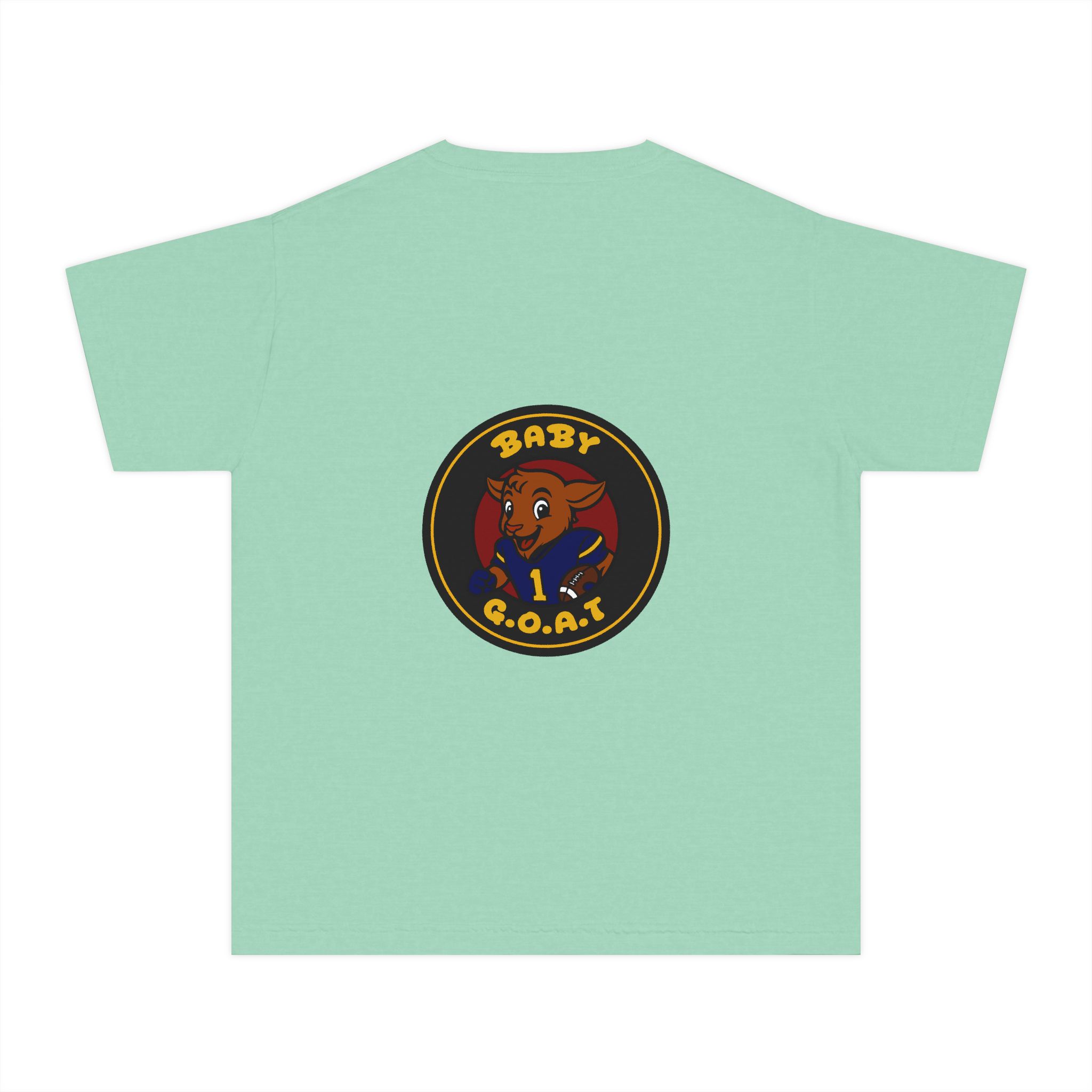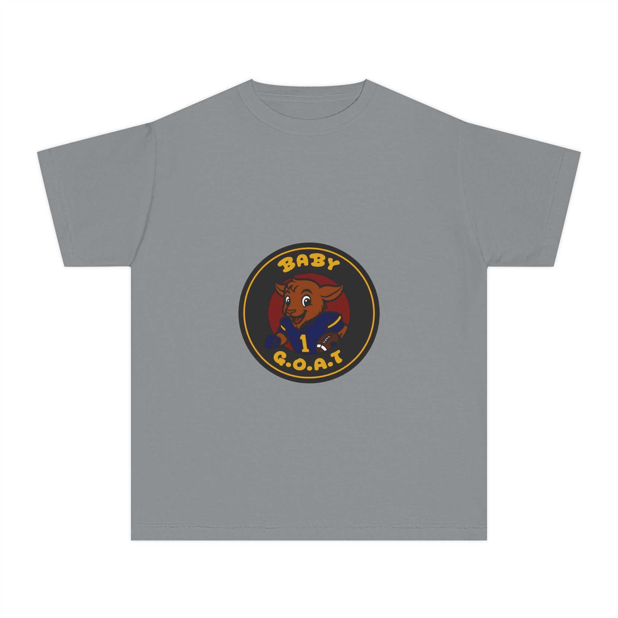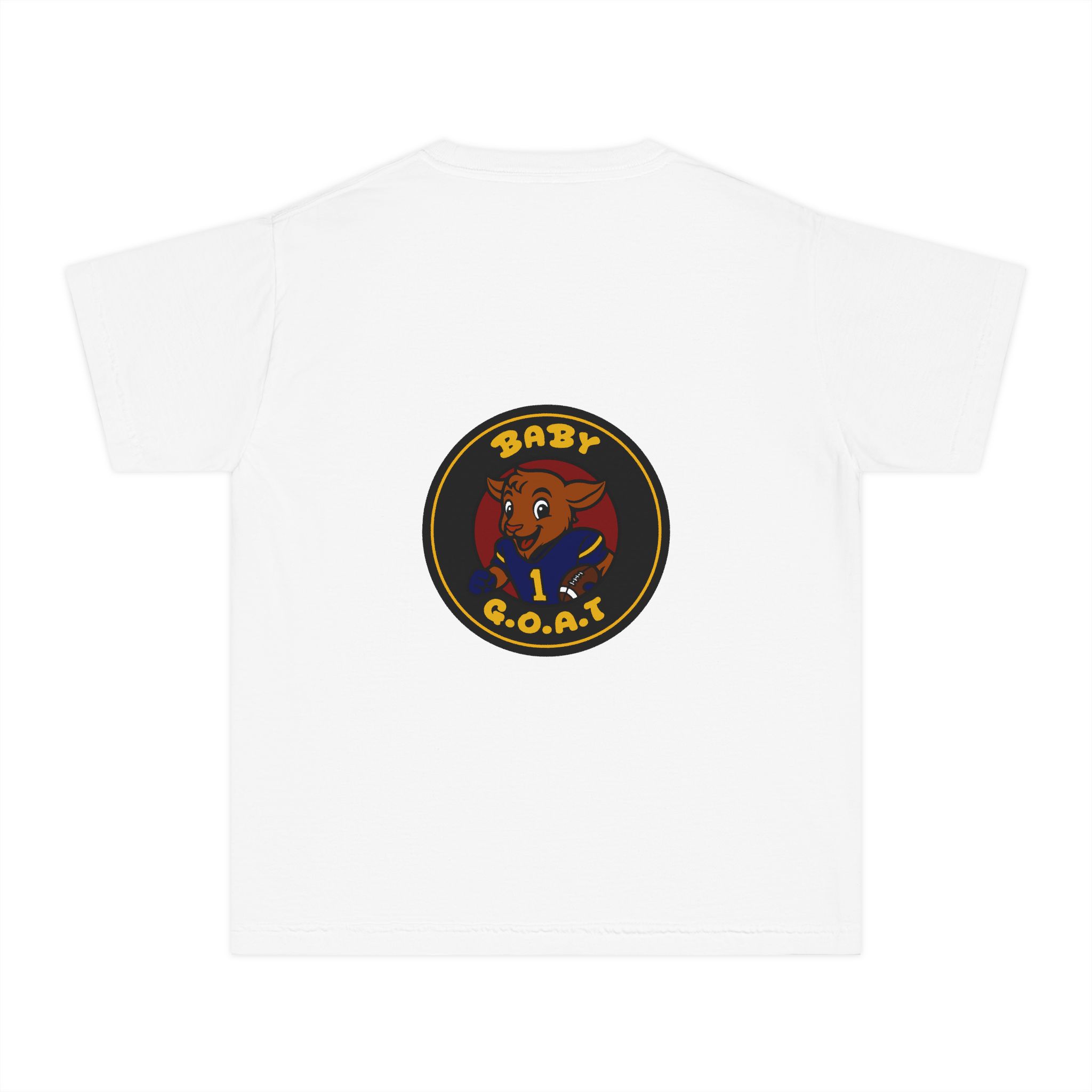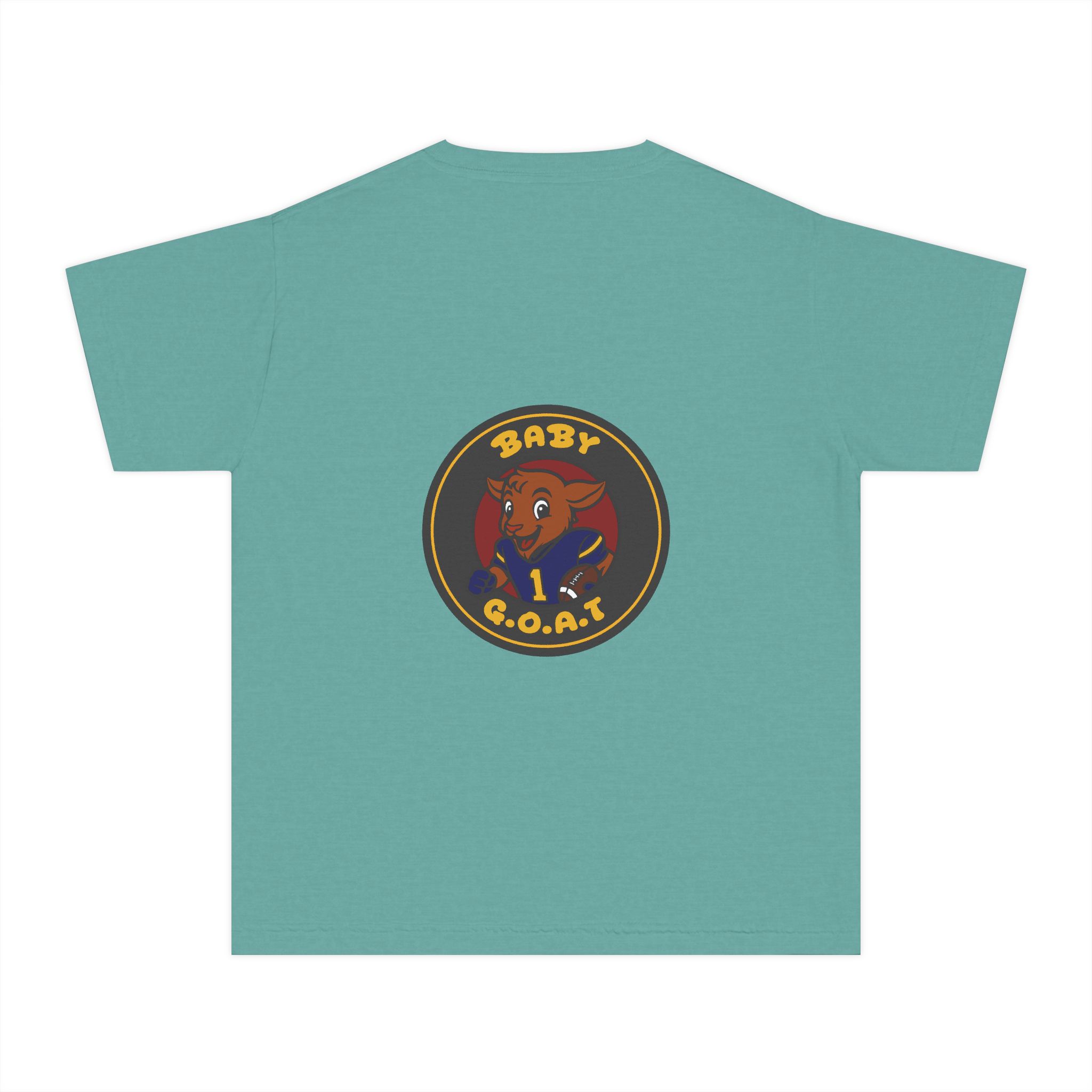 A soft, midweight youth tee that brings playful swagger to everyday wear. The garment-dyed cotton gives the shirt a lived-in texture while the bold, circular “Baby G.O.A.T.” badge — featuring a confident baby goat in a jersey — sits centered on front and back for a cheeky, athletic vibe. Classic fit and reinforced seams keep this tee comfortable and durable for active kids who like to stand out. It layers easily under jackets or wears solo for park days, team warm-ups, or relaxed weekends.