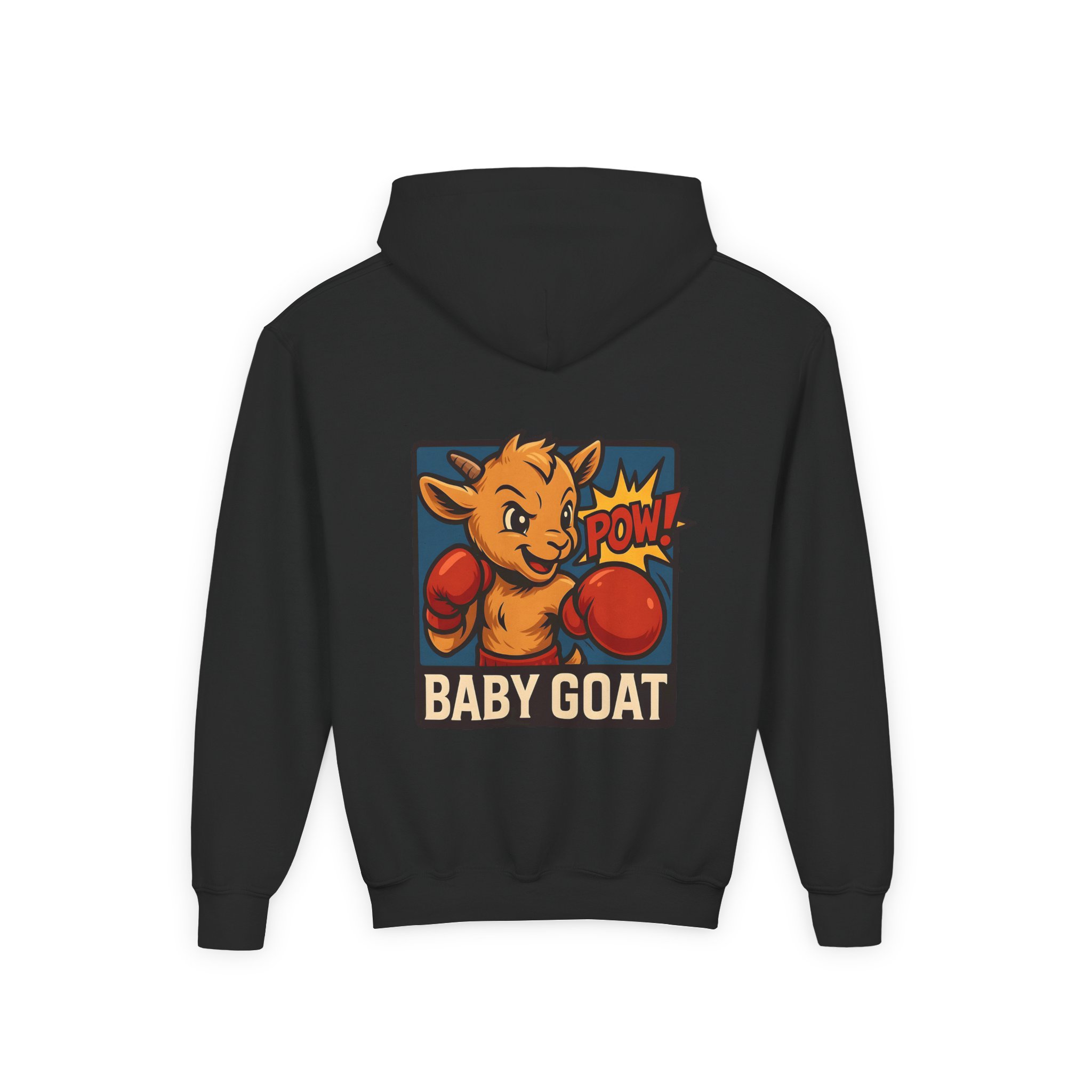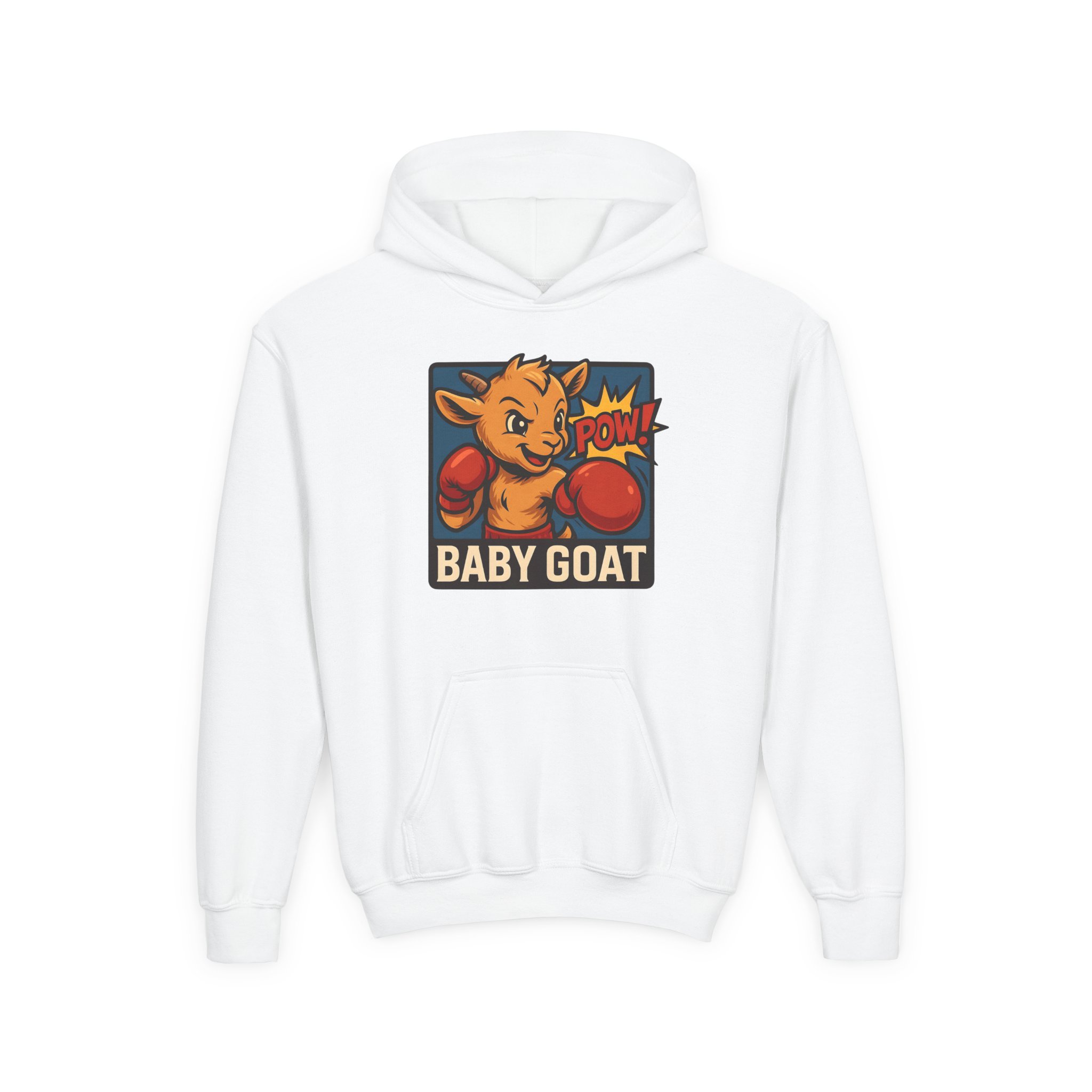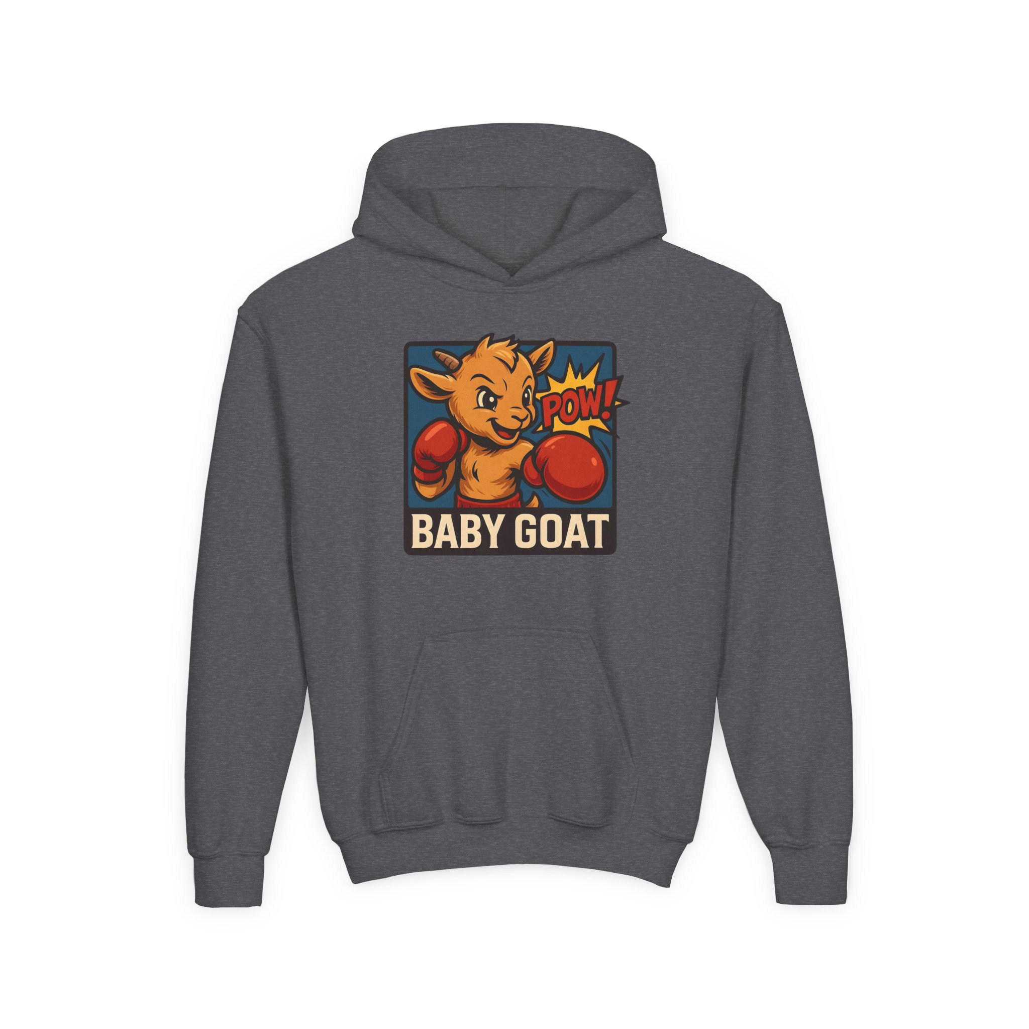 A cozy youth hoodie featuring a bold, playful “Baby Goat” boxing graphic that brings big personality to little wardrobes. The image—bright, punchy colors and retro-comic energy—sits center front (and back in mockups), turning an everyday sweatshirt into a statement piece for kids who love to stand out. The midweight fabric feels substantial without being bulky; the roomy kangaroo pocket keeps hands warm and small treasures close. Thoughtful details like twill necktape and a sewn-in label add durability and comfort through rough-and-tumble play. Whether worn to school, a weekend outing, or during crafty indoor adventures, this hoodie adds a wink of humor and a boost of confidence to a child’s look.