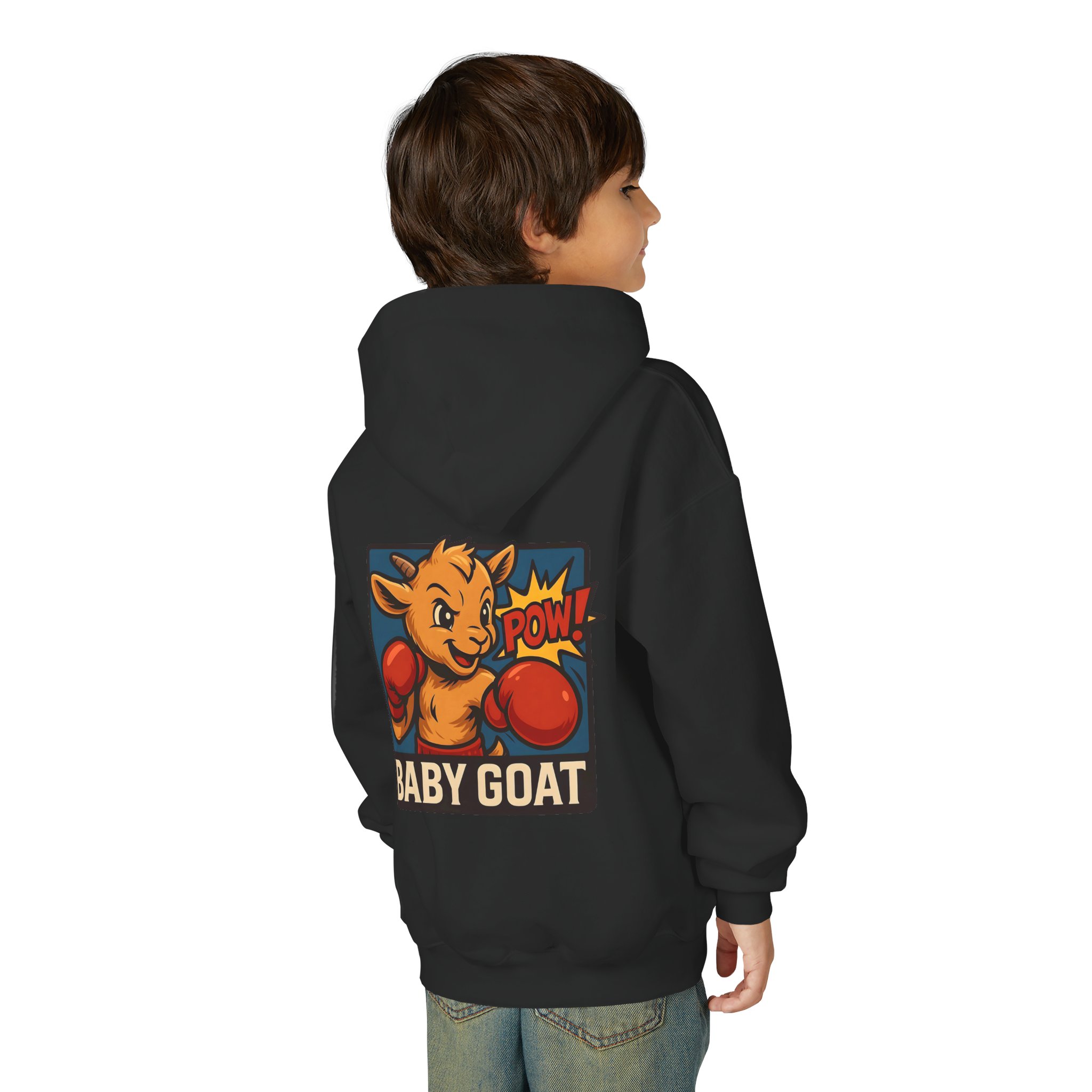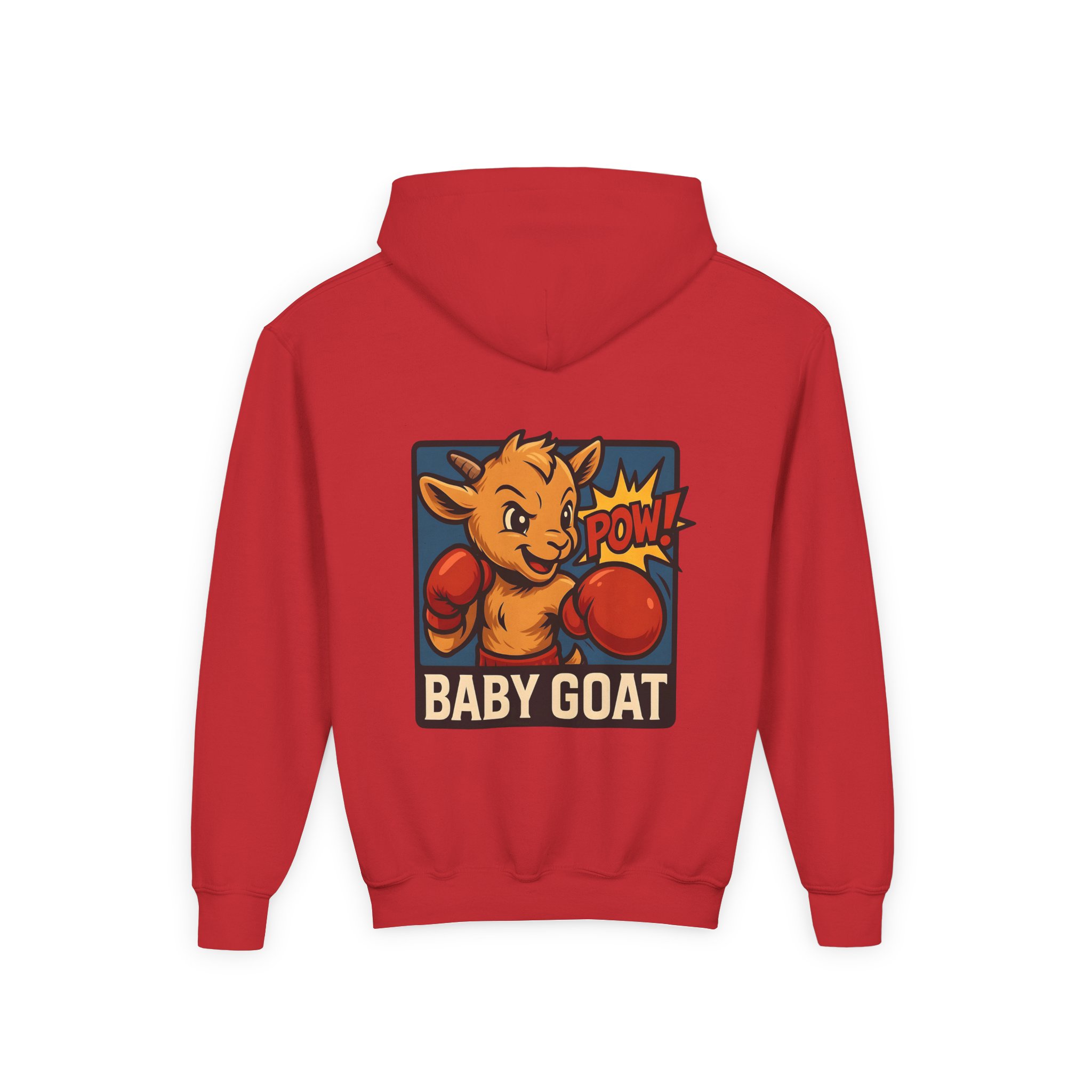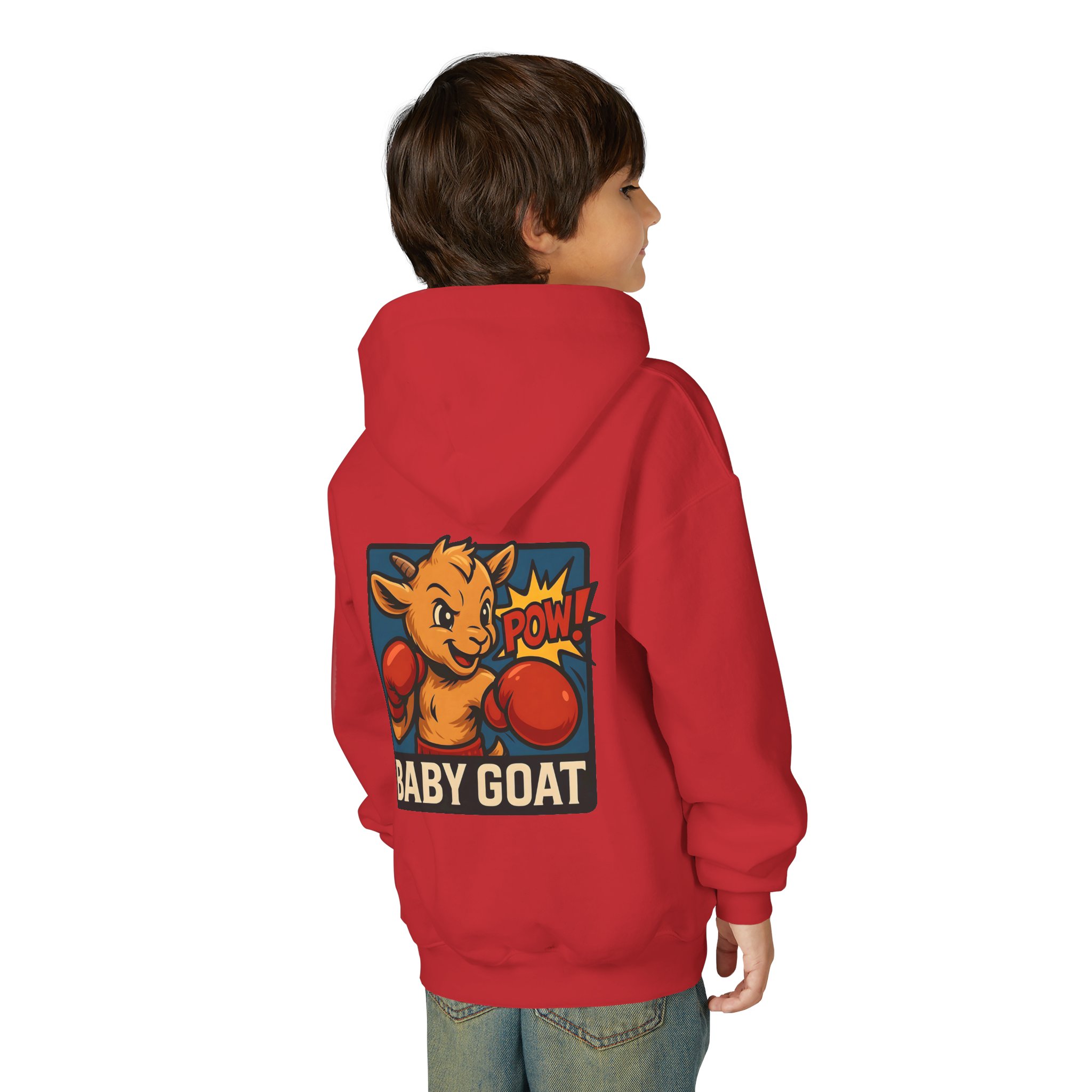 A cozy youth hoodie featuring a bold, playful “Baby Goat” boxing graphic that brings big personality to little wardrobes. The image—bright, punchy colors and retro-comic energy—sits center front (and back in mockups), turning an everyday sweatshirt into a statement piece for kids who love to stand out. The midweight fabric feels substantial without being bulky; the roomy kangaroo pocket keeps hands warm and small treasures close. Thoughtful details like twill necktape and a sewn-in label add durability and comfort through rough-and-tumble play. Whether worn to school, a weekend outing, or during crafty indoor adventures, this hoodie adds a wink of humor and a boost of confidence to a child’s look.