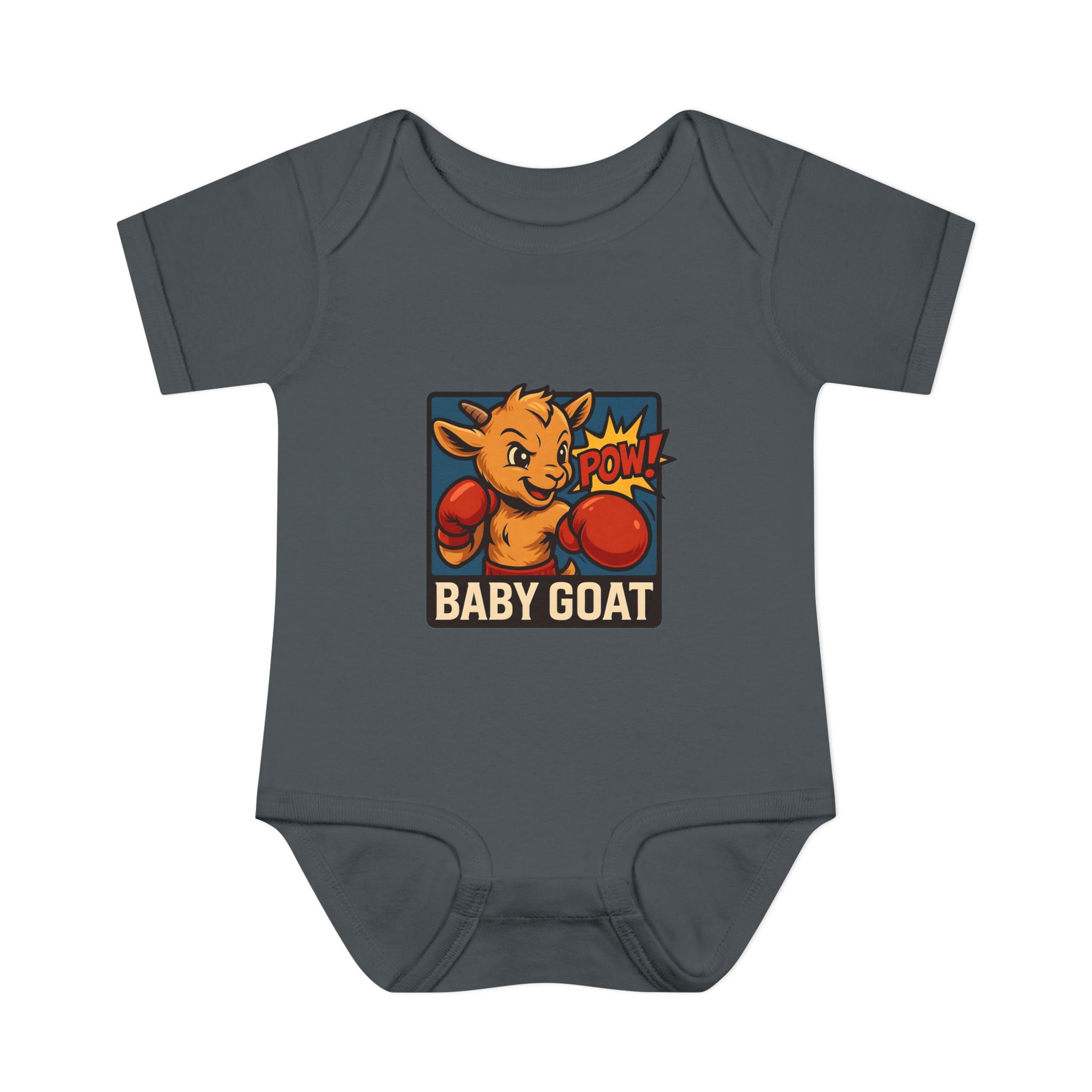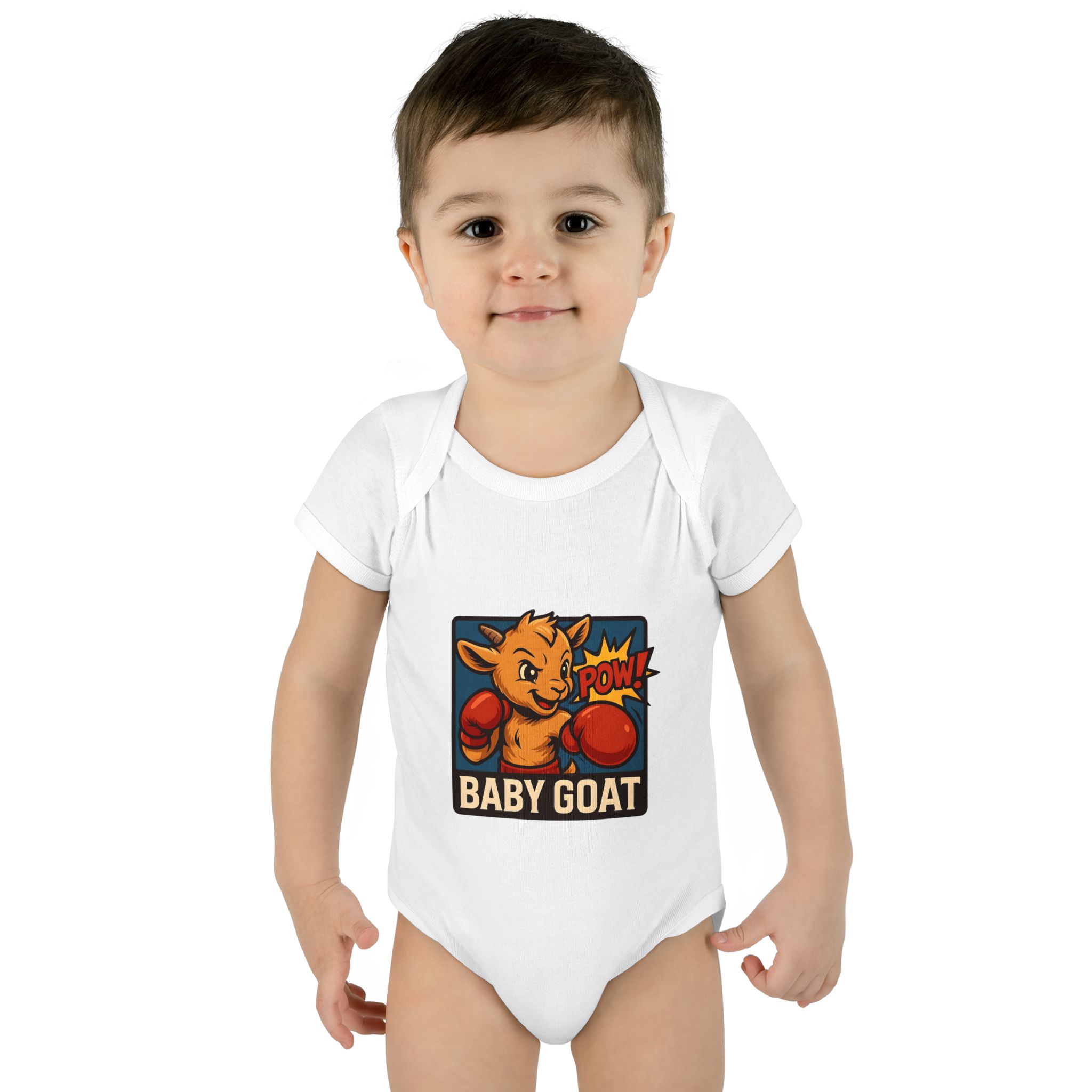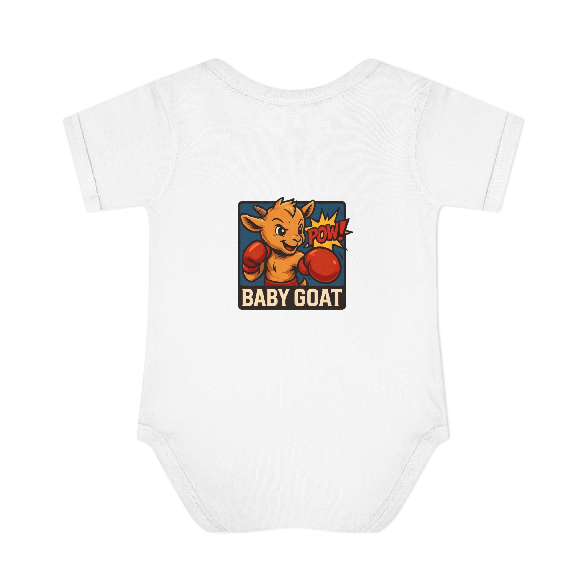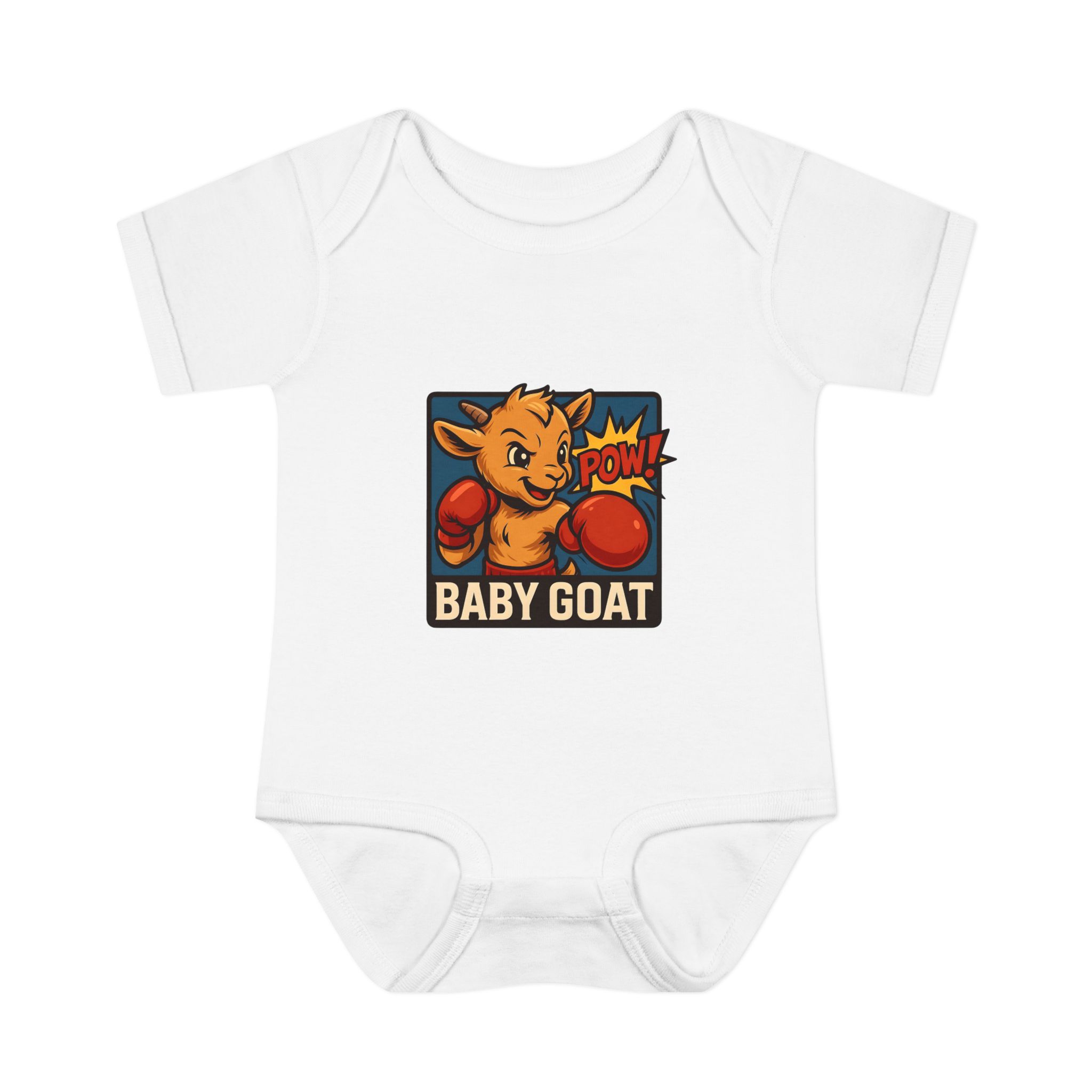 This soft rib bodysuit brings playful energy to baby’s everyday wardrobe. A bright, pop-art baby goat wearing boxing gloves is printed on lightweight, breathable cotton — a small, cheeky statement that makes diaper changes and cuddles more fun. The lap shoulder and three-snap closure keep dressing simple for busy parents while ribbed edges and side seams hold the shape wash after wash. It sits comfortably against delicate skin and the tagless-style DTF neck label avoids irritation. Dress it under overalls for a day at the park or keep it as the go-to outfit for cozy mornings and family photos.