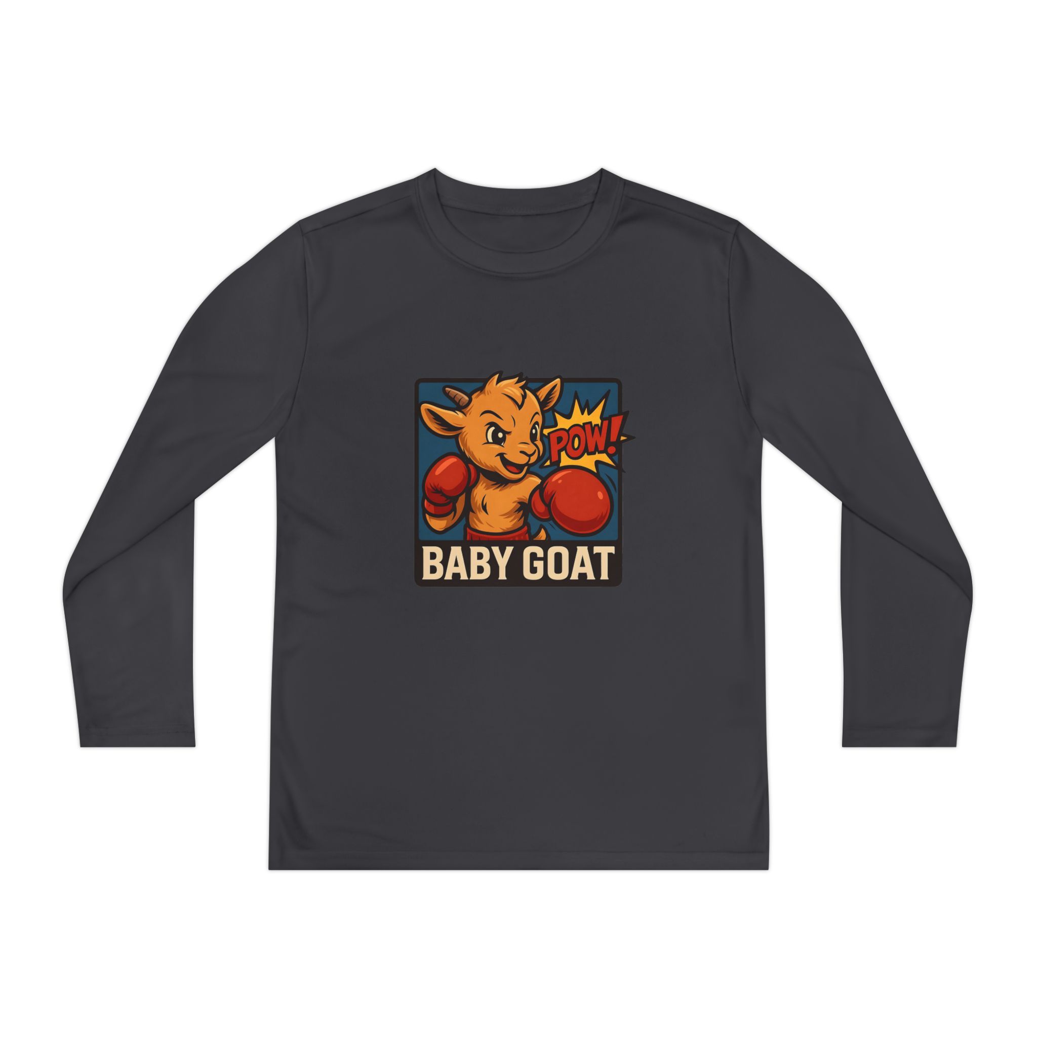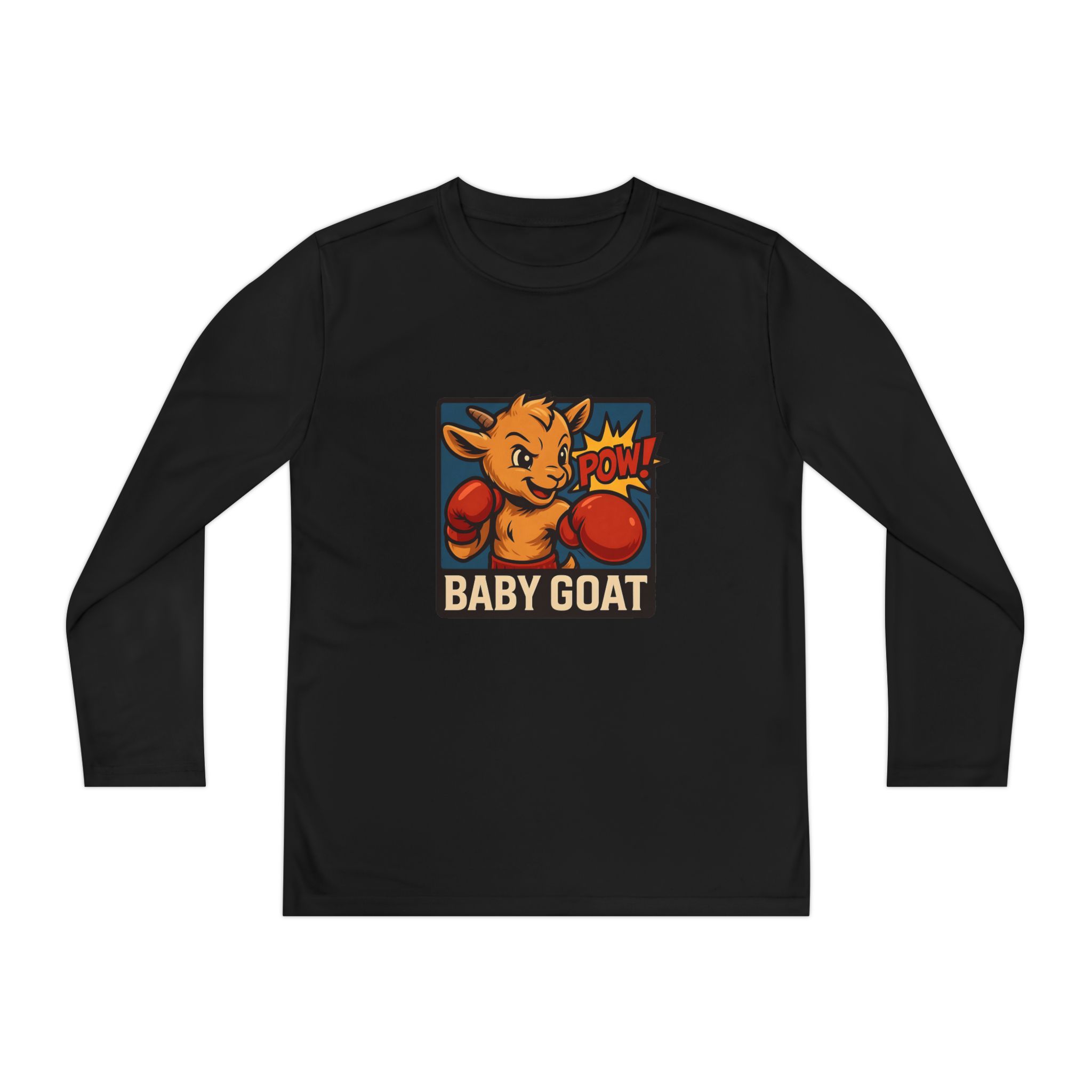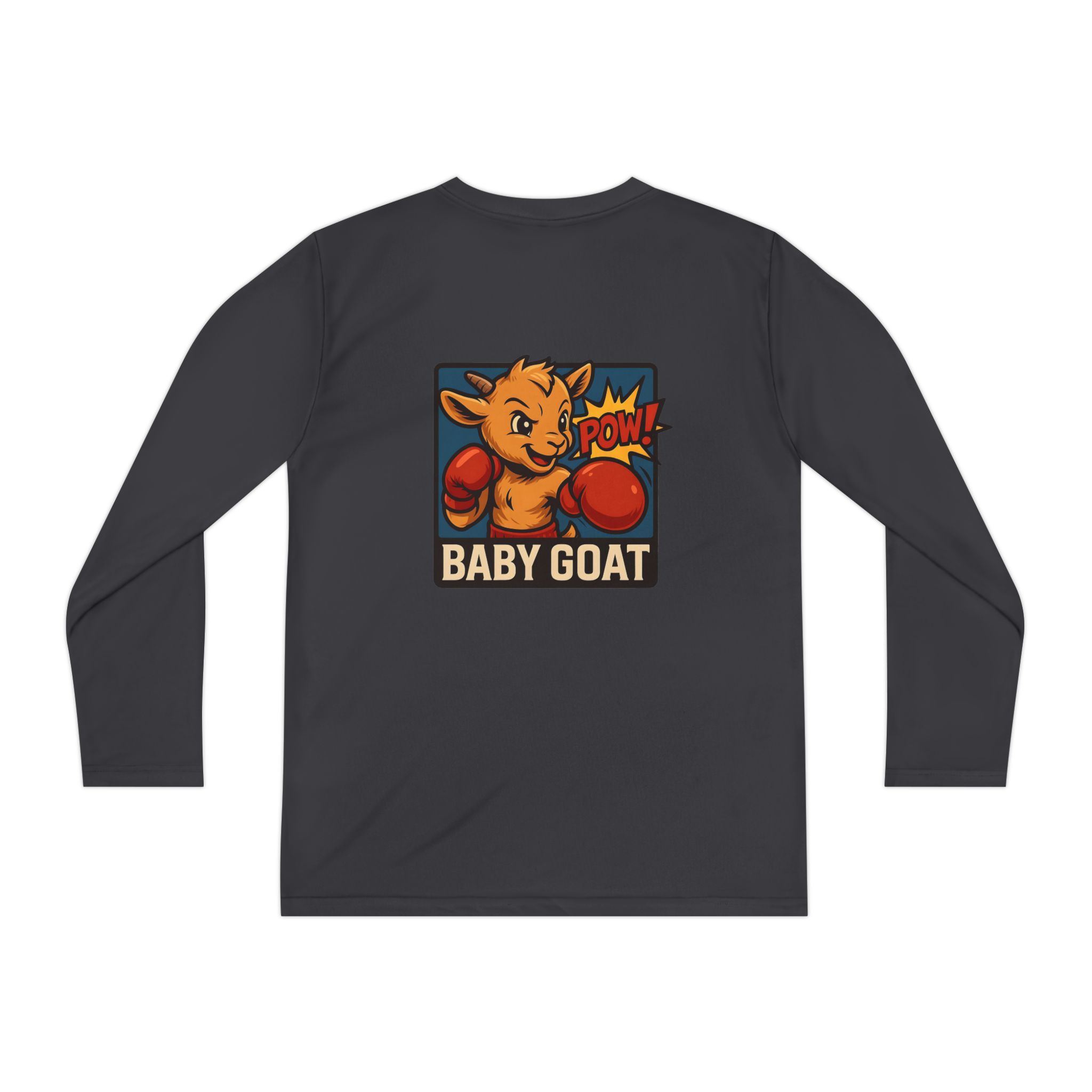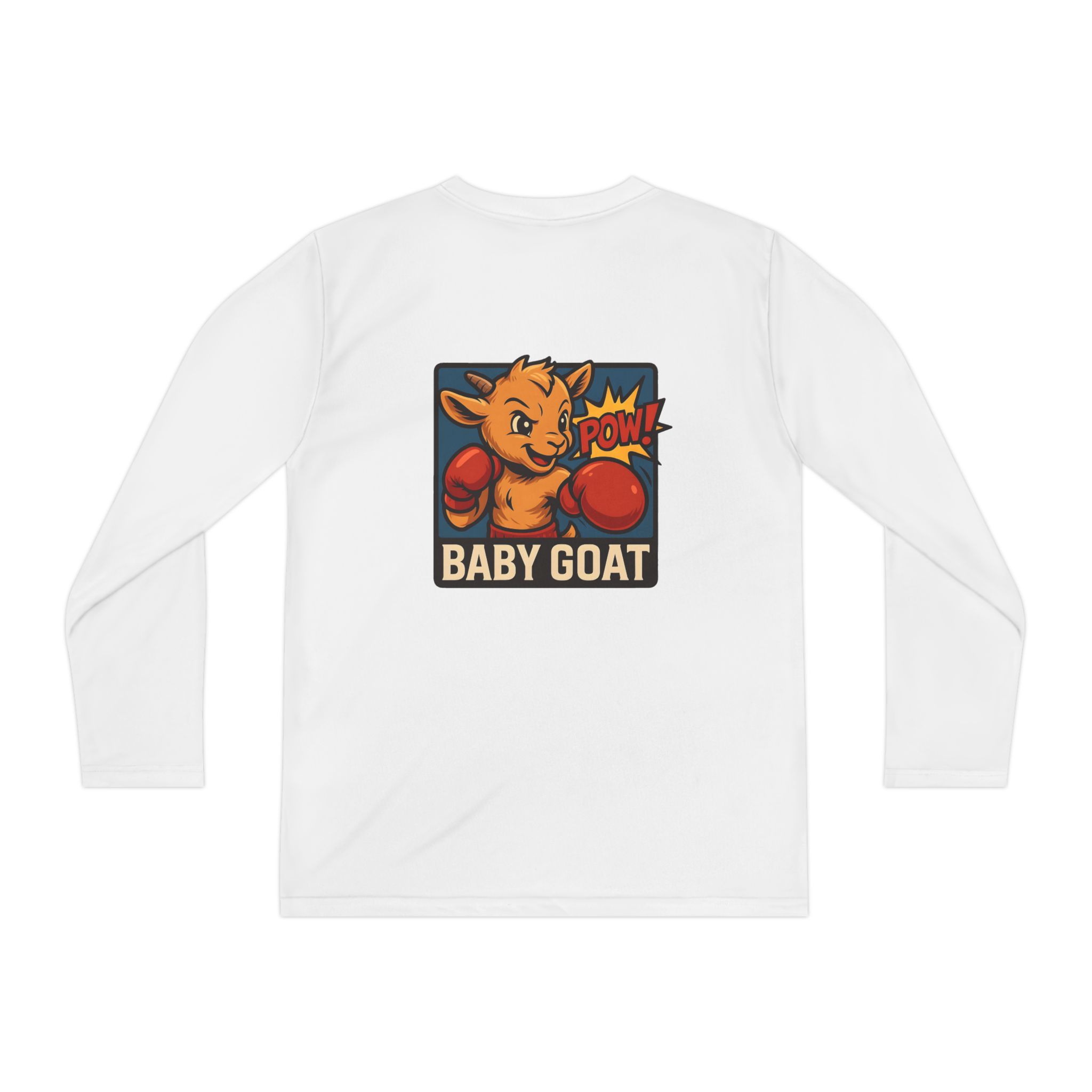 Lightweight, athletic long sleeve made for kids who move, play, and spar through the day. This moisture-wicking polyester top keeps young athletes cool and dry during practice, PE, and backyard matches. The bold DTF-printed ‘Baby Goat’ boxing graphic sits front-and-center with bright, punchy colors that stay vibrant wash after wash. Cut with an athletic fit and a tear-away label, it’s designed to feel invisible during sprints, drills, and playtime — just enough stretch and a featherlight hand to keep every move free.