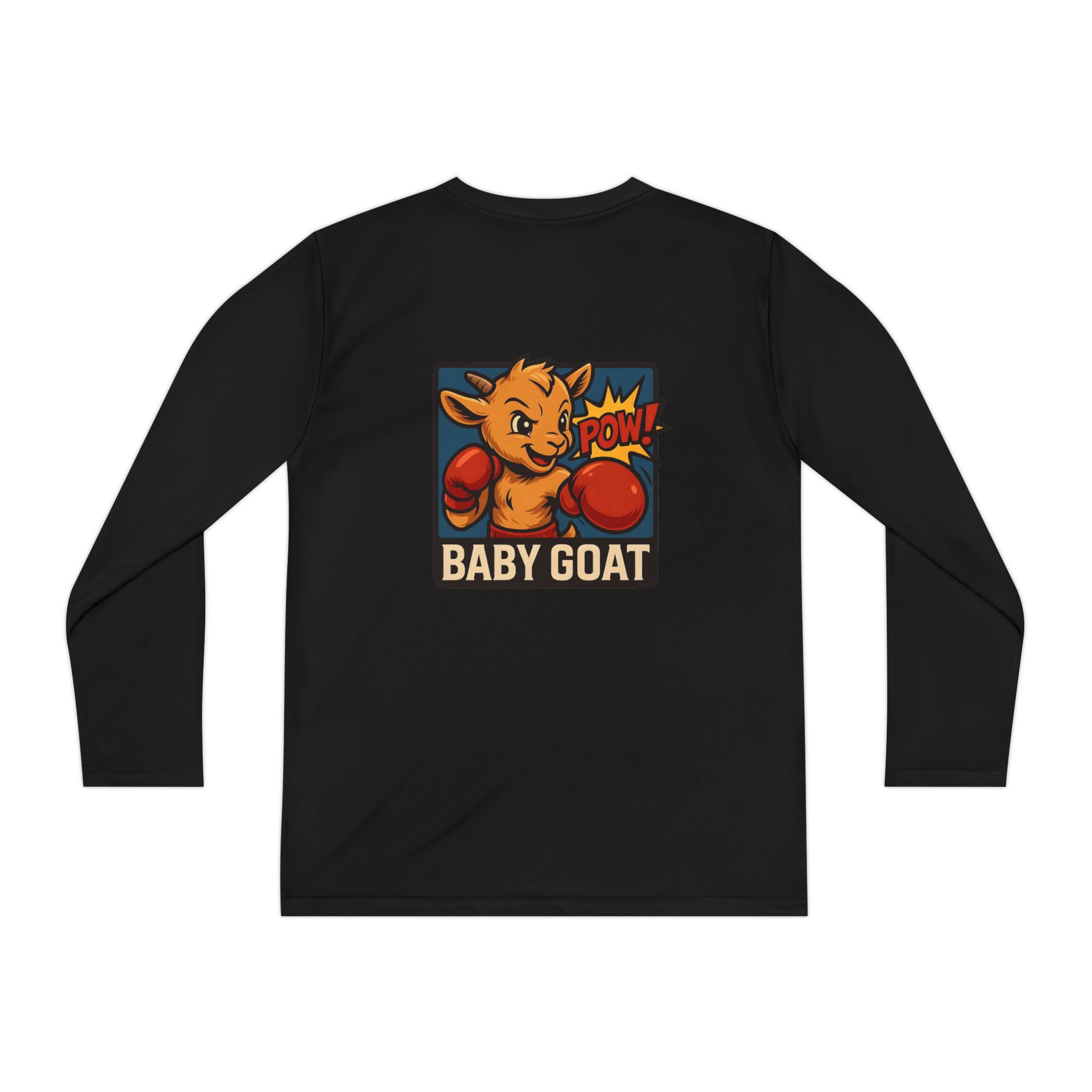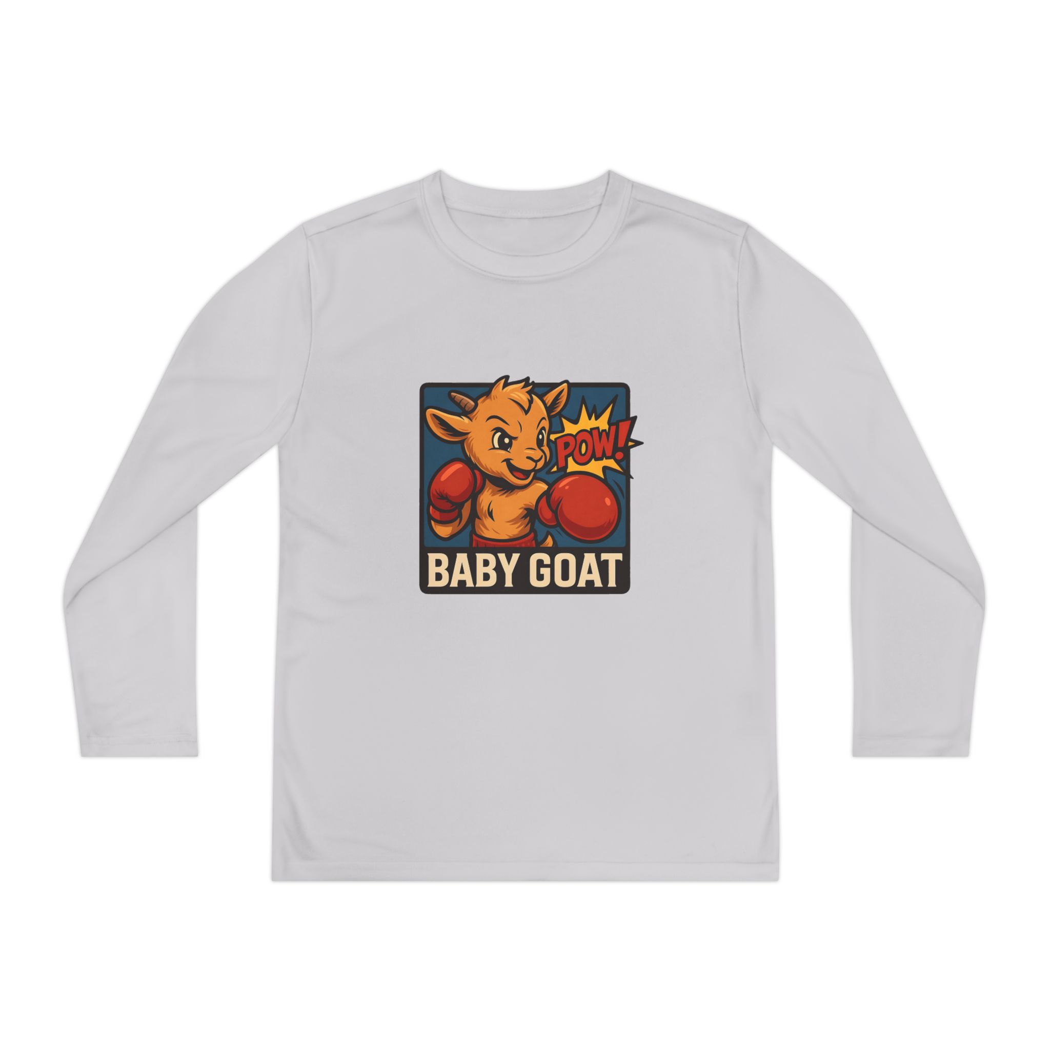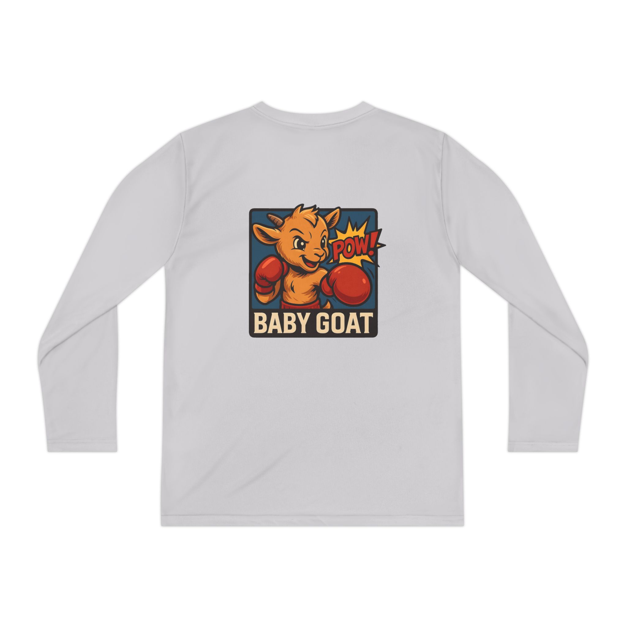 Lightweight and energetic, this long sleeve tee brings playful grit to every practice and playground. The center chest artwork — a spirited baby goat in boxing gloves mid-pow — adds a wink of mischief and confidence. Breathable, extra-light polyester keeps young athletes cool and moving, while the athletic cut and moisture-wicking finish follow every sprint, drill, and recess dash. Tear-away label keeps things comfy against sensitive necks. Wear it for training days, game warm-ups, outdoor play, or casual weekends when a little attitude and a lot of comfort are wanted.