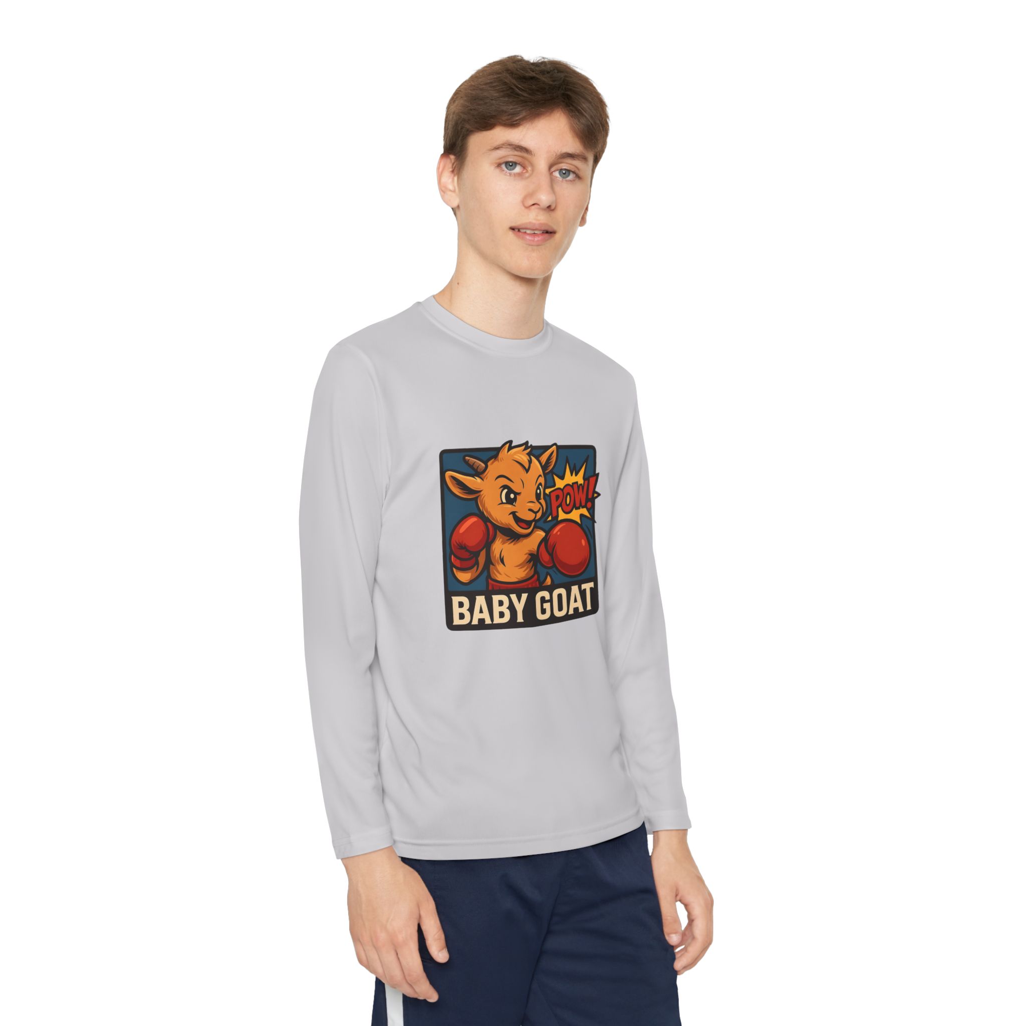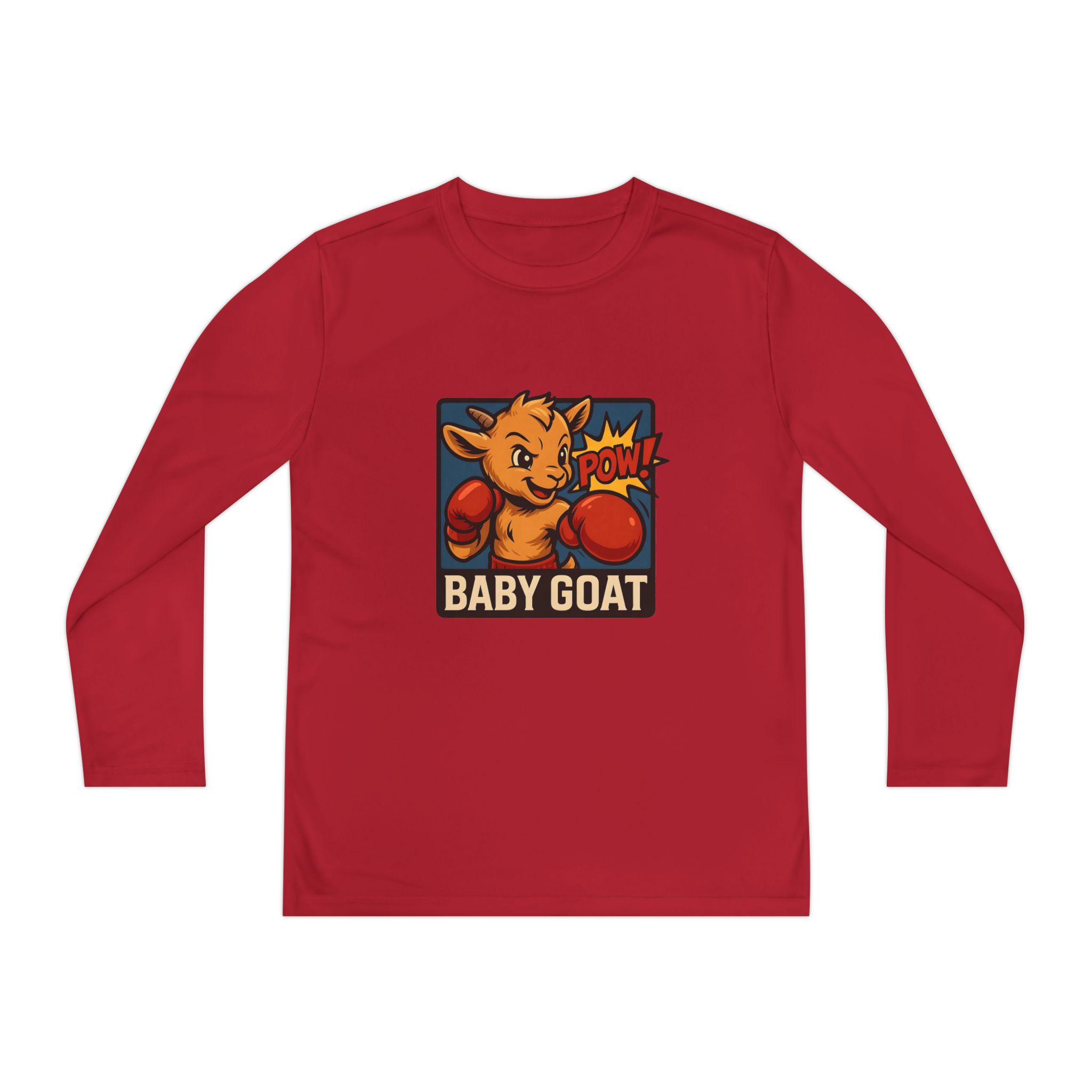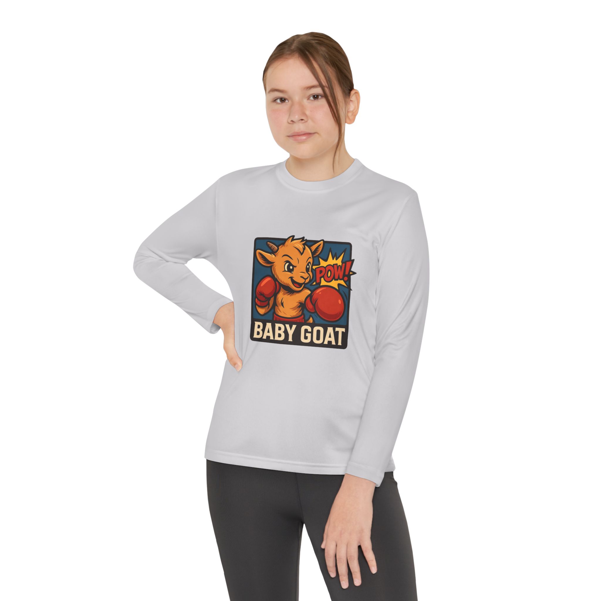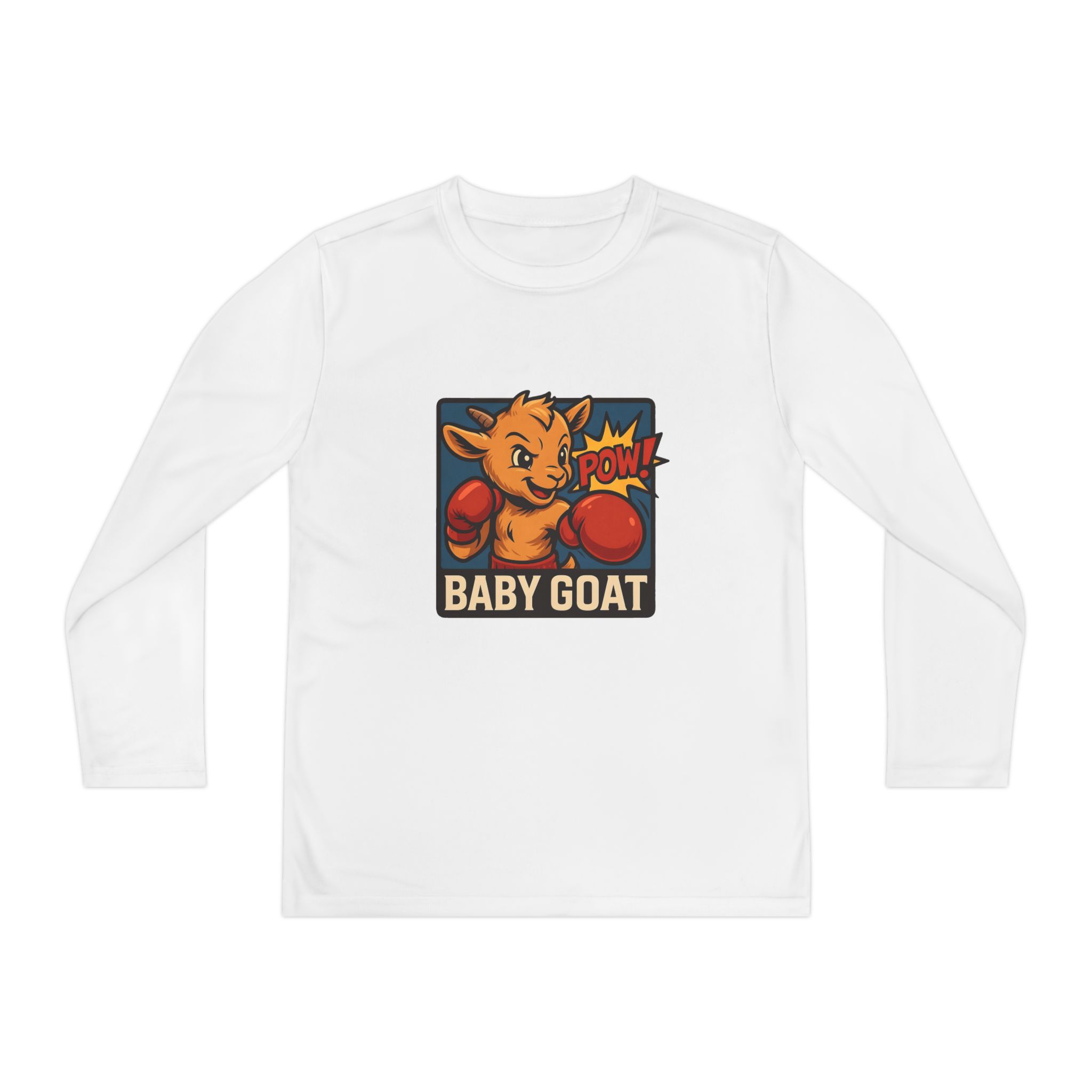 Lightweight and energetic, this long sleeve tee brings playful grit to every practice and playground. The center chest artwork — a spirited baby goat in boxing gloves mid-pow — adds a wink of mischief and confidence. Breathable, extra-light polyester keeps young athletes cool and moving, while the athletic cut and moisture-wicking finish follow every sprint, drill, and recess dash. Tear-away label keeps things comfy against sensitive necks. Wear it for training days, game warm-ups, outdoor play, or casual weekends when a little attitude and a lot of comfort are wanted.