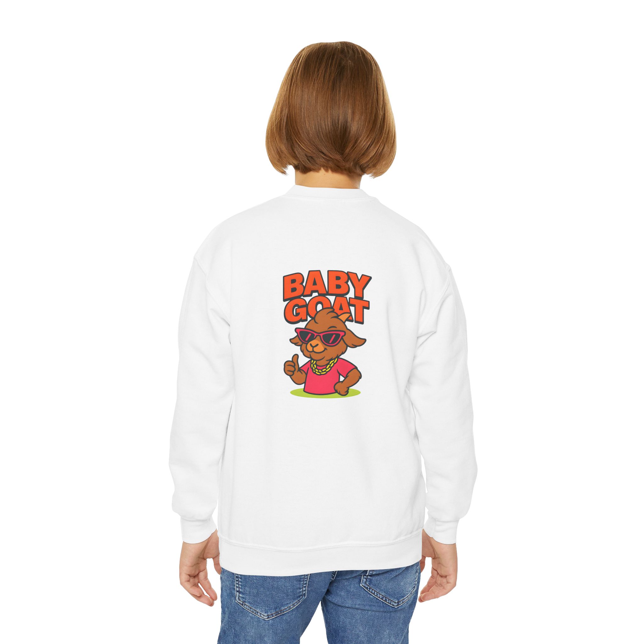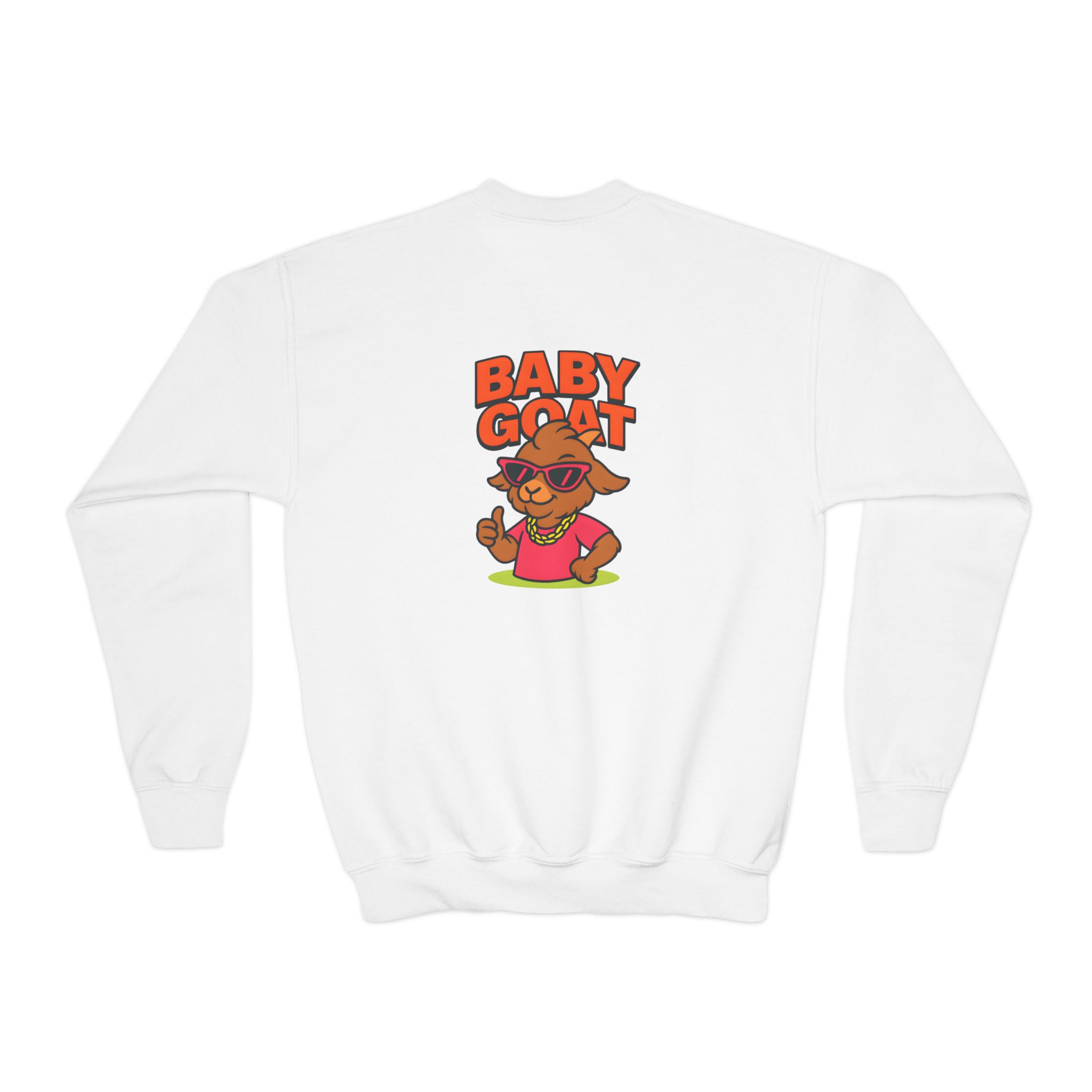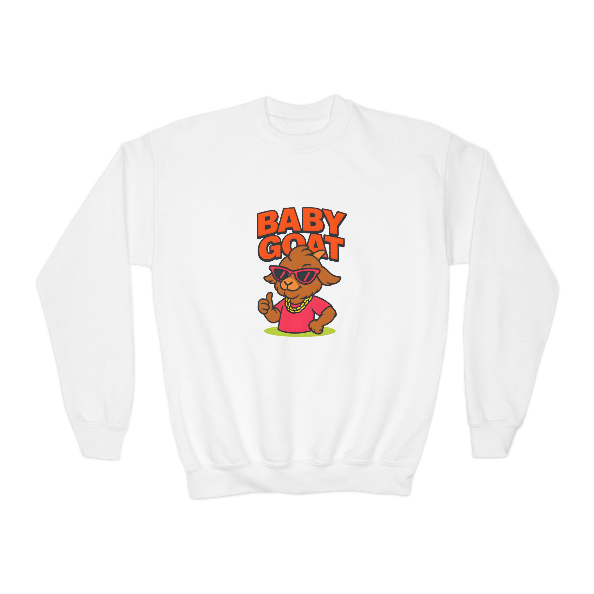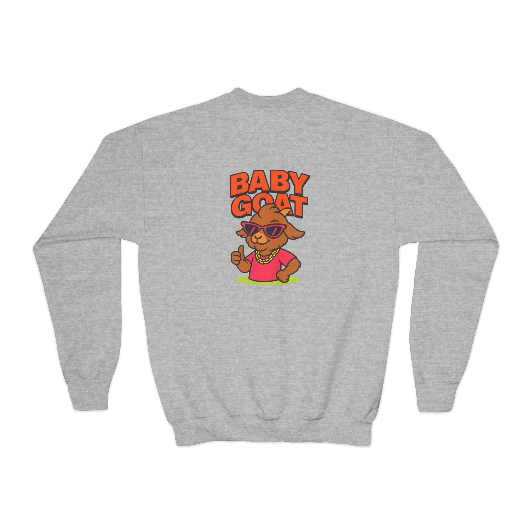 This cozy youth crewneck brings playful swagger to a kid’s everyday wardrobe. Soft yet sturdy, the medium-heavy knit holds its shape while the ribbed collar and cuffs give a comfy, lived-in feel. A bold, colorful “Baby Goat” graphic sits on the chest — bright, cheeky, and full of personality — so it stands out at school, on the playground, or during family outings. The loose fit lets active kids move freely and layer over tees when the weather turns. Built to last and made with safe, compliant materials, it’s a practical piece that still feels fun and expressive for young trendsetters.