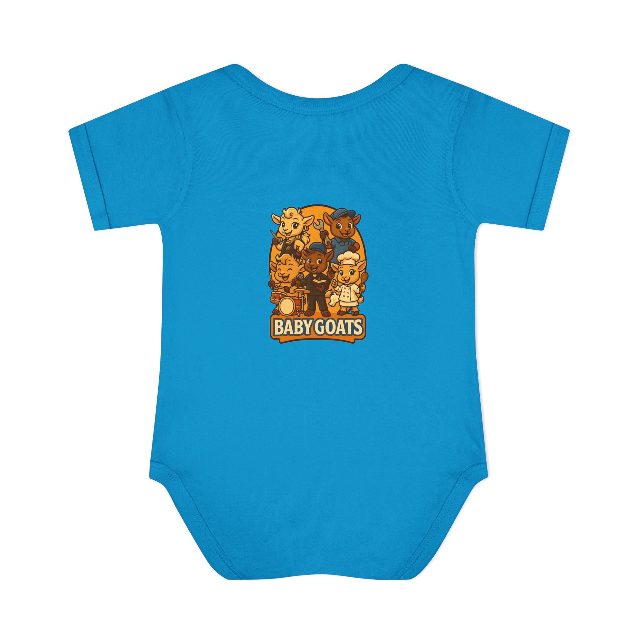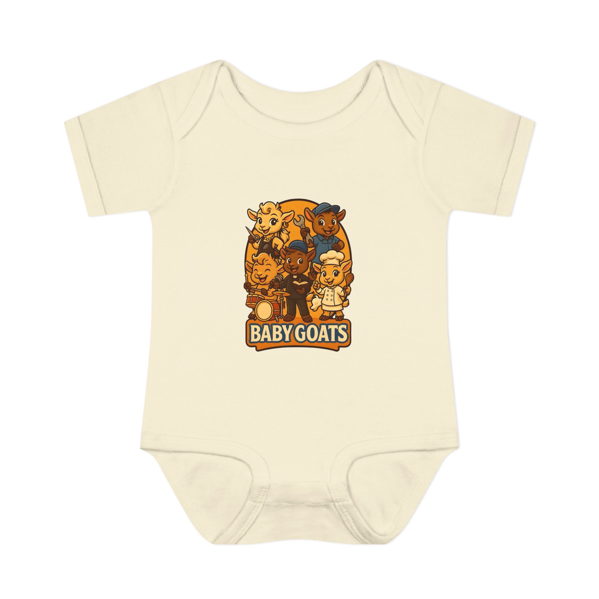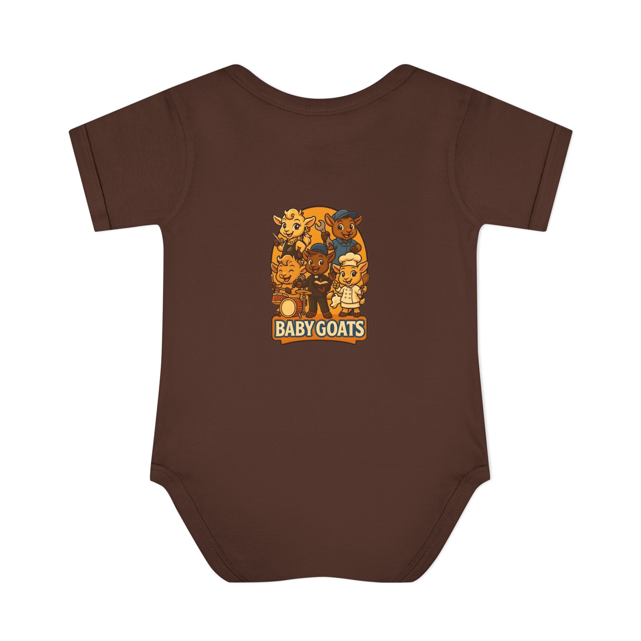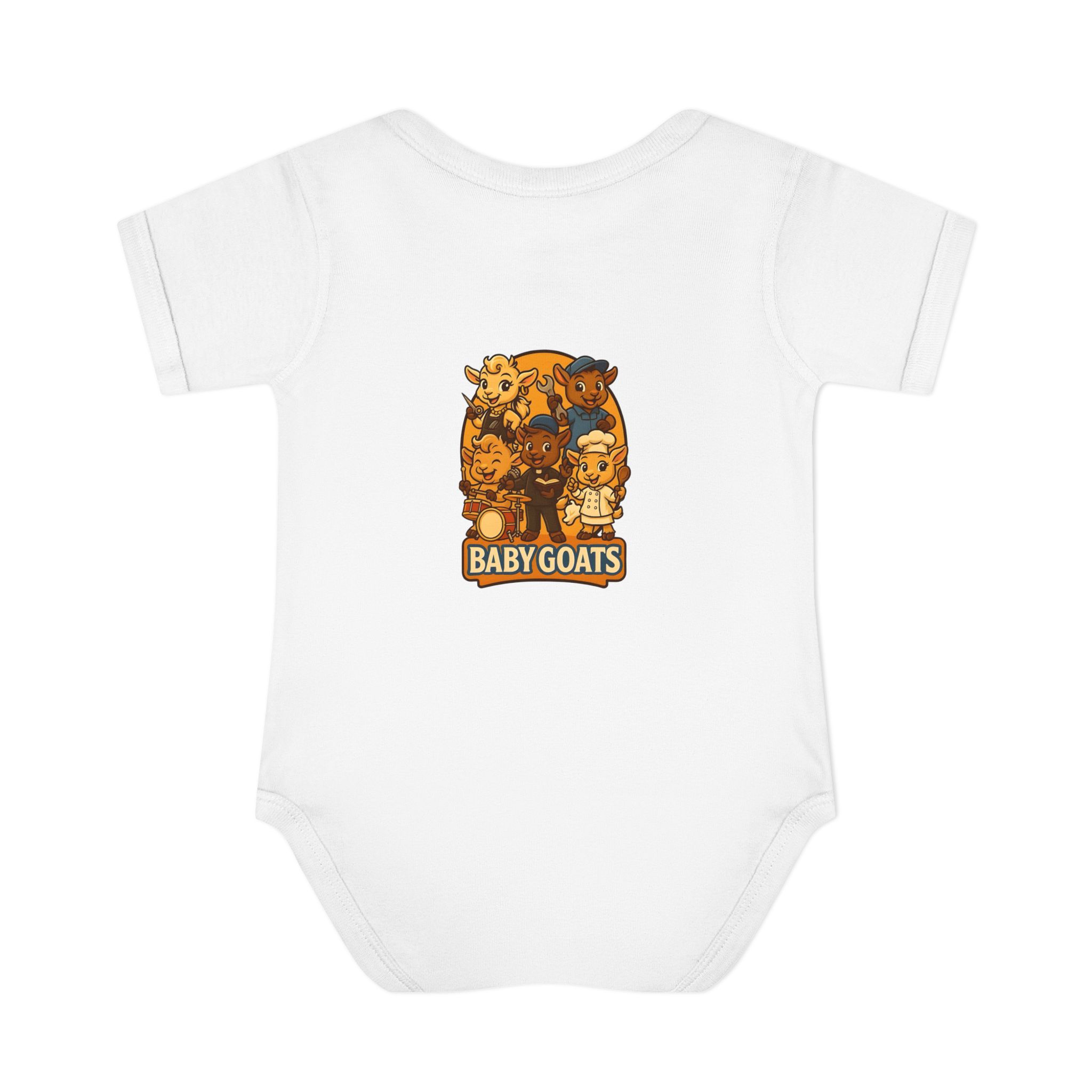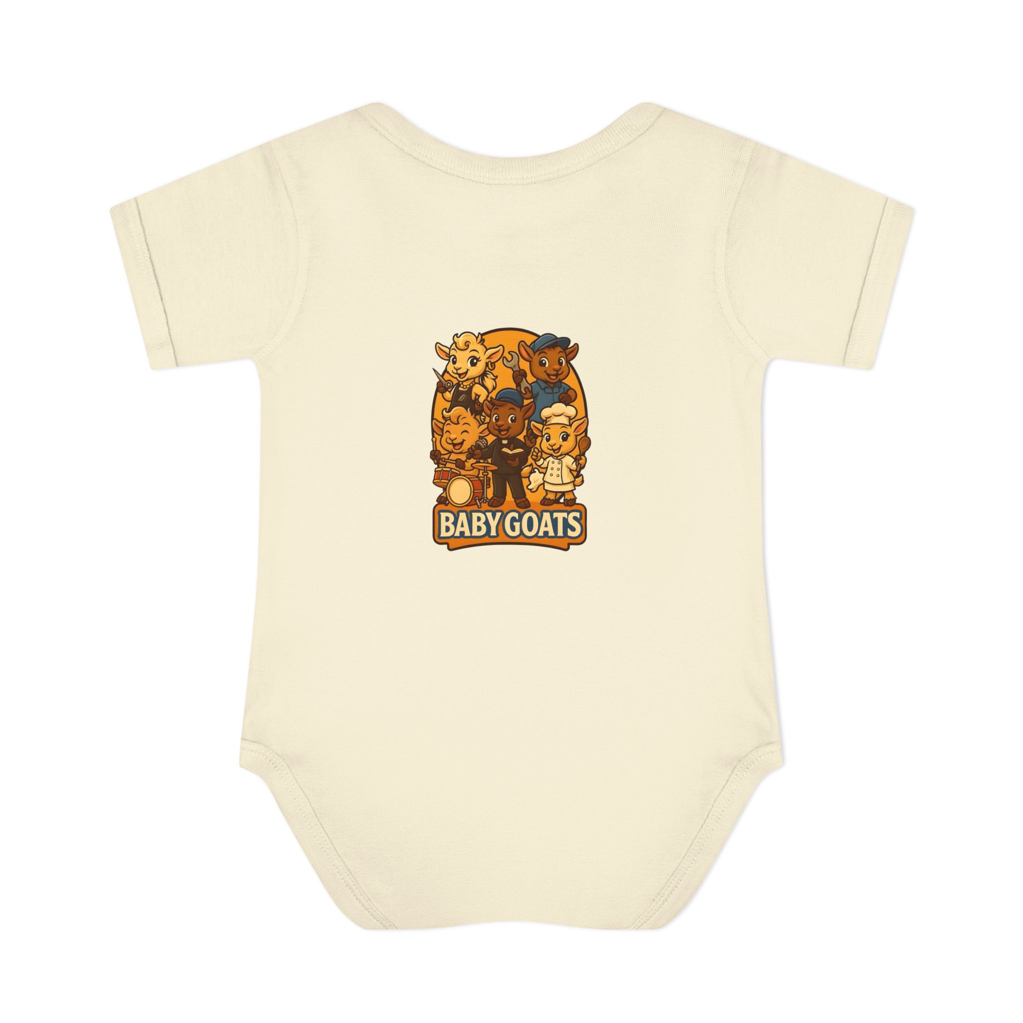 Soft, lightweight baby bodysuit featuring an adorable “Baby Goats” illustration in warm autumn tones. The comfortable rib knit and lap shoulders make quick changes gentle on tiny heads and wiggly arms. Thoughtful details—like a three-snap closure, double-needle ribbed binding, and tear-away label—keep the suit smooth against delicate skin while holding its shape through washes. The playful goat characters bring a cozy, storybook feel to everyday wear, whether for quiet mornings at home or lively family visits.
