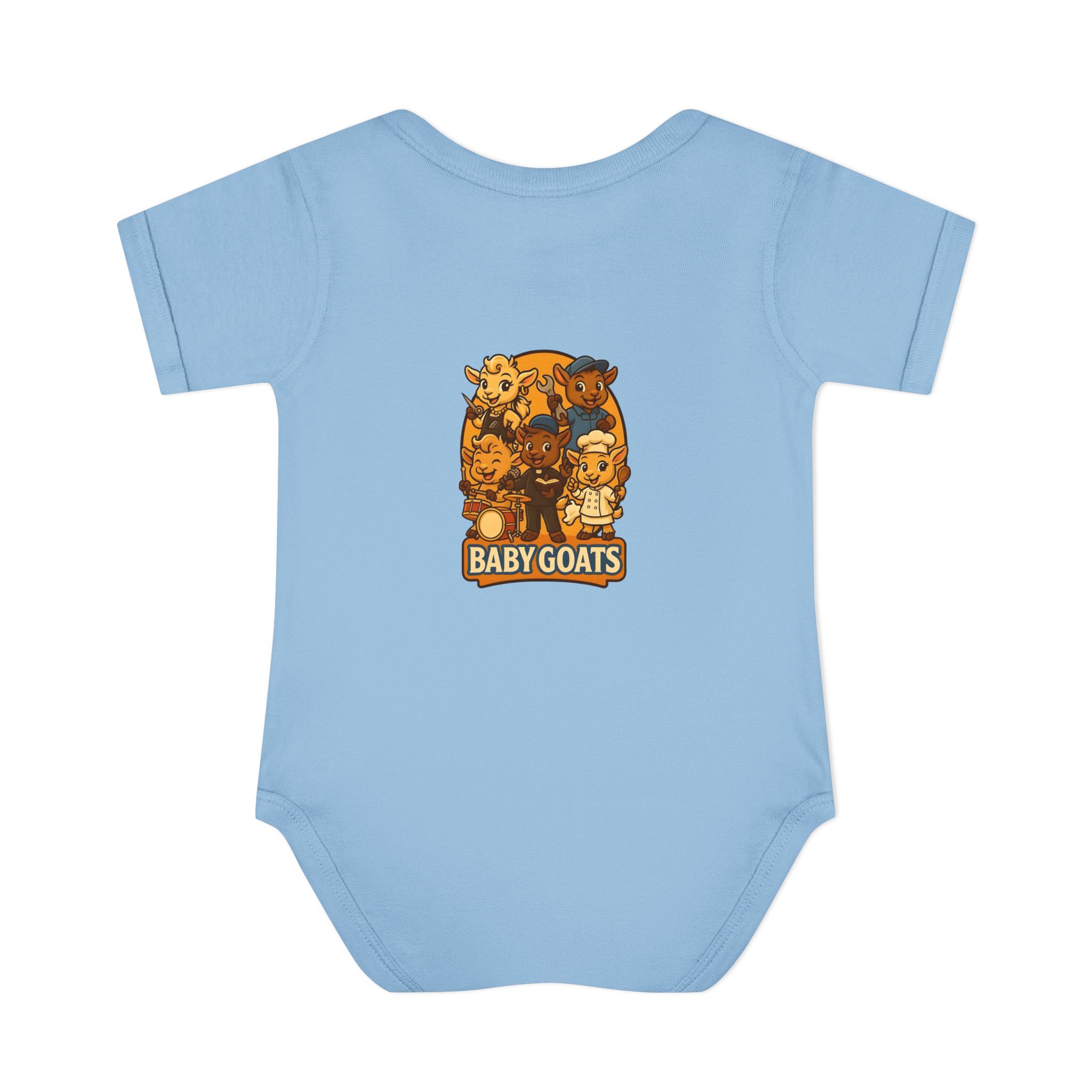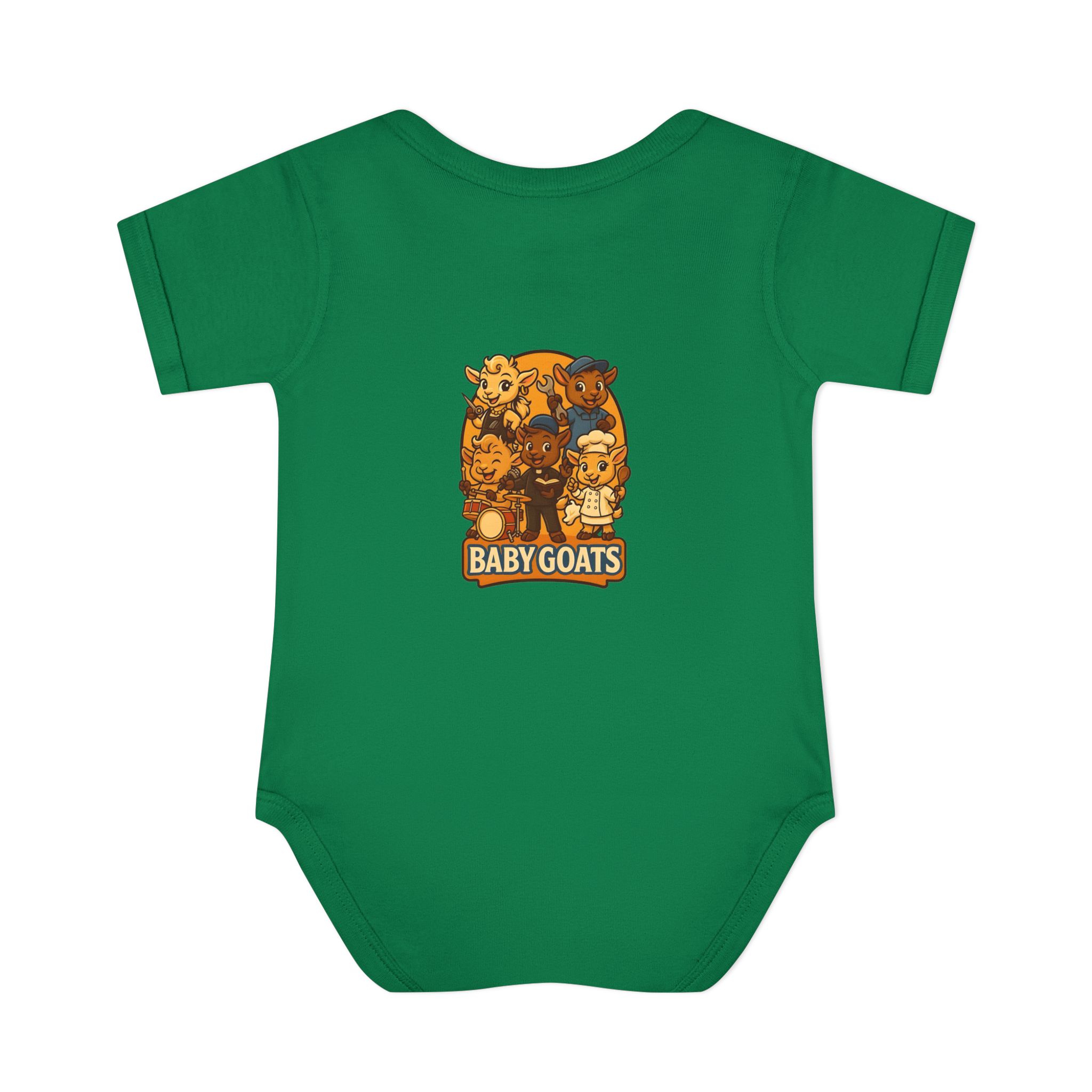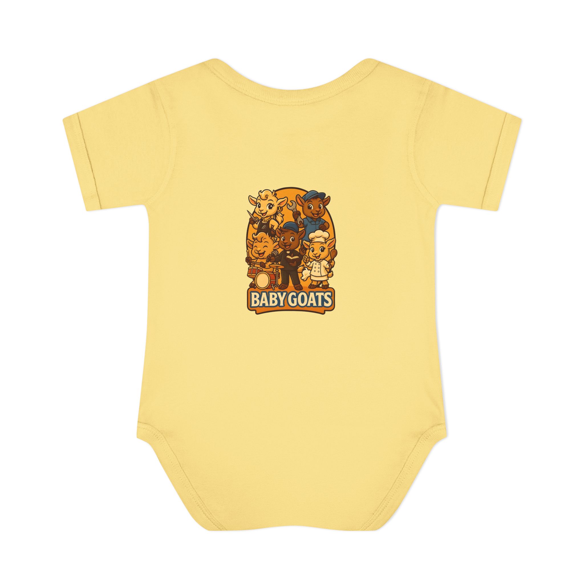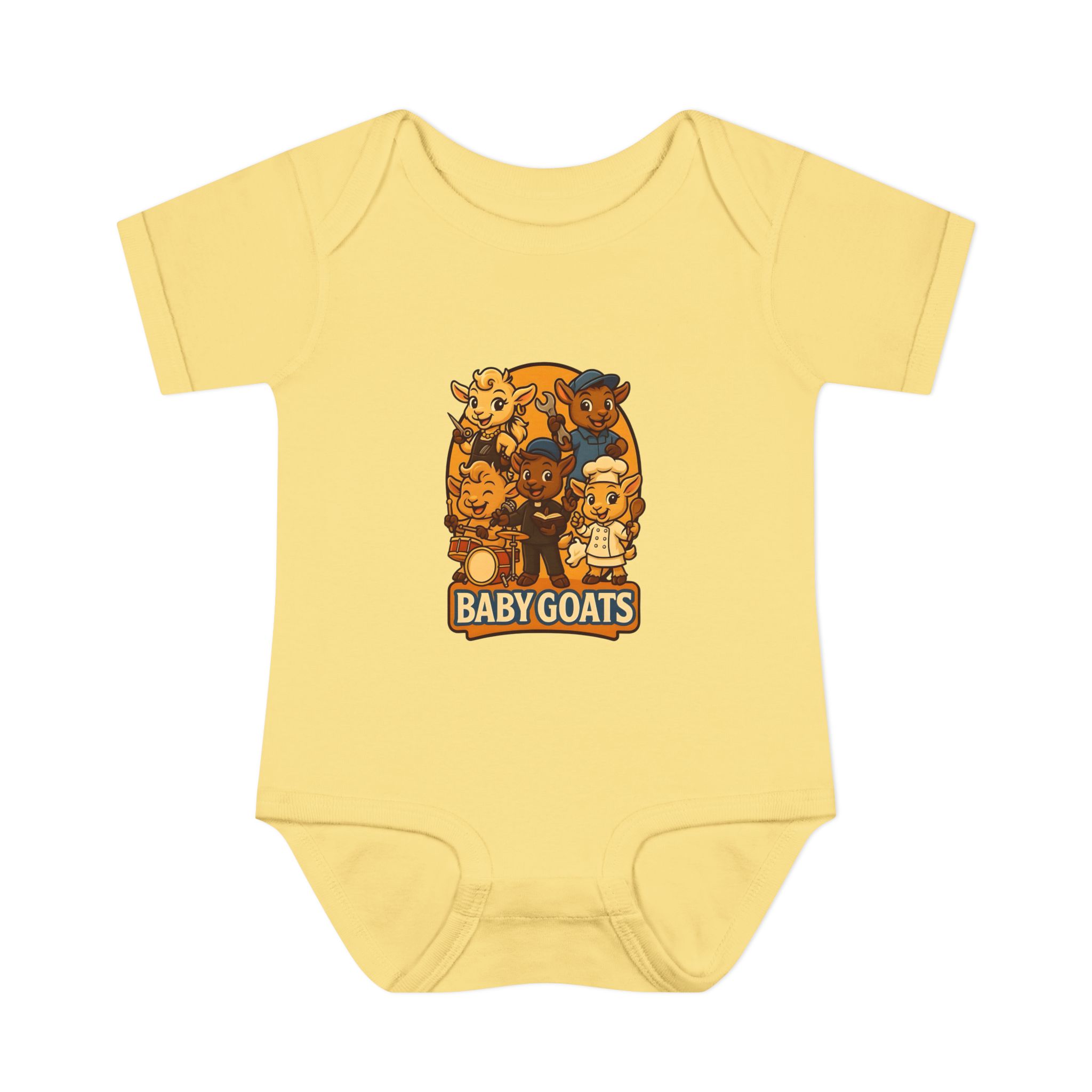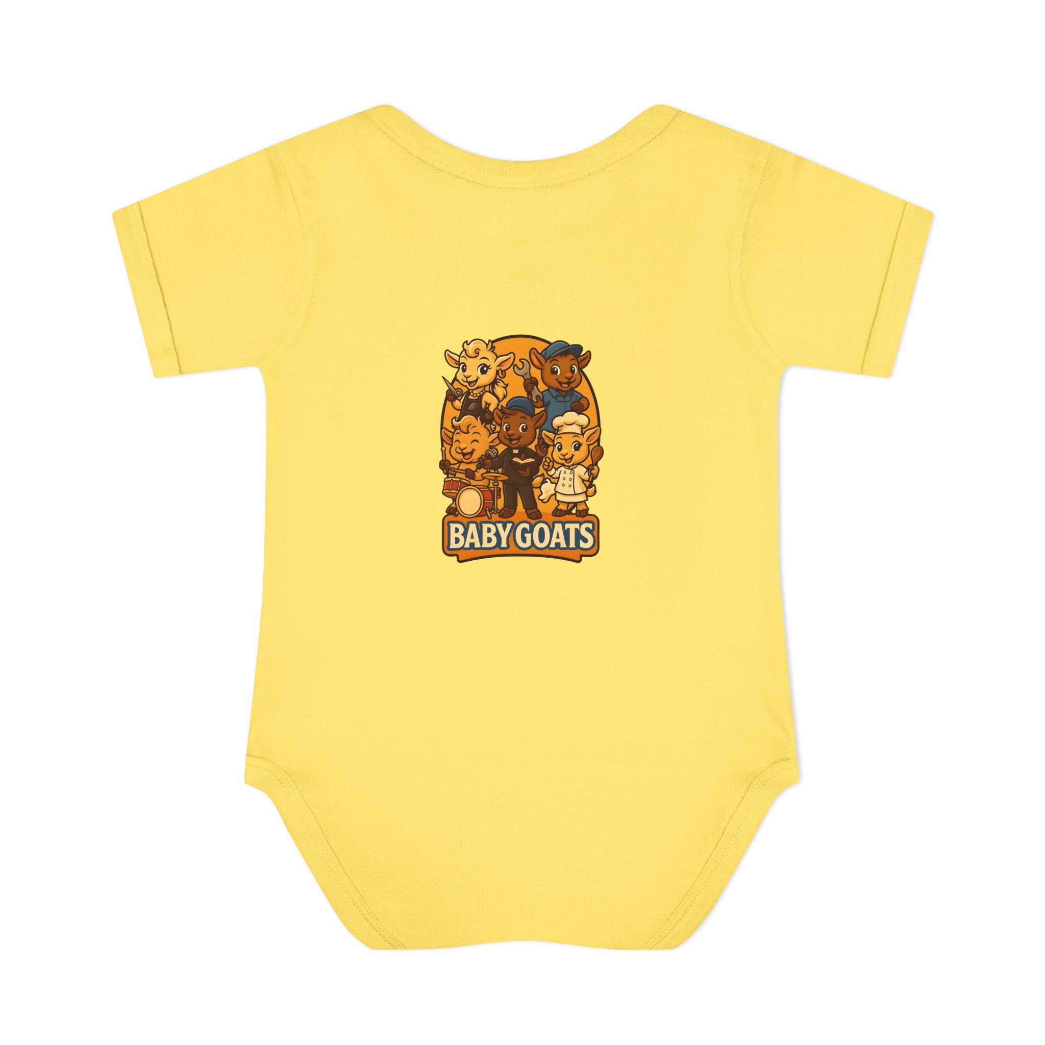 Soft, lightweight baby bodysuit featuring an adorable “Baby Goats” illustration in warm autumn tones. The comfortable rib knit and lap shoulders make quick changes gentle on tiny heads and wiggly arms. Thoughtful details—like a three-snap closure, double-needle ribbed binding, and tear-away label—keep the suit smooth against delicate skin while holding its shape through washes. The playful goat characters bring a cozy, storybook feel to everyday wear, whether for quiet mornings at home or lively family visits.