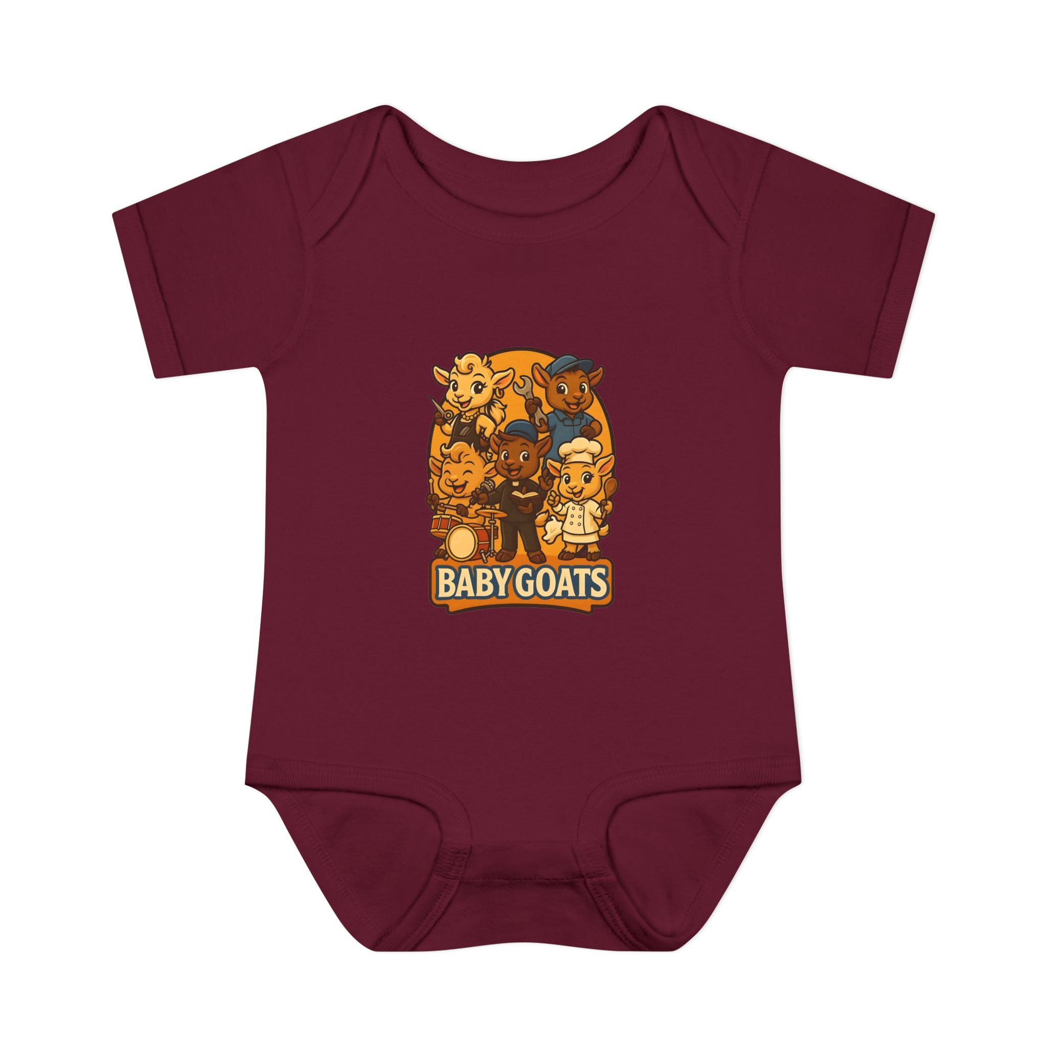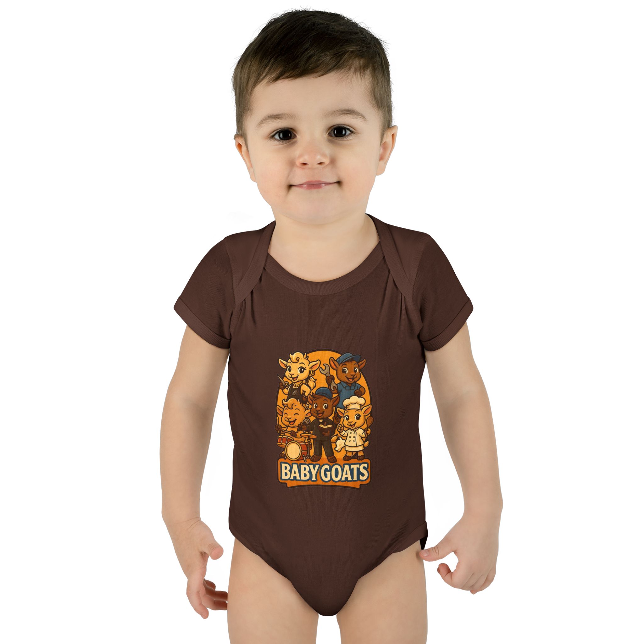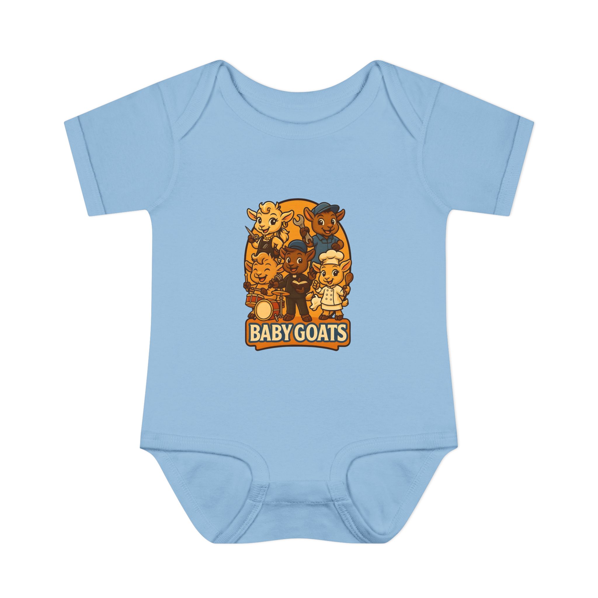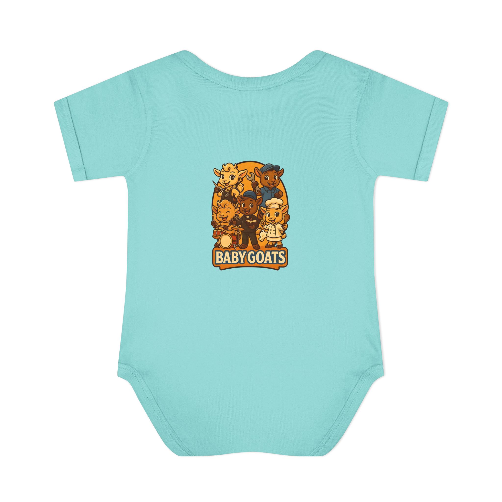 Soft, lightweight baby bodysuit featuring an adorable “Baby Goats” illustration in warm autumn tones. The comfortable rib knit and lap shoulders make quick changes gentle on tiny heads and wiggly arms. Thoughtful details—like a three-snap closure, double-needle ribbed binding, and tear-away label—keep the suit smooth against delicate skin while holding its shape through washes. The playful goat characters bring a cozy, storybook feel to everyday wear, whether for quiet mornings at home or lively family visits.
