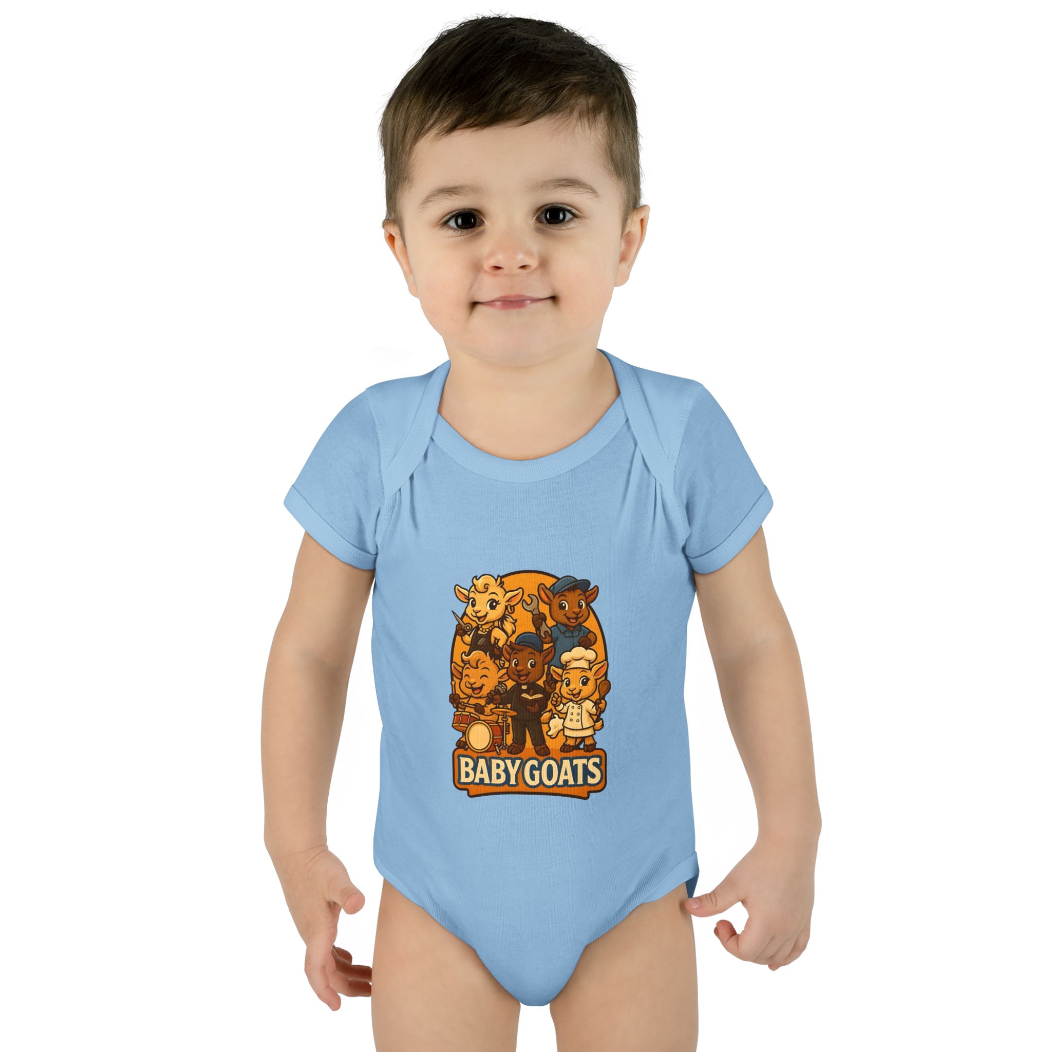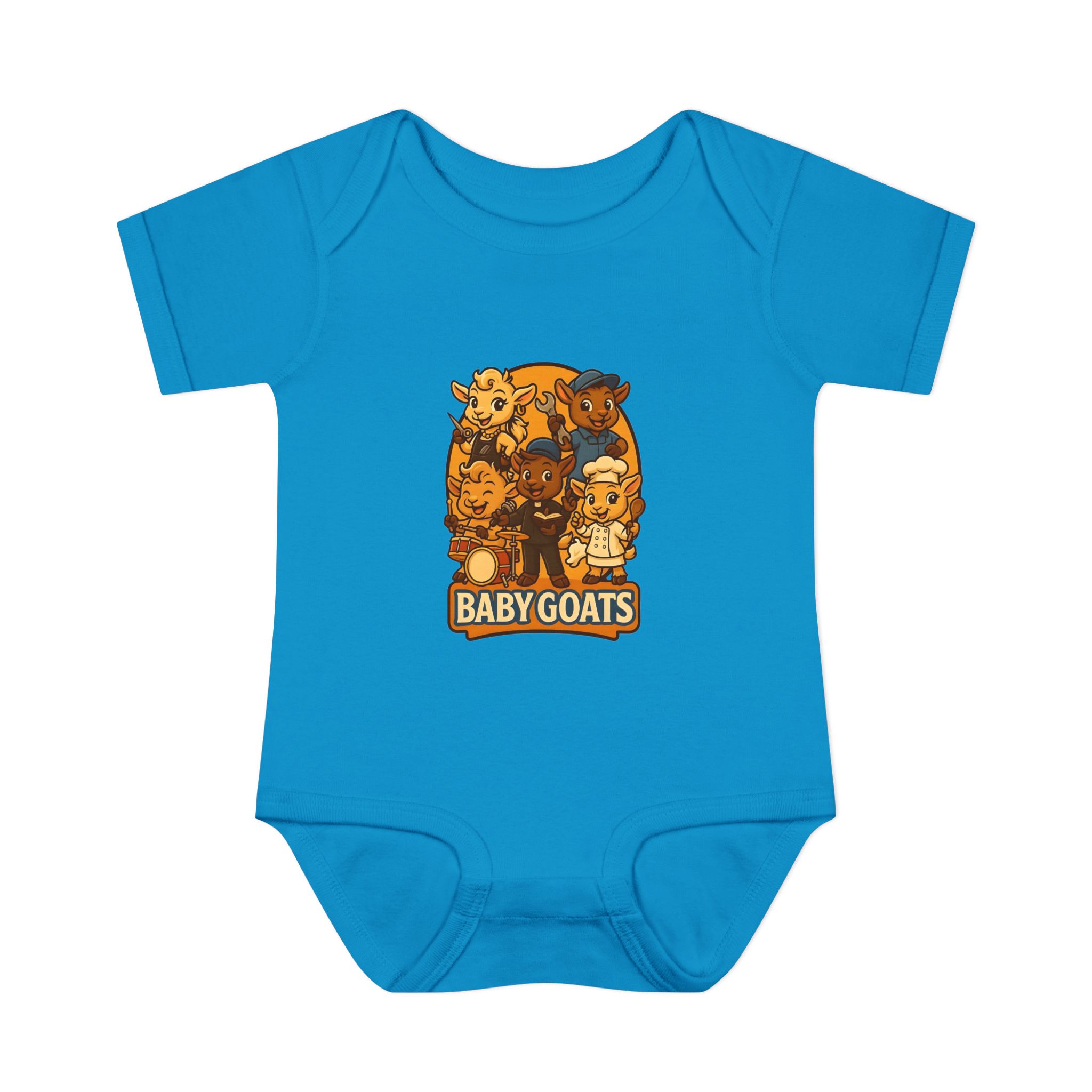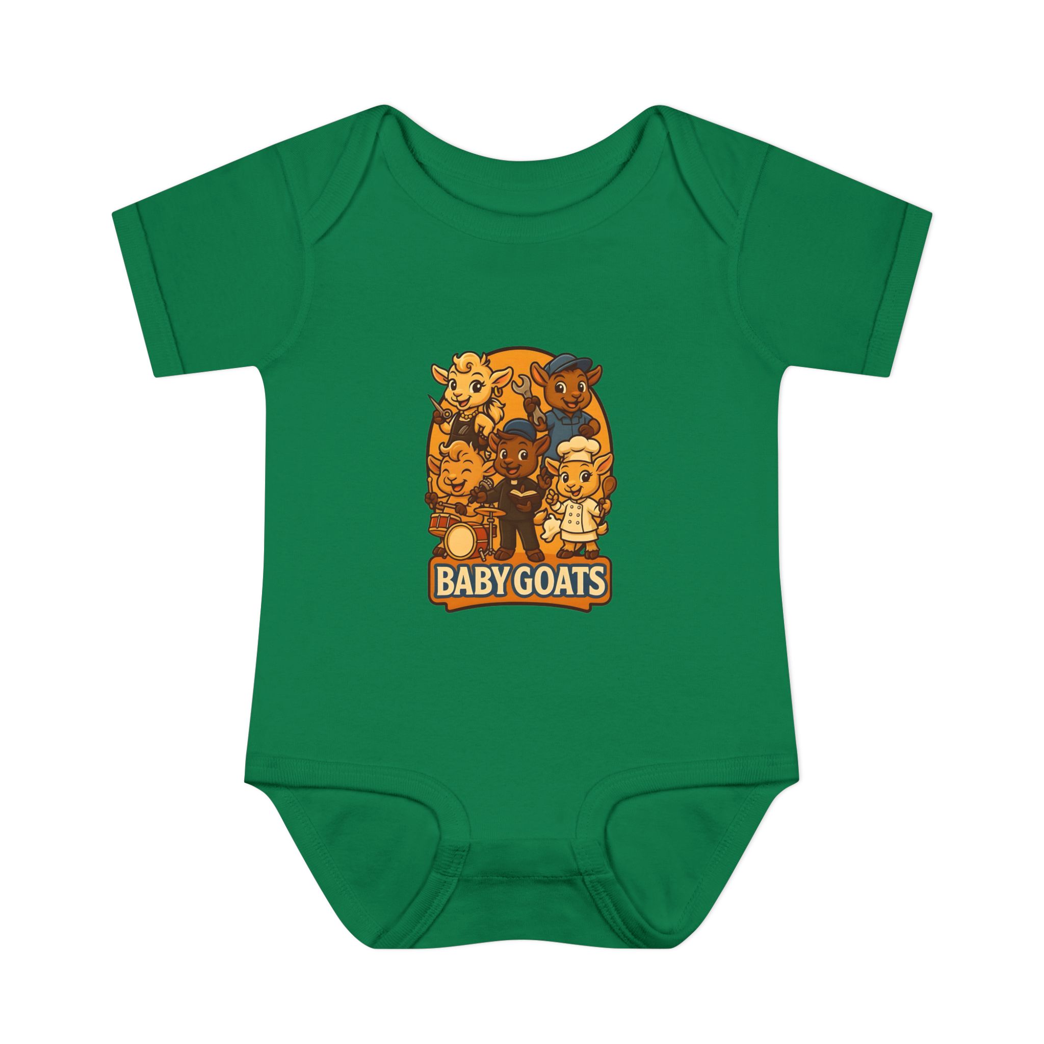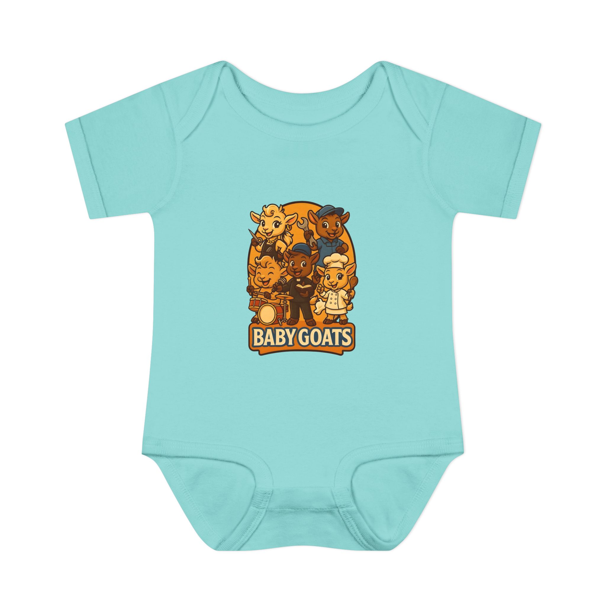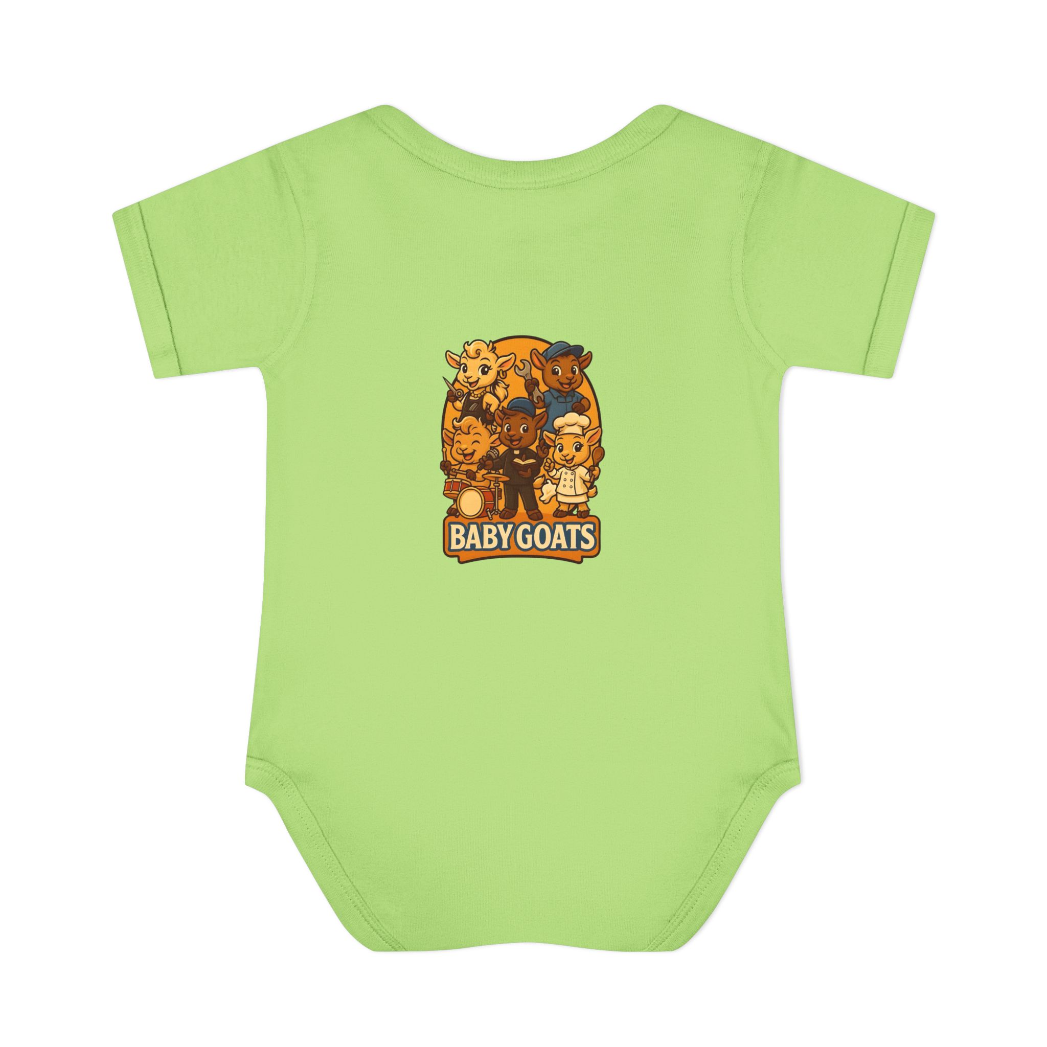 Soft, lightweight baby bodysuit featuring an adorable “Baby Goats” illustration in warm autumn tones. The comfortable rib knit and lap shoulders make quick changes gentle on tiny heads and wiggly arms. Thoughtful details—like a three-snap closure, double-needle ribbed binding, and tear-away label—keep the suit smooth against delicate skin while holding its shape through washes. The playful goat characters bring a cozy, storybook feel to everyday wear, whether for quiet mornings at home or lively family visits.