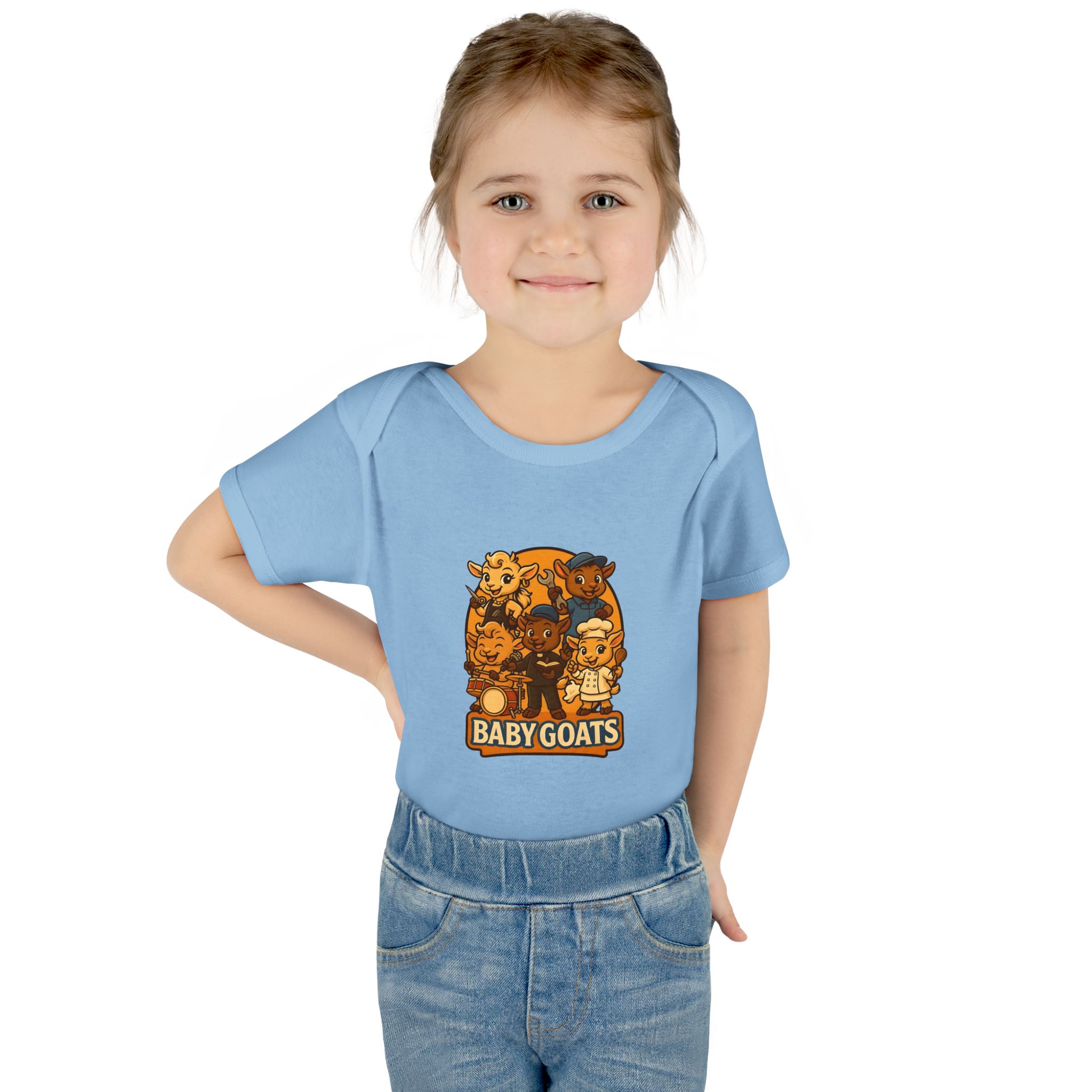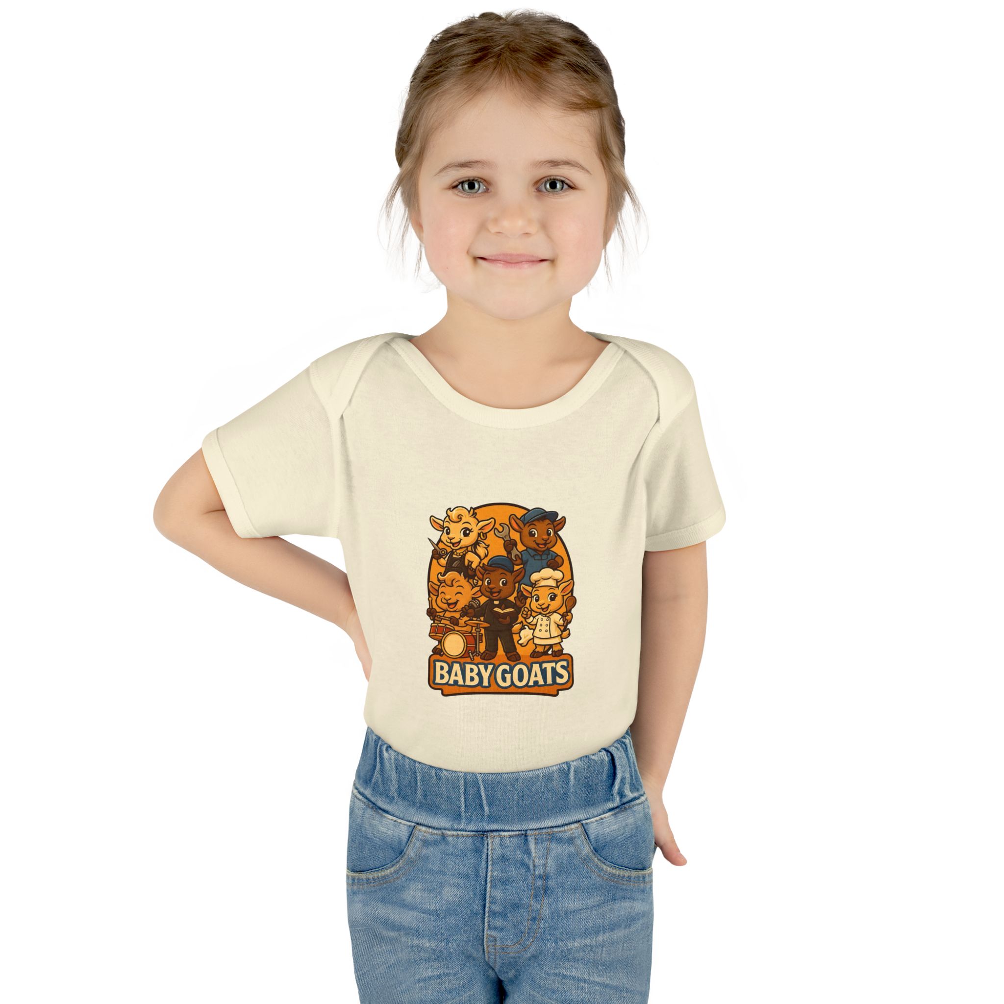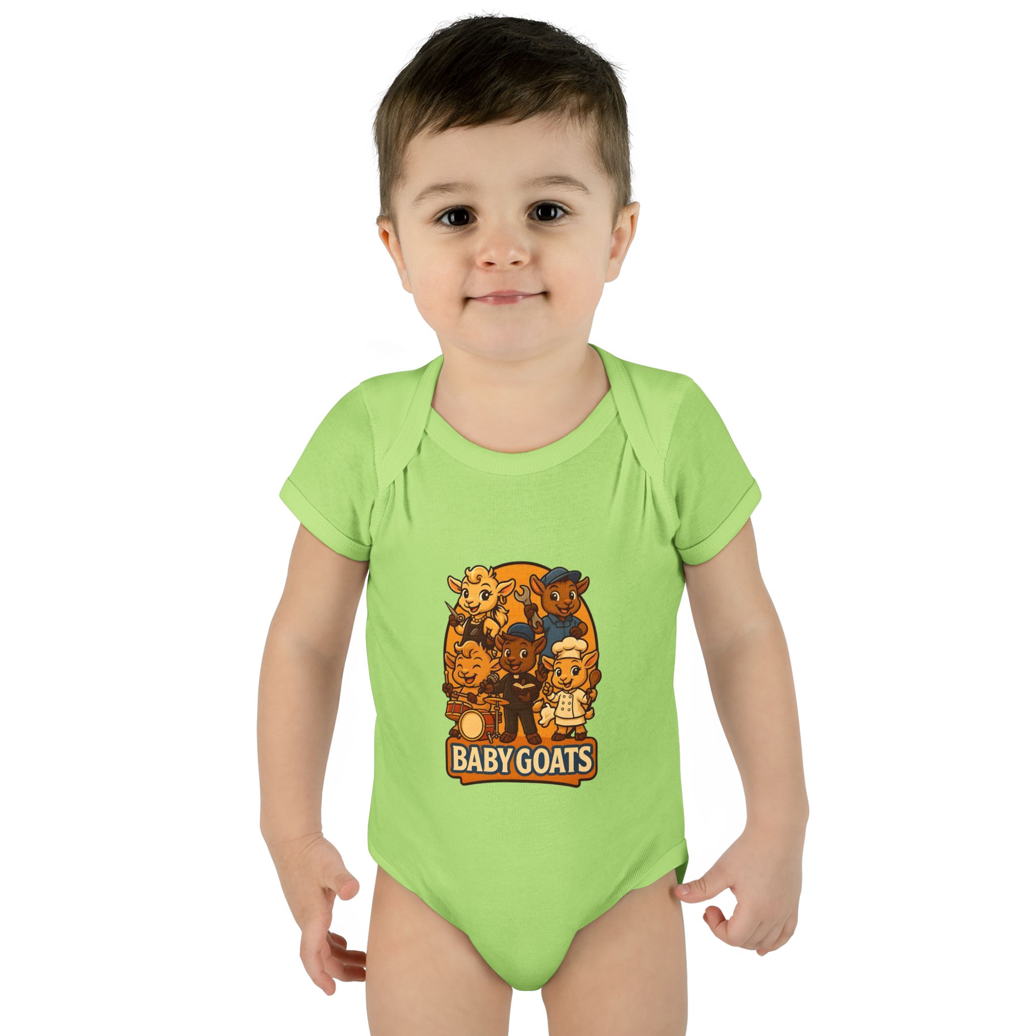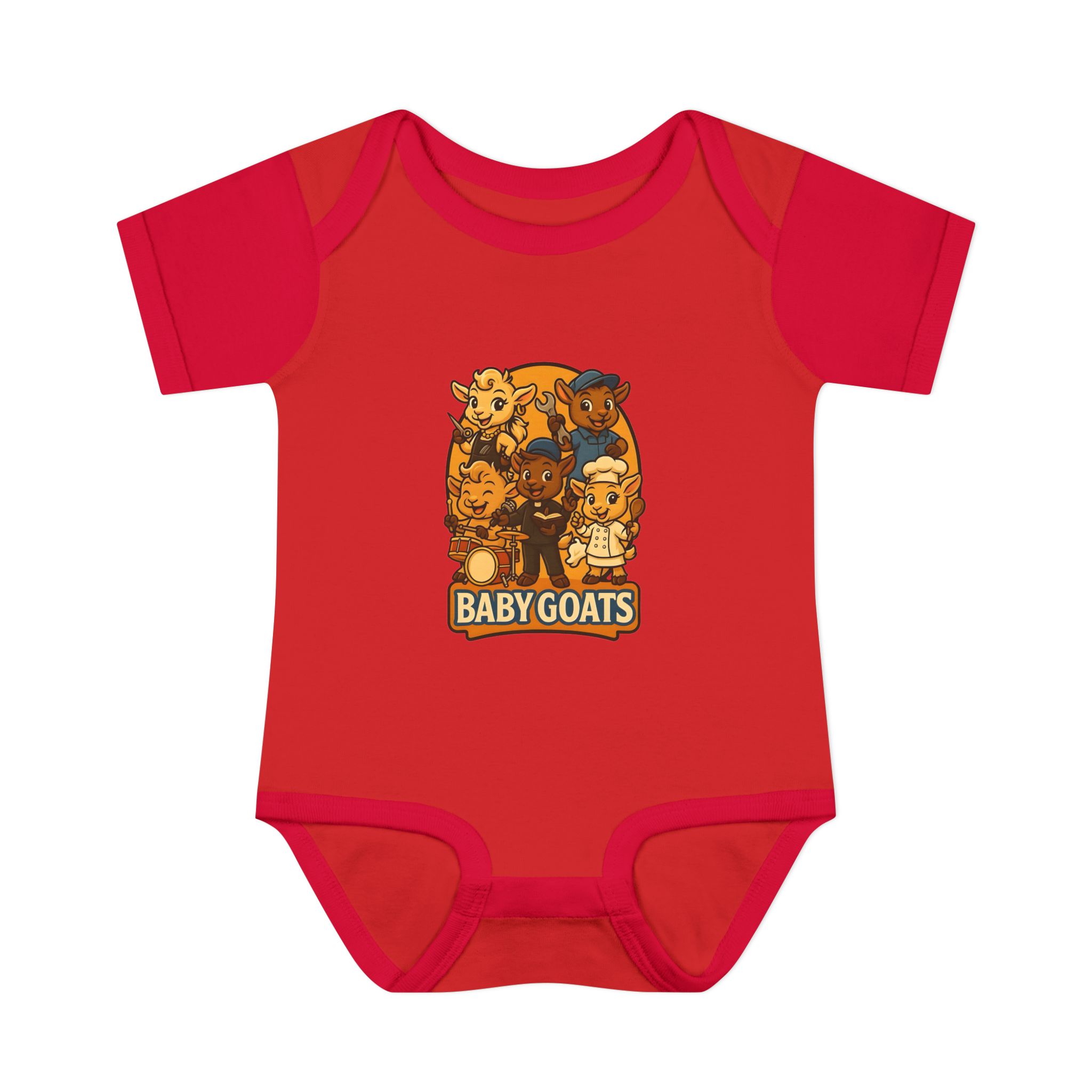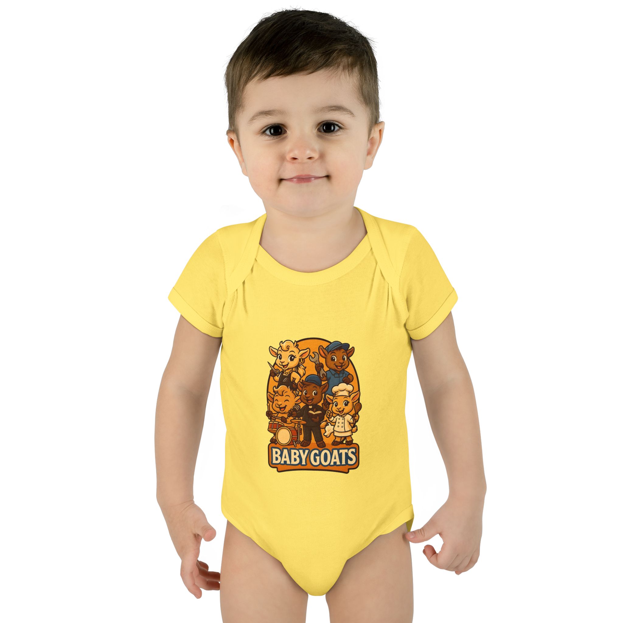 Soft, lightweight baby bodysuit featuring an adorable “Baby Goats” illustration in warm autumn tones. The comfortable rib knit and lap shoulders make quick changes gentle on tiny heads and wiggly arms. Thoughtful details—like a three-snap closure, double-needle ribbed binding, and tear-away label—keep the suit smooth against delicate skin while holding its shape through washes. The playful goat characters bring a cozy, storybook feel to everyday wear, whether for quiet mornings at home or lively family visits.