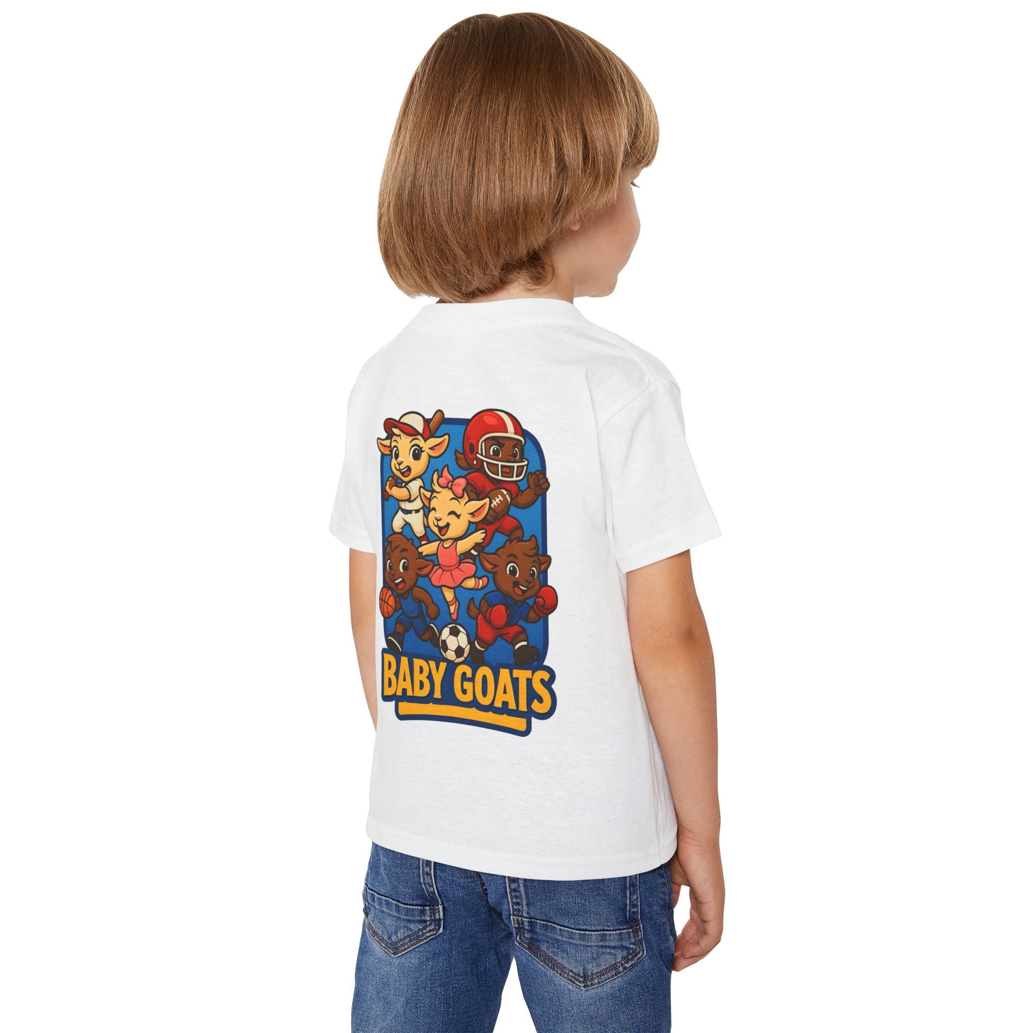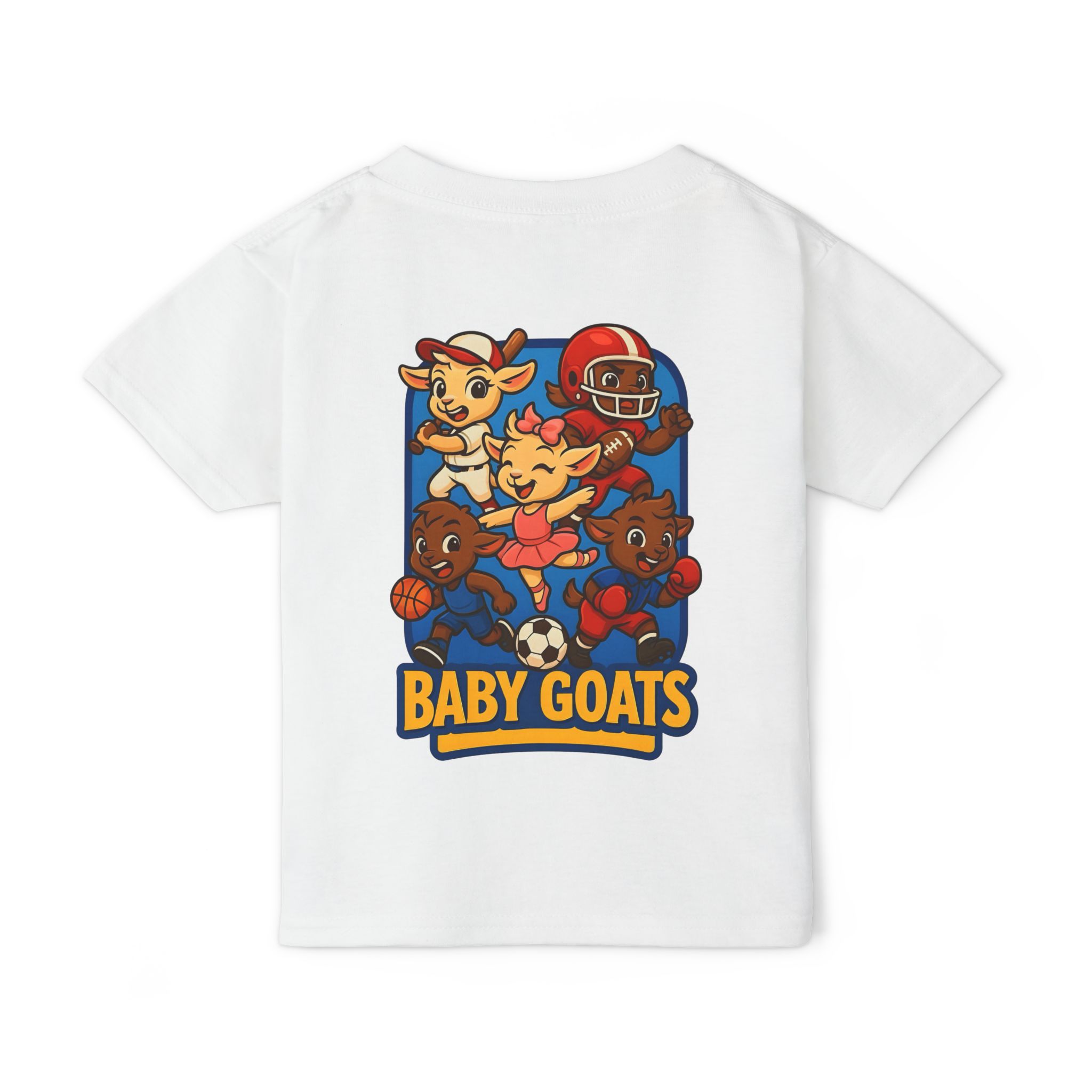 Bright, playful, and full of energy — this toddler tee brings little athletes together. A colorful cartoon of four baby goats playing soccer, basketball, and football sits on a soft white shirt, turning everyday play into a tiny team moment. The medium-weight cotton feels sturdy yet comfortable for active kids, while the ribbed collar and side seams keep the tee shaped through rough-and-tumble days and frequent washes. Lightweight enough for layering under a jacket, and simple enough to pair with shorts or joggers, this shirt captures backyard games and playground victories in one cheerful print.
