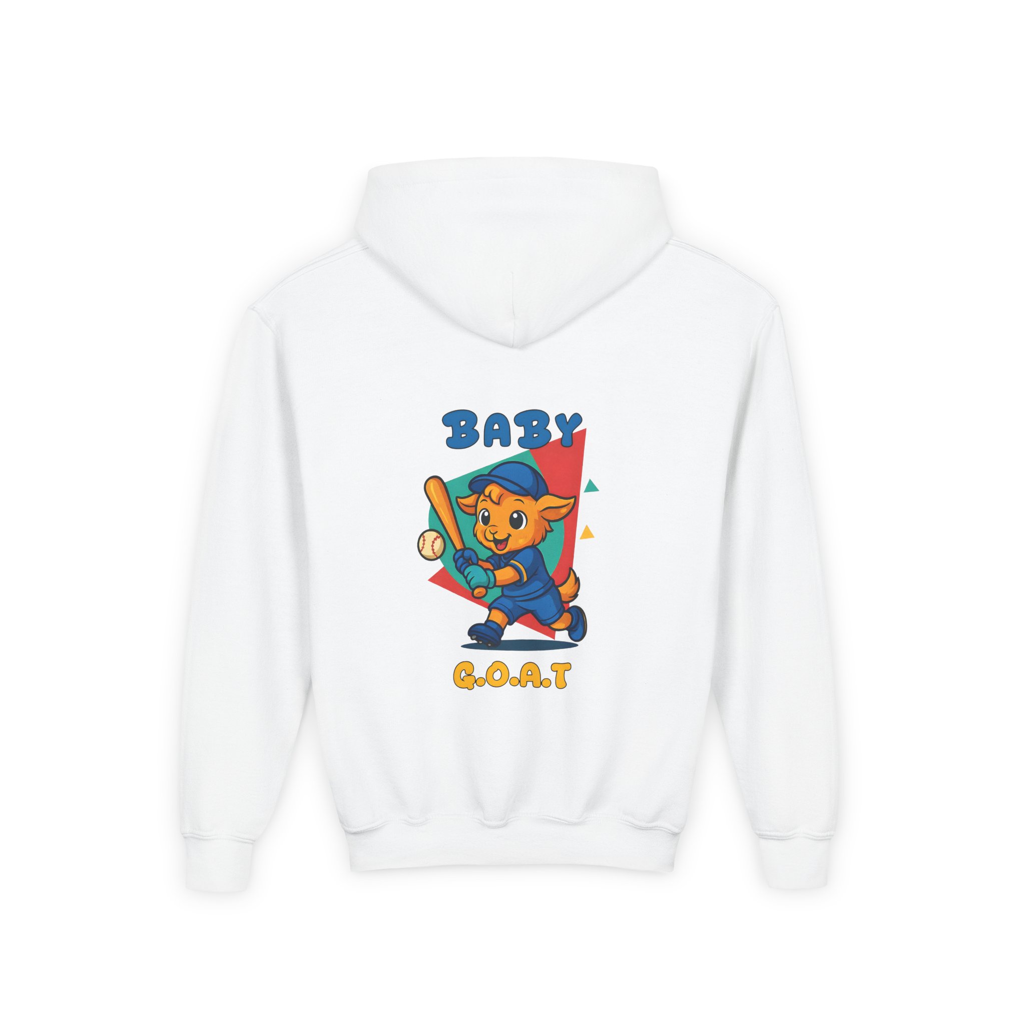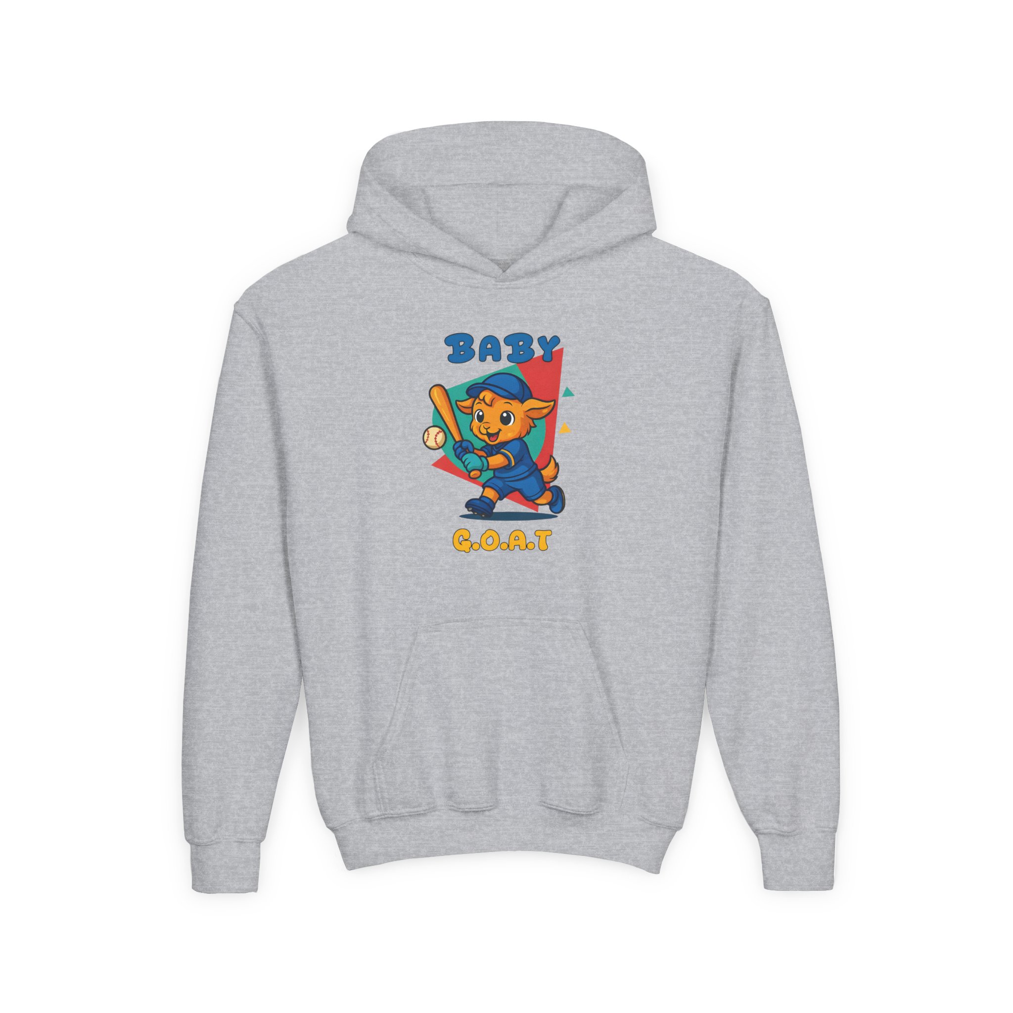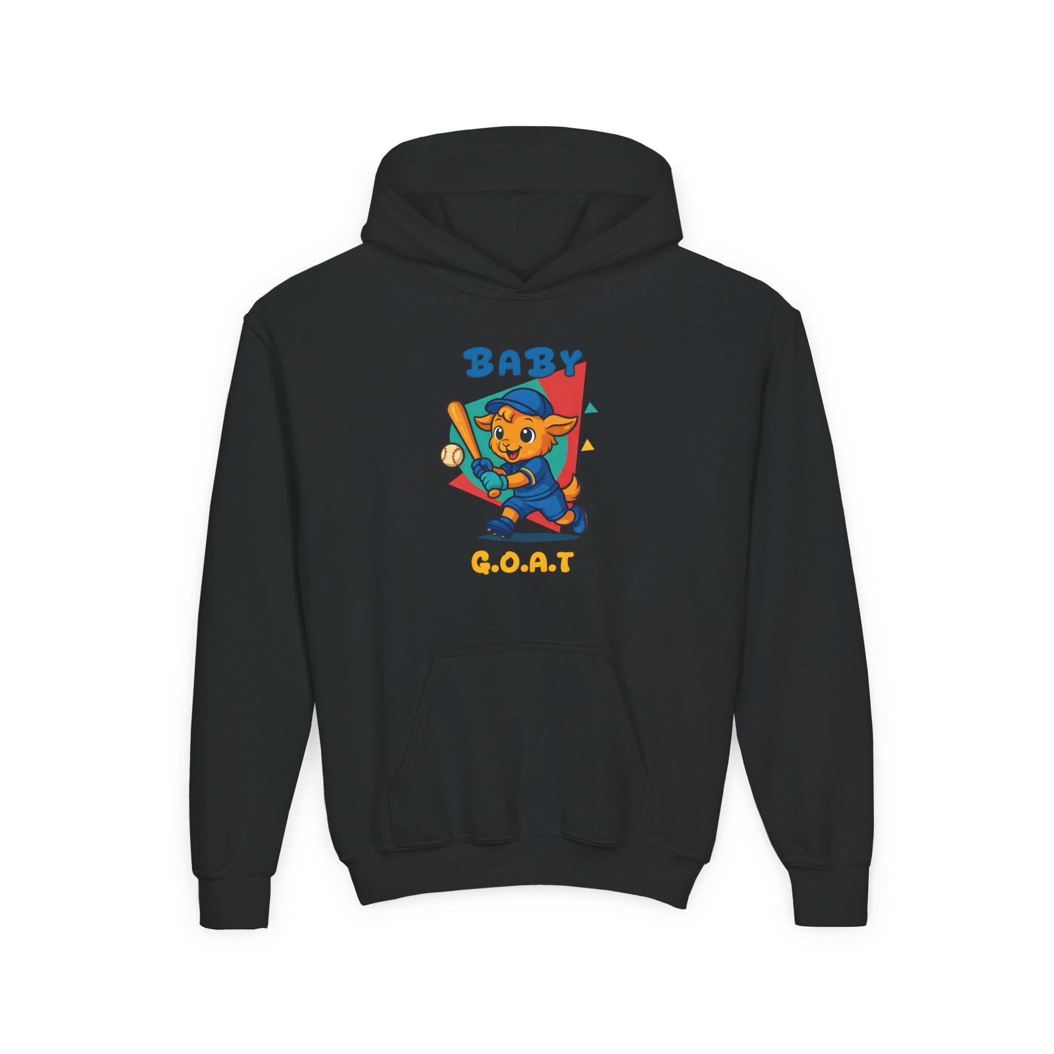 Soft, cozy youth hoodie with a playful ‘Baby G.O.A.T.’ mascot printed on the chest and back. The design shows a confident, cartoon goat in bright, upbeat colors—baseball bat in paw and a retro geometric backdrop—giving the sweatshirt a fun, sporty vibe kids will love. The mid-weight fabric keeps kids warm at the park or on the walk home from school, while the kangaroo pocket and roomy hood add practical comfort. Stitching and neck twill tape reinforce wear points so it holds up to everyday play. Available with embroidered chest placement on request for a subtler, textured look.