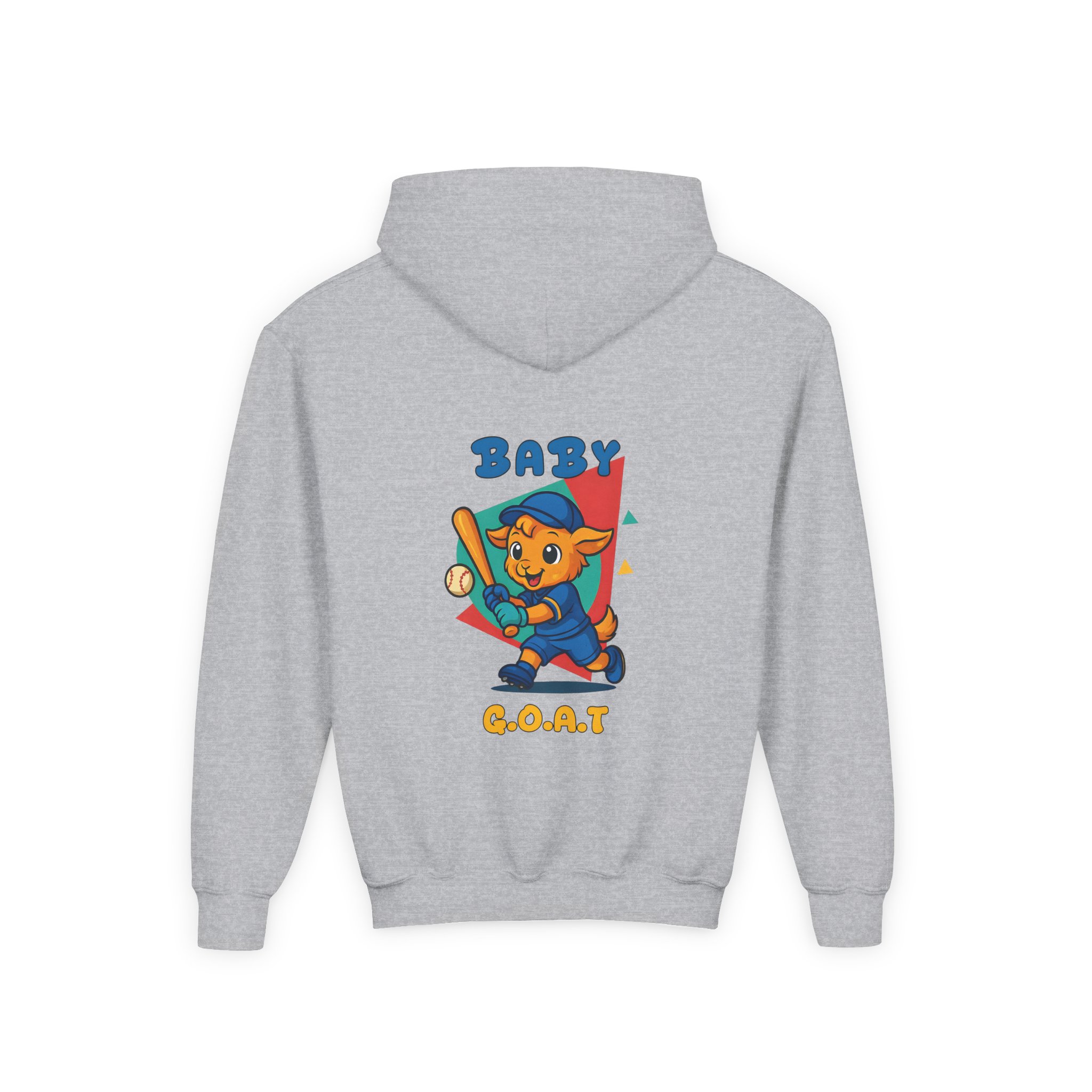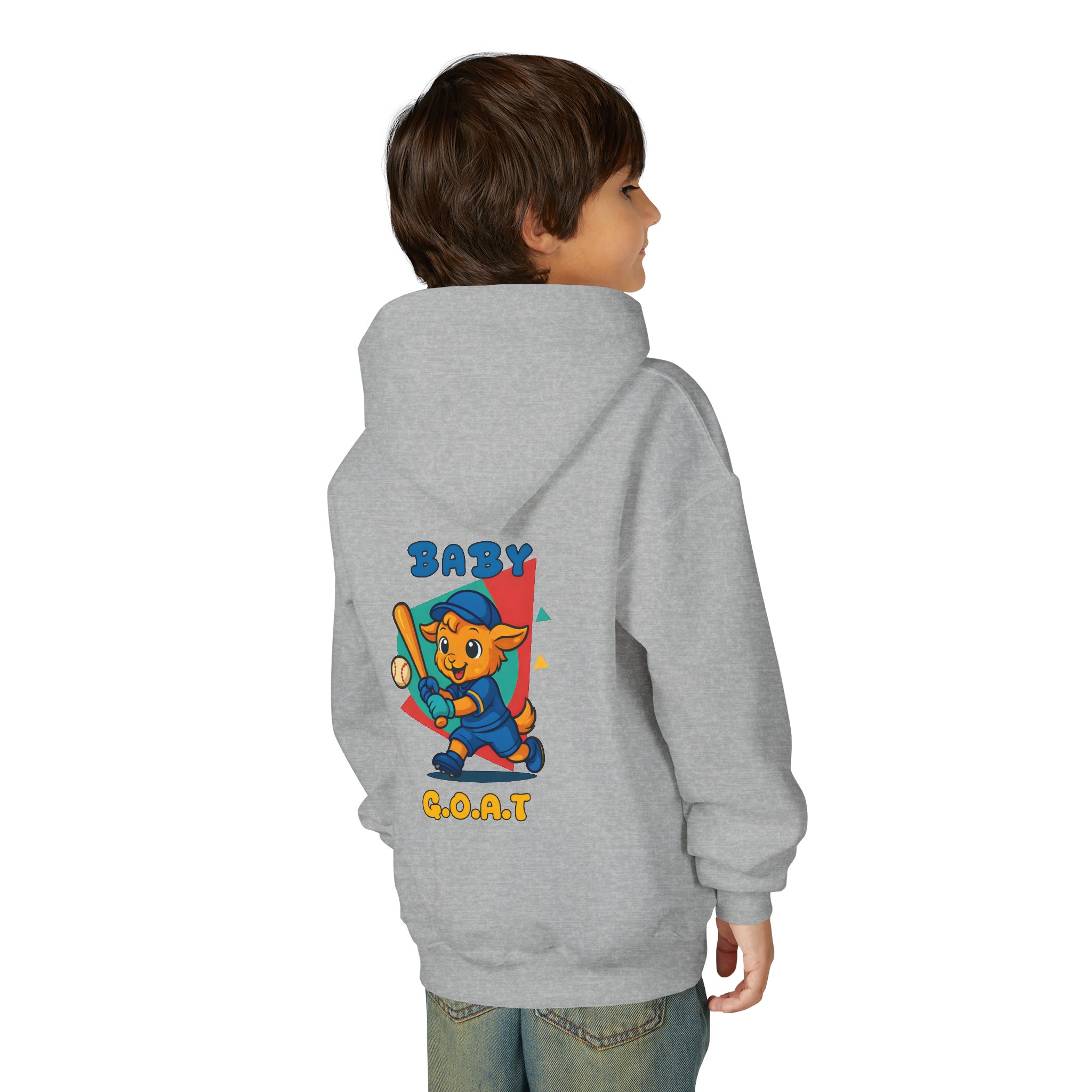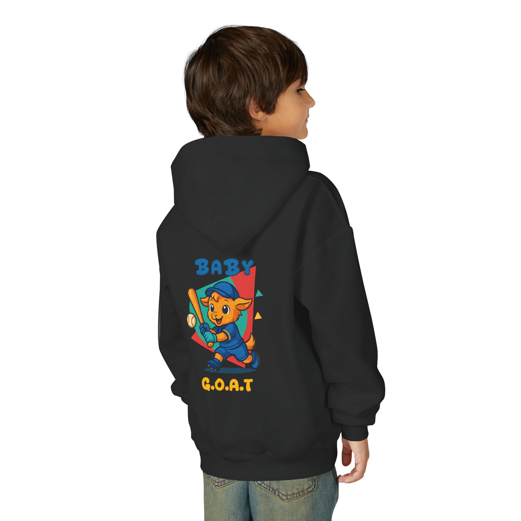 Soft, cozy youth hoodie with a playful ‘Baby G.O.A.T.’ mascot printed on the chest and back. The design shows a confident, cartoon goat in bright, upbeat colors—baseball bat in paw and a retro geometric backdrop—giving the sweatshirt a fun, sporty vibe kids will love. The mid-weight fabric keeps kids warm at the park or on the walk home from school, while the kangaroo pocket and roomy hood add practical comfort. Stitching and neck twill tape reinforce wear points so it holds up to everyday play. Available with embroidered chest placement on request for a subtler, textured look.