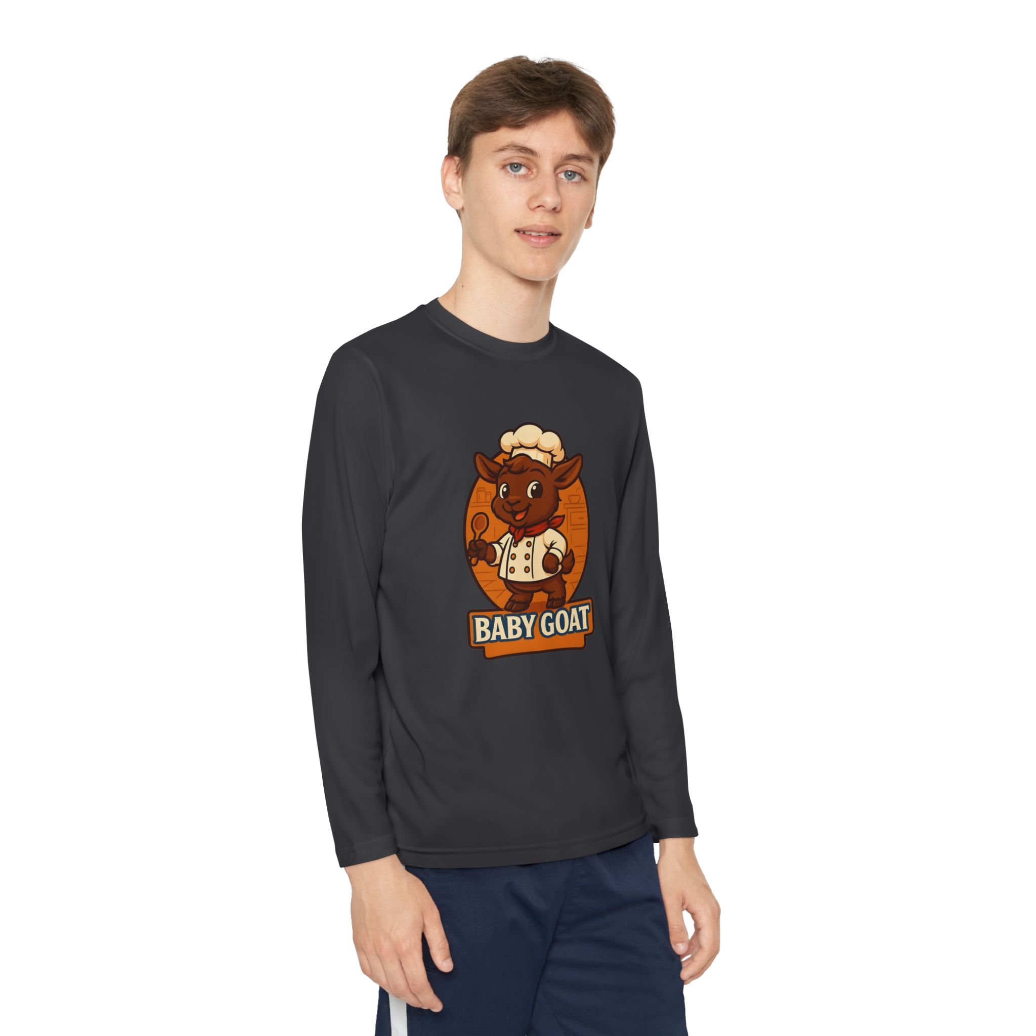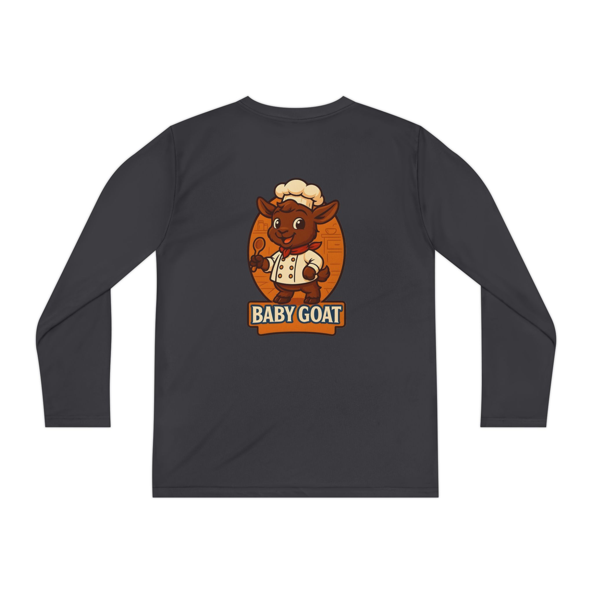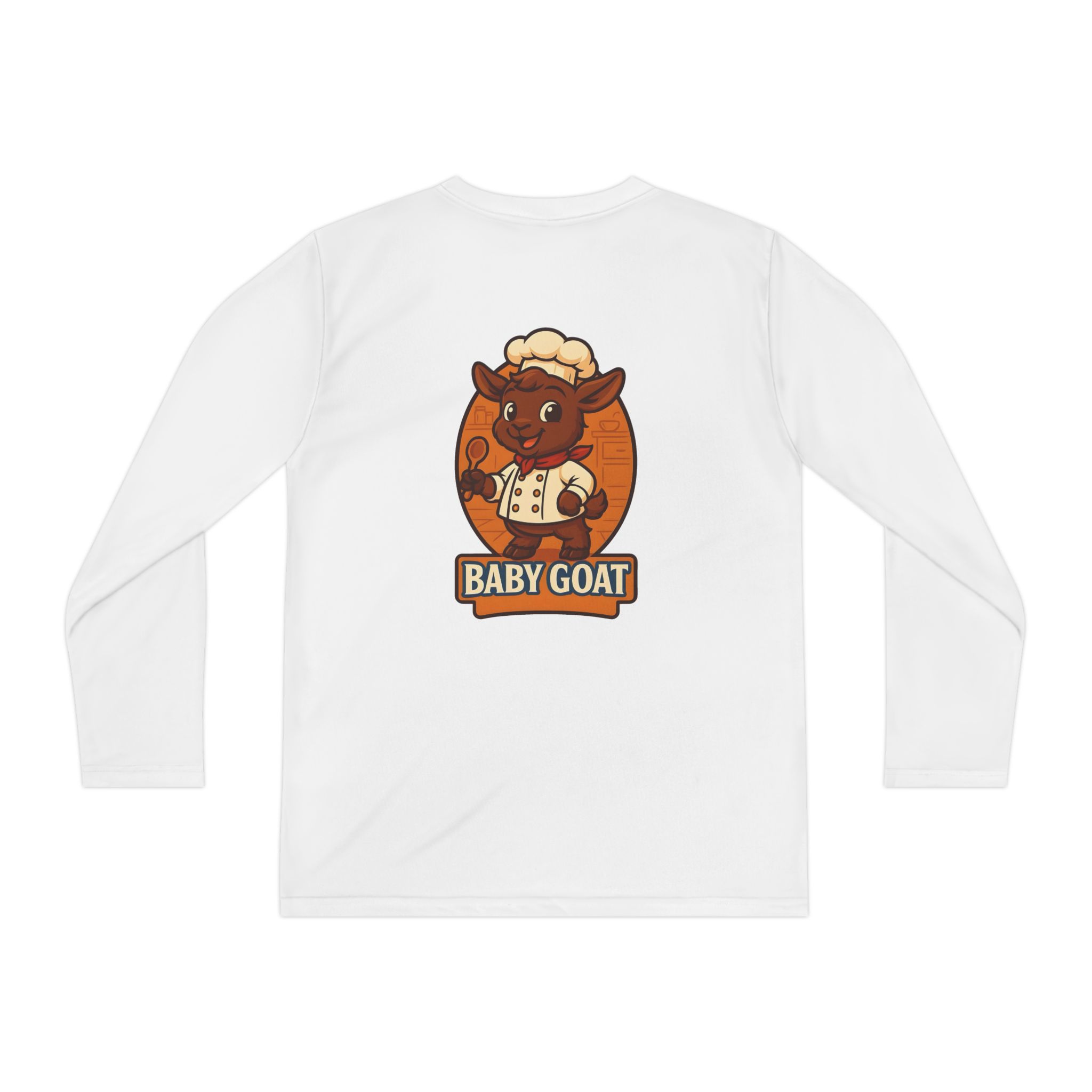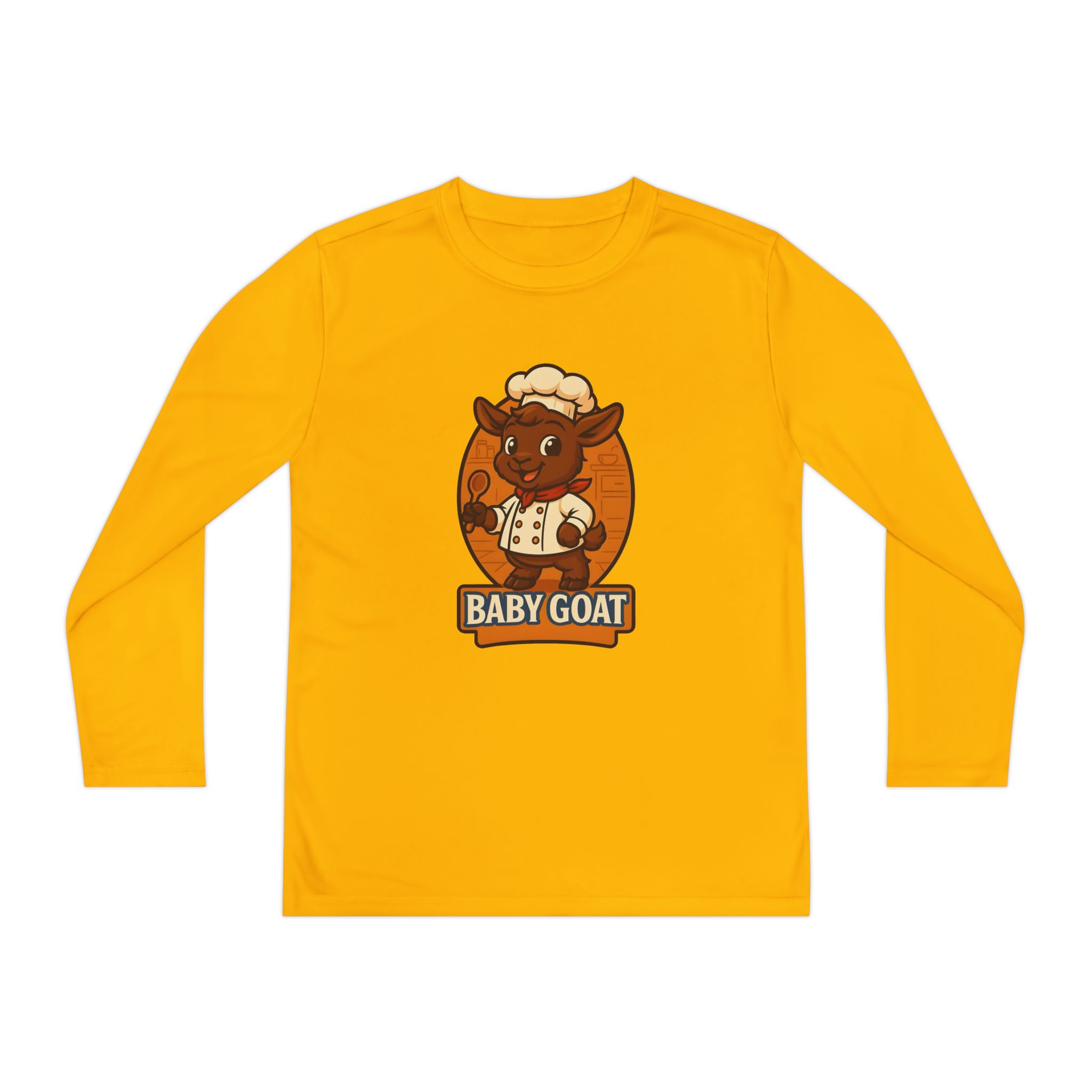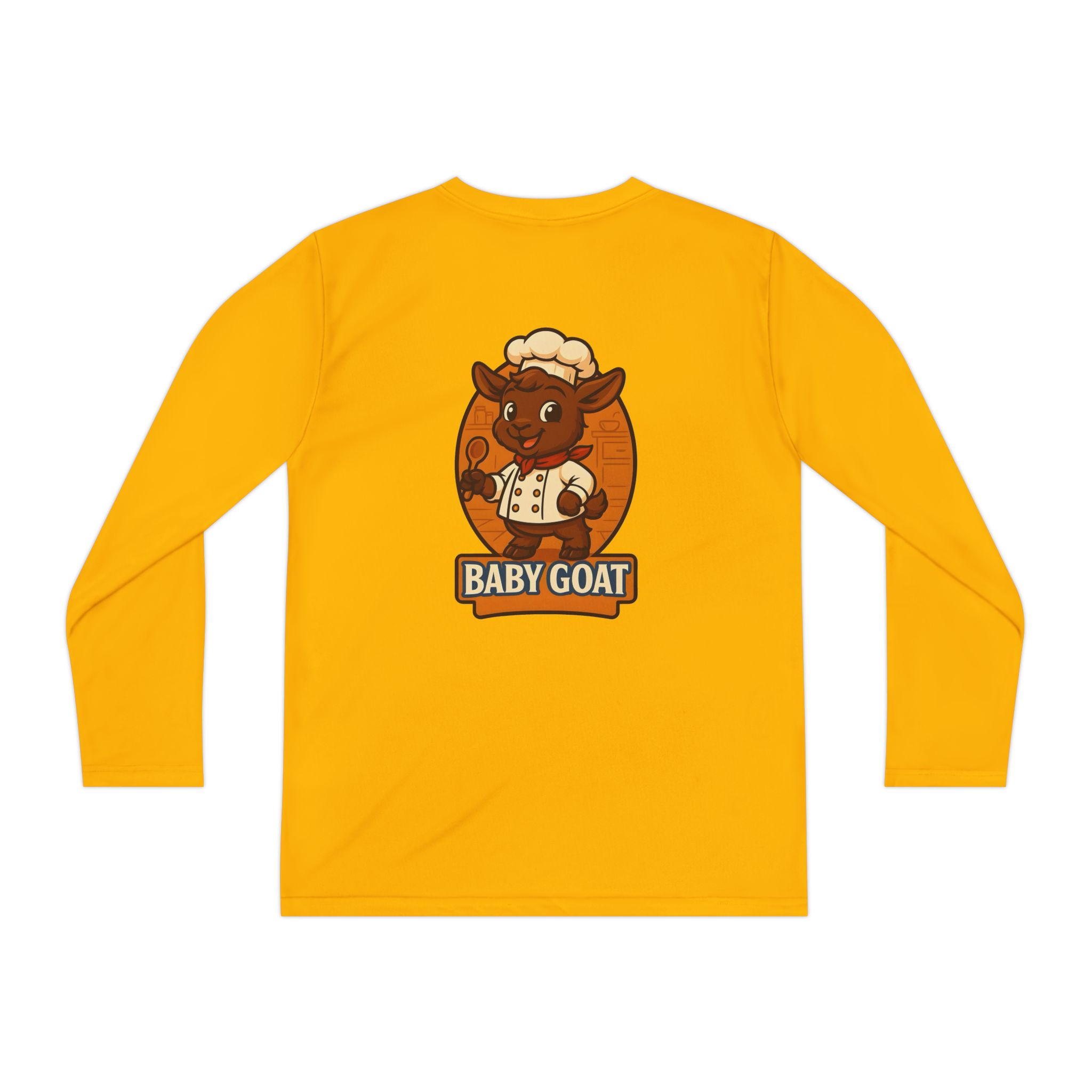 Soft, lightweight long sleeve built for active kids who love to play hard and look good doing it. The athletic cut moves with their body while moisture-wicking polyester keeps them cool and dry during practice, playground races, or weekend adventures. A playful “baby goat” mascot in warm autumn tones is applied with direct-to-film printing for sharp detail and lasting color. Breathable, quick-dry fabric and a tear-away label keep comfort front and center so they can focus on fun.