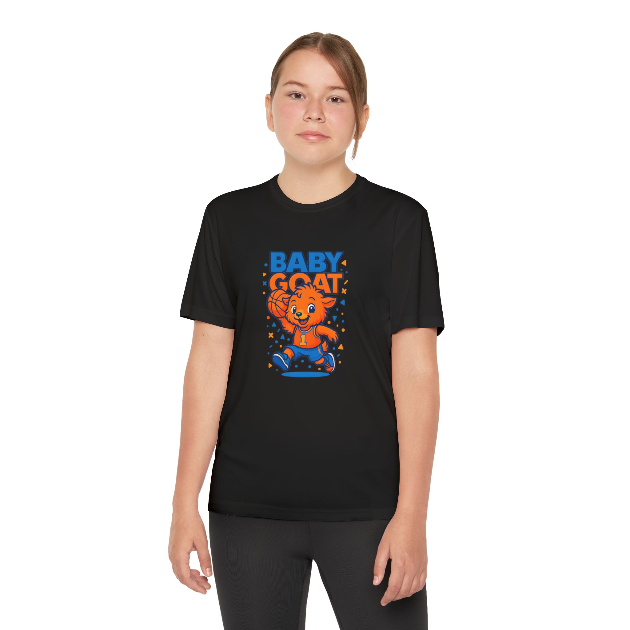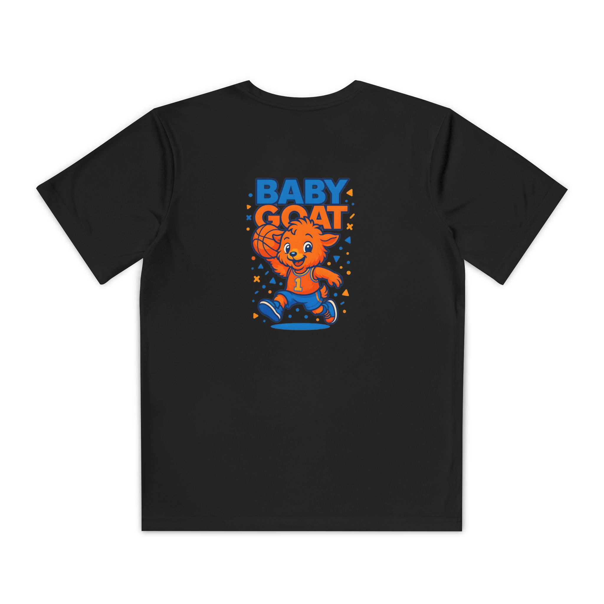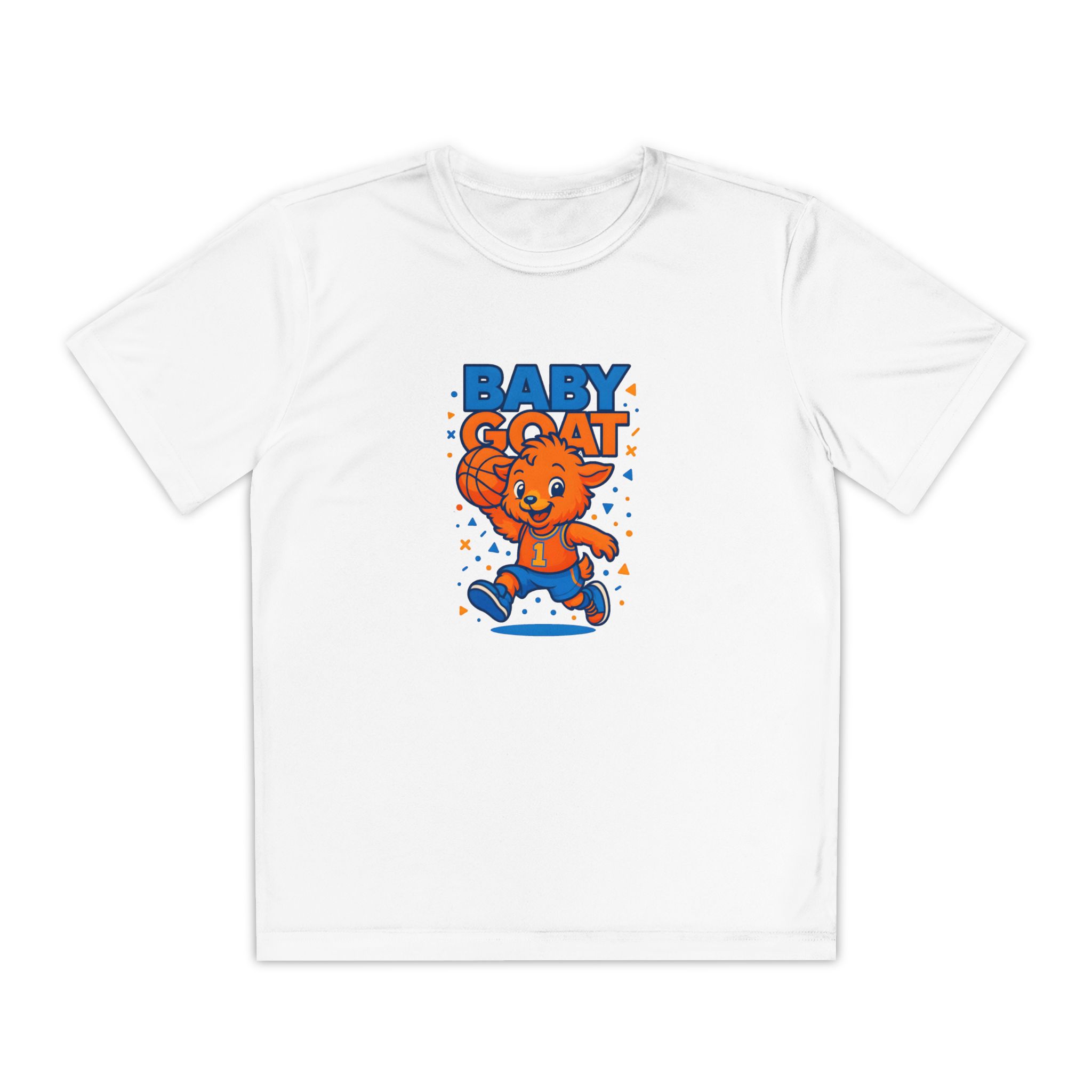 This lightweight athletic tee brings playful energy to every move. The center artwork shows a cheerful baby goat mid-leap, surrounded by confetti-like accents and bold “BABY GOAT” lettering in bright blues and oranges. Breathable, moisture-wicking polyester keeps young athletes cool during practice, warm-ups, or backyard play. The athletic cut and extra-light fabric feel barely there, while the DTF print stays vibrant wash after wash. Tear-away label prevents irritation so kids stay focused on the fun — whether they’re training, competing, or just being energetic.